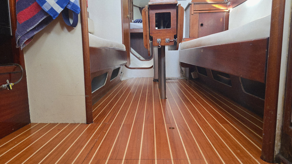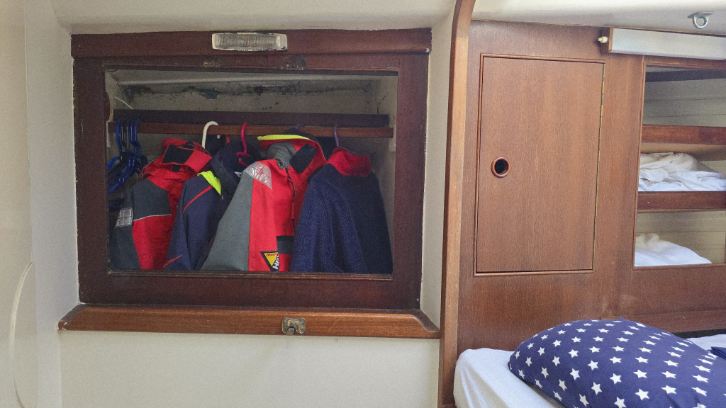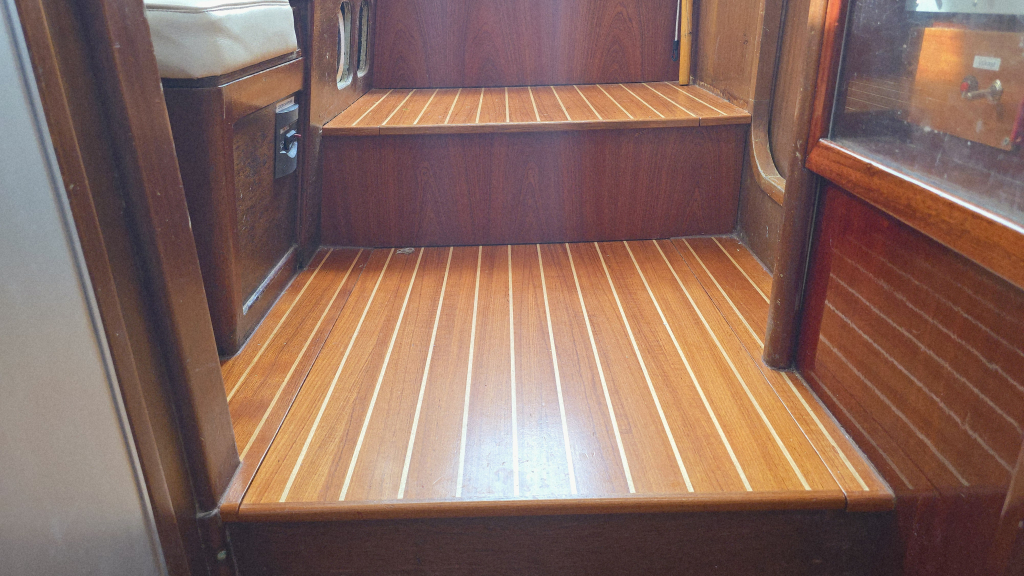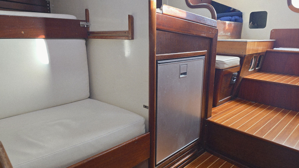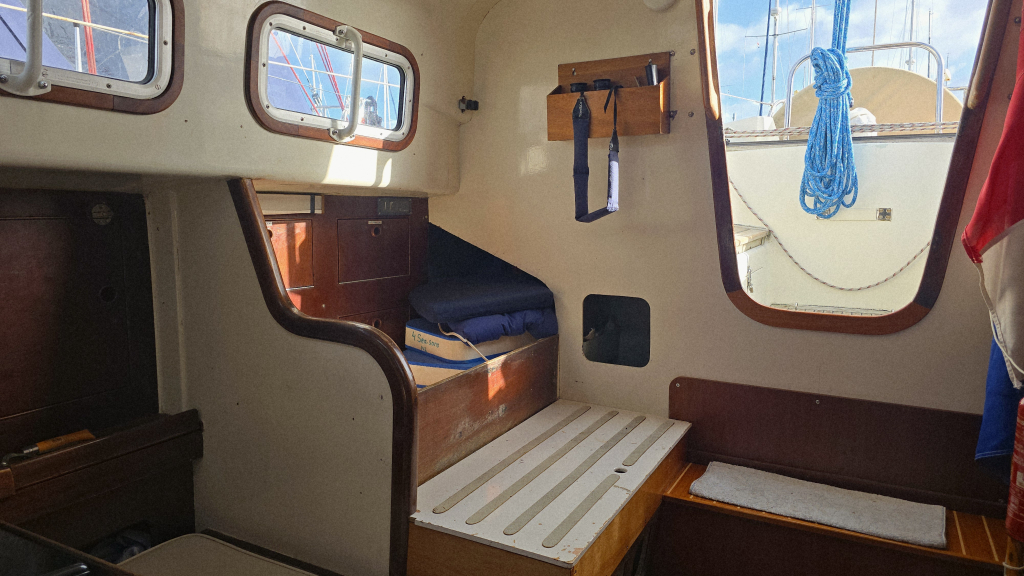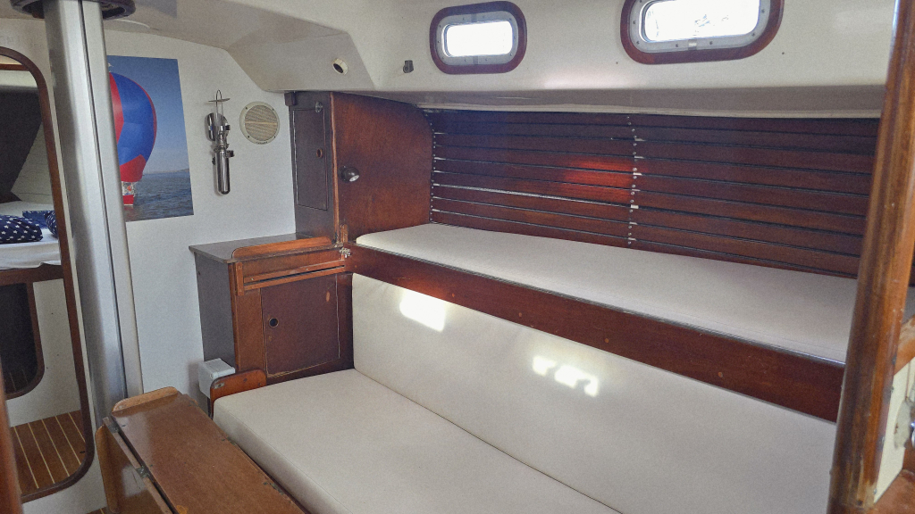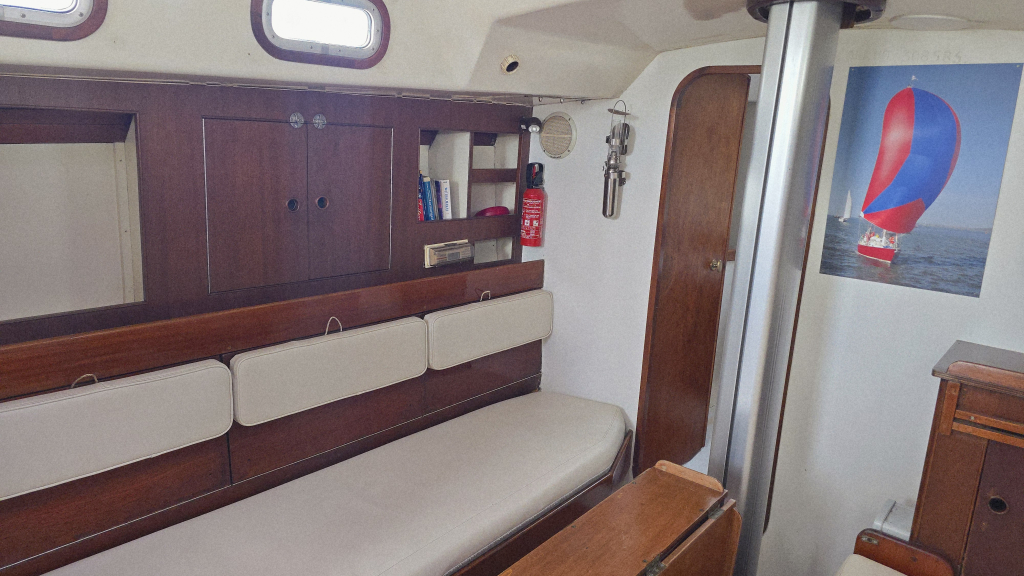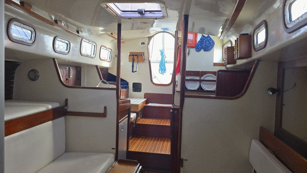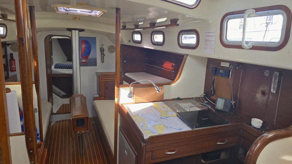 Het interieur heeft een klassieke indeling met aan stuurboord de navigatiehoek en hondenkooi annex berging met als saillant detail direct een berging voor het reddingsvlot naast de kajuitingang.