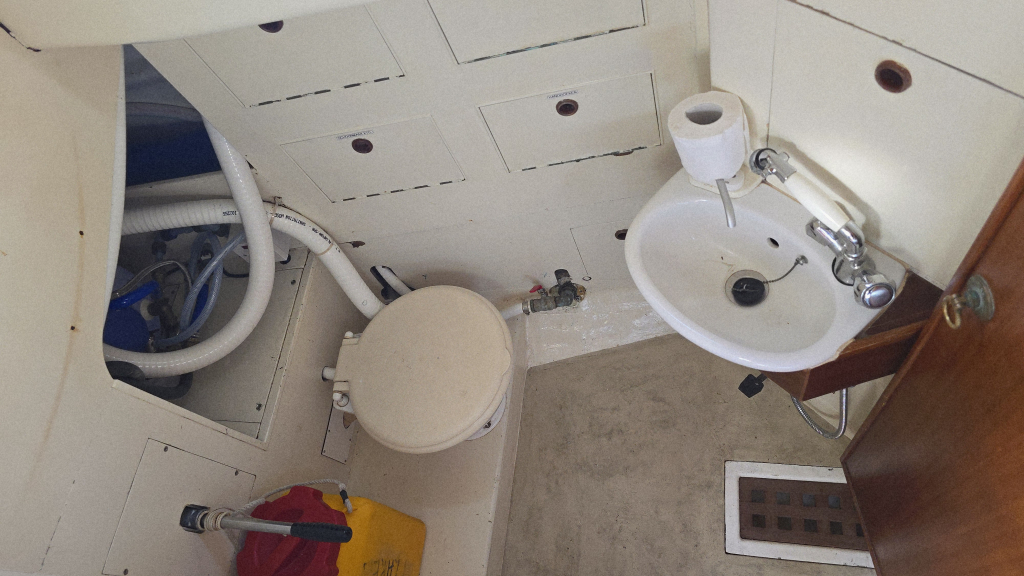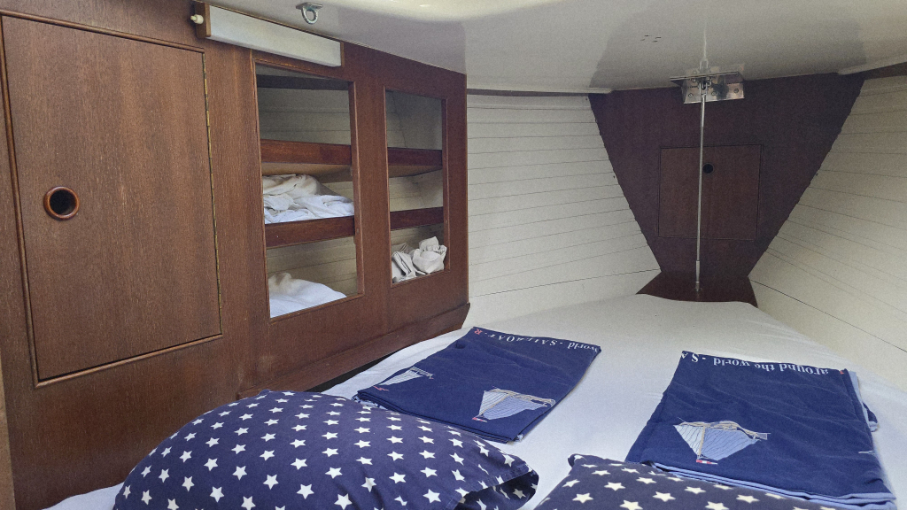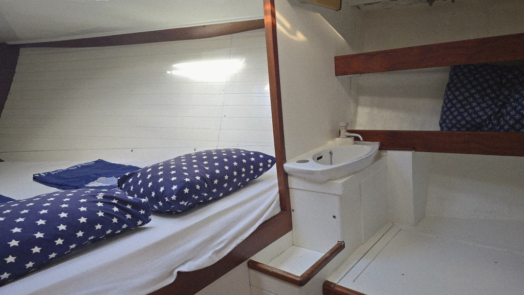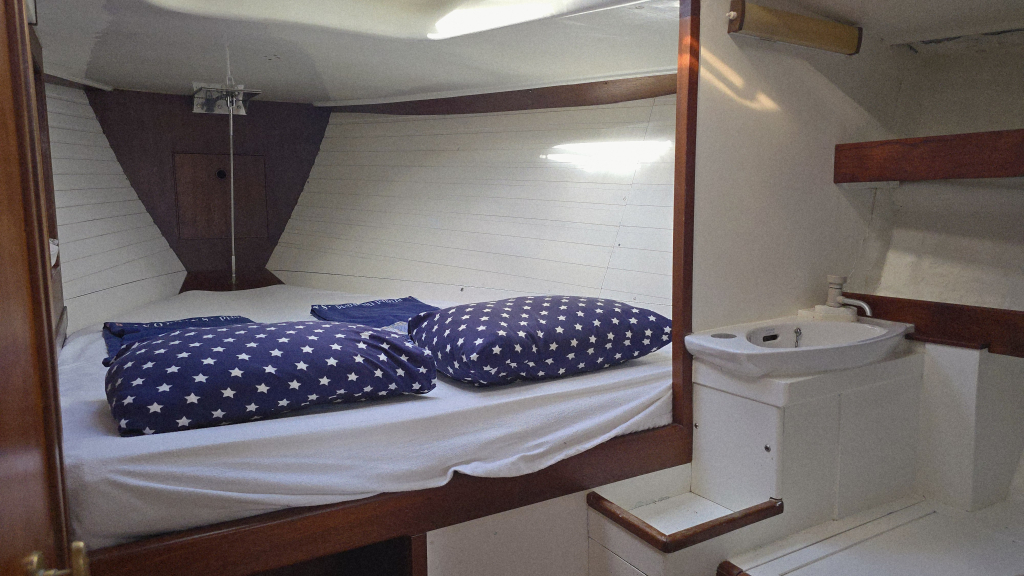 In de boeg is een dubbel V-bed met open kastruimte en voorheen een extra 2e toilet welke is verwijderd. De afvoeren zijn nog aanwezig om deze terug te plaatsen, ook is hier een ruime hangkast voor zeilkleding.