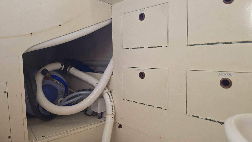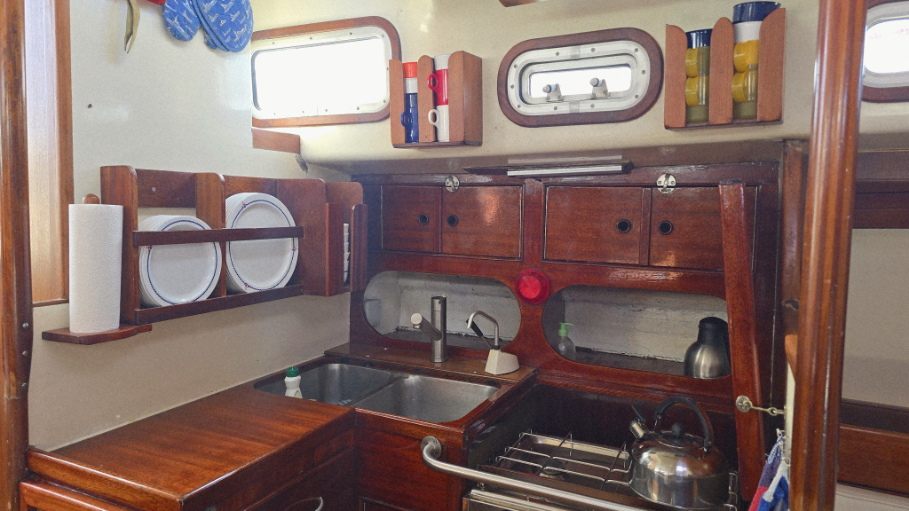 Aan bakboordzijde is toegang tot de natte cel en tevens het ruime kombuis met stromend w/k water en cardanisch fornuis.