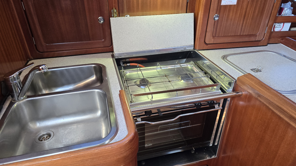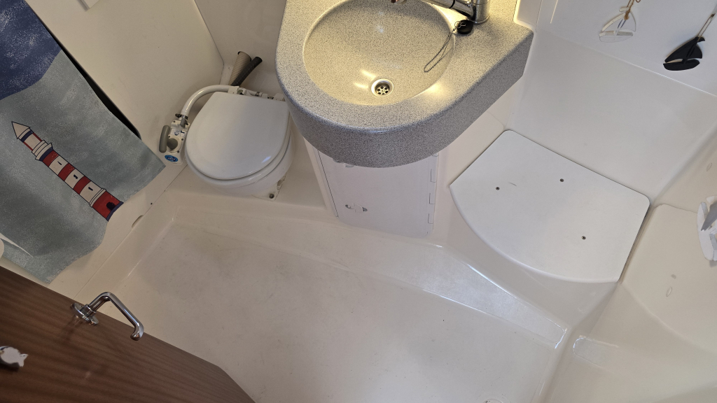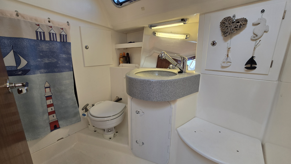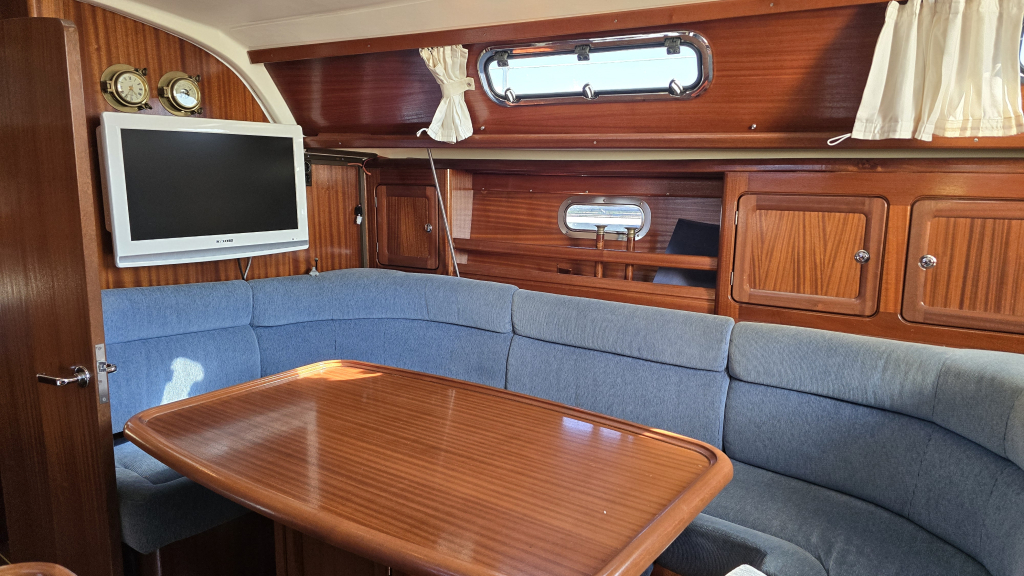 Aan stuurboord is de navigatiehoek met zit en voldoende werkblad voor een 1800-serie kaart. De U-vormige zit heeft bergruimte onder de banken en schapruimte tussen de 2 kasten. Door de patrijspoort in de romp is nog gezellig naar buiten te kijken.