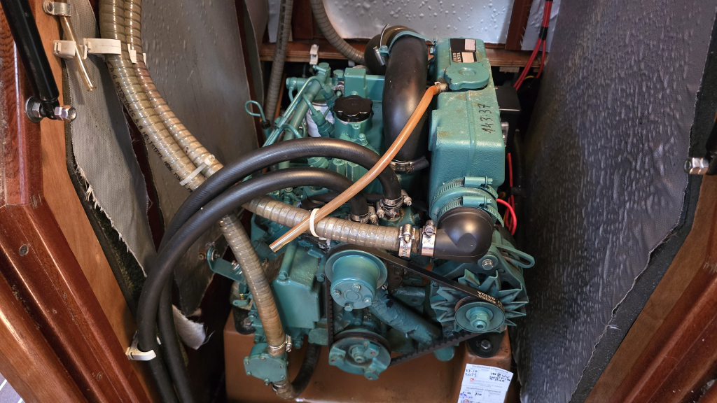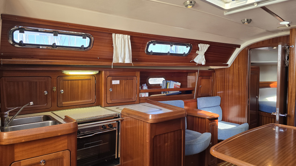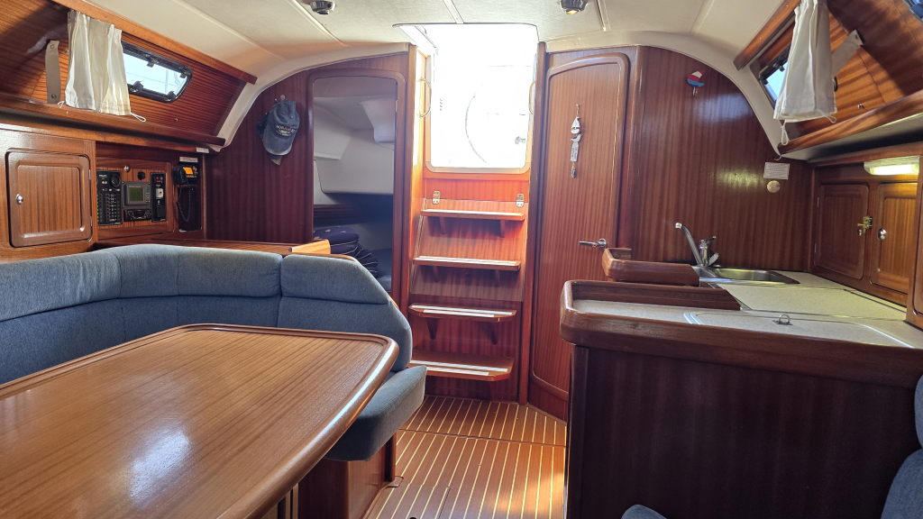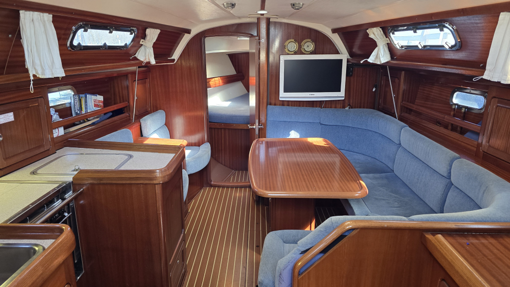 Het interieur is warm door het vele mahonie houtwerk met een slimme indeling. Aan bakboord bevindt zich een royale natte cel en in de lengte geplaatste kombuis. Door de U-vorm is er een flinke bovenlader koelbox en diepe kastruimte.