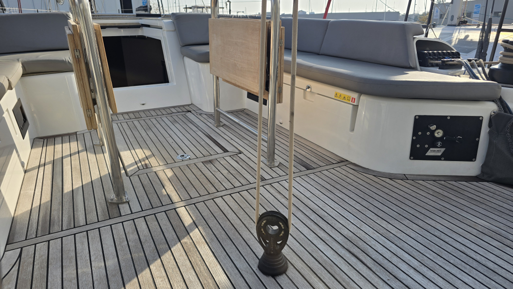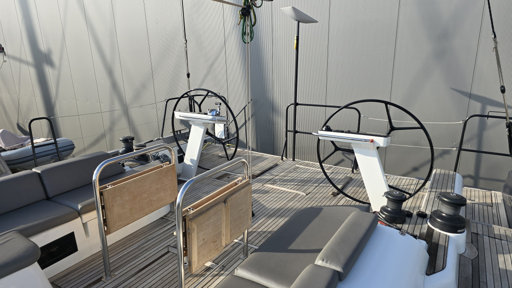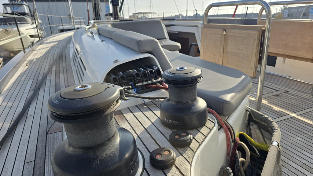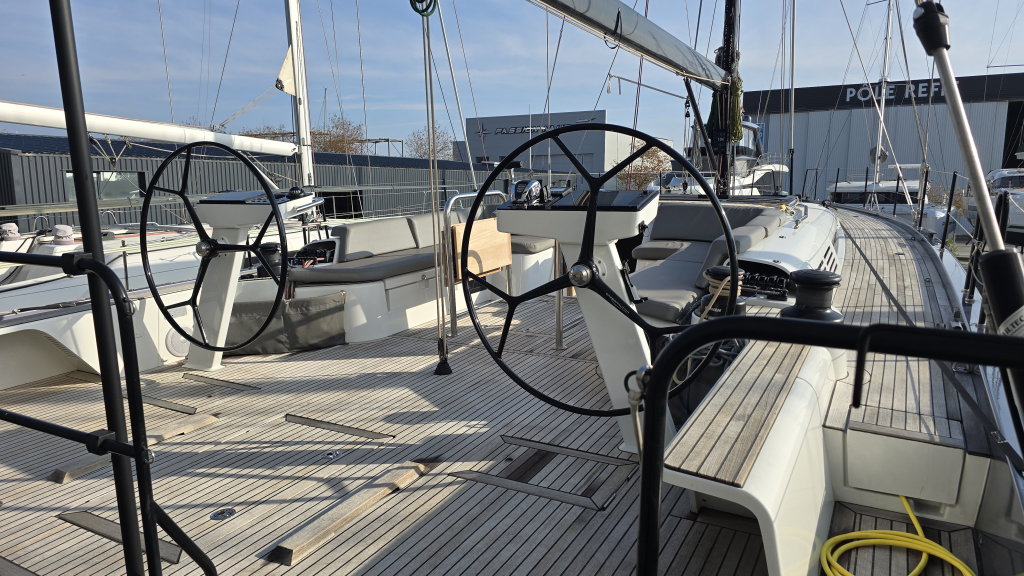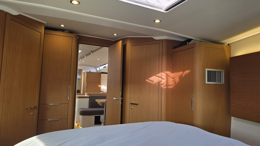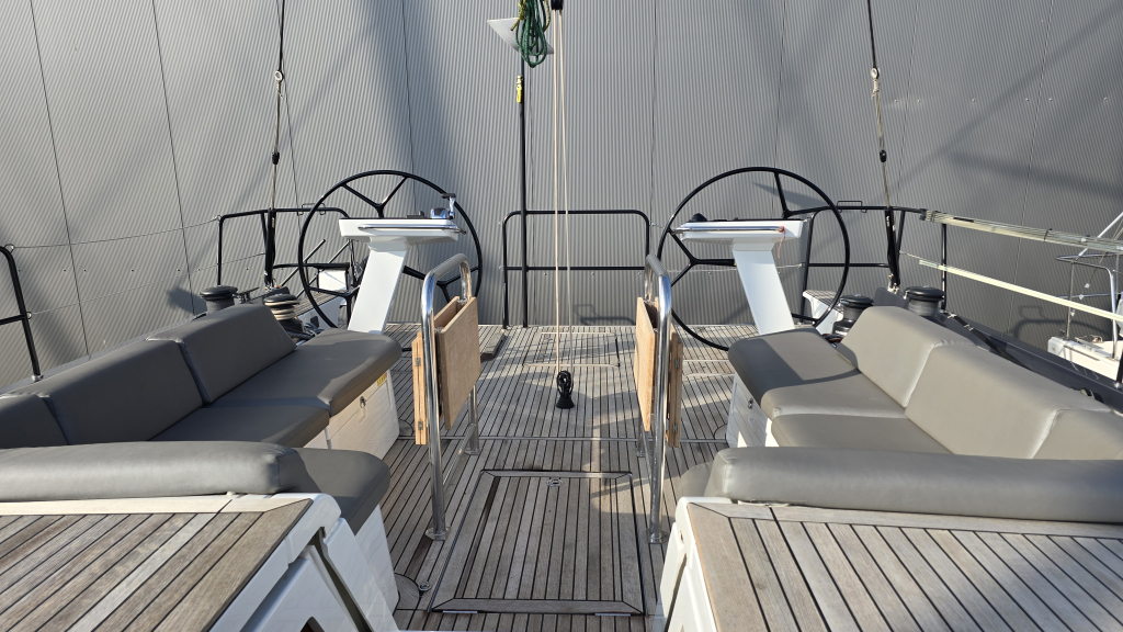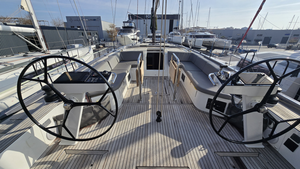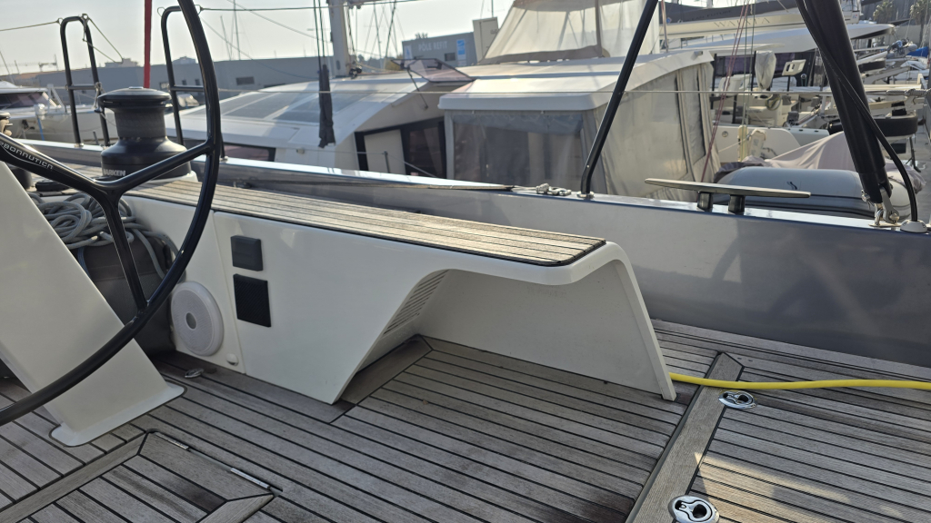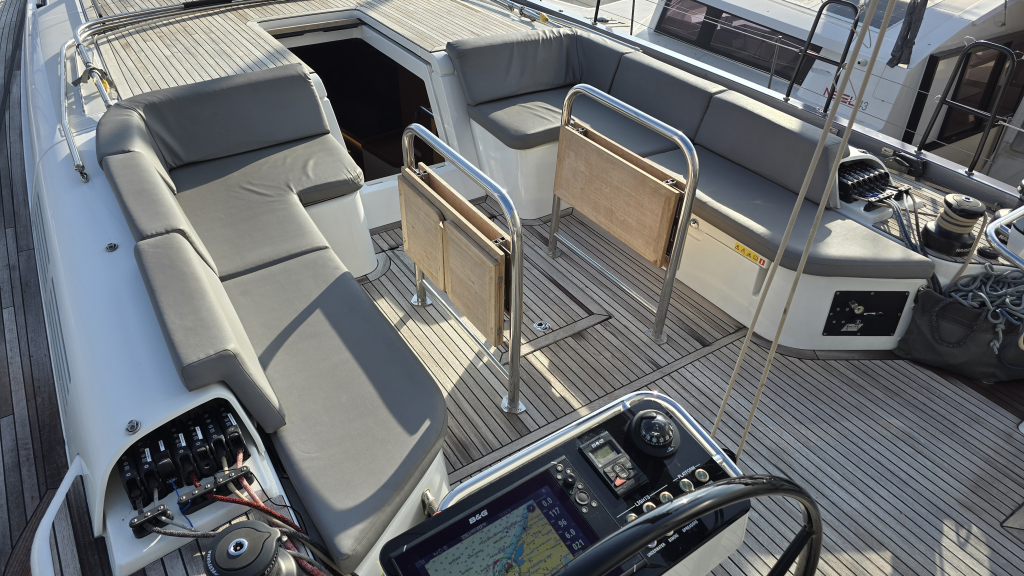 Her cockpit is spacious due to her wide transom of 5 meters, with a clear overview for the helmsman and all sheets within reach, due the electric winches and furling mainsail, she is very comfortable to sail. In the tighter marina's docking made easy with the powerful 110Hp engine (upgrade then standard) and the Bow thruster & Stern thruster.