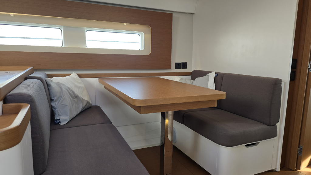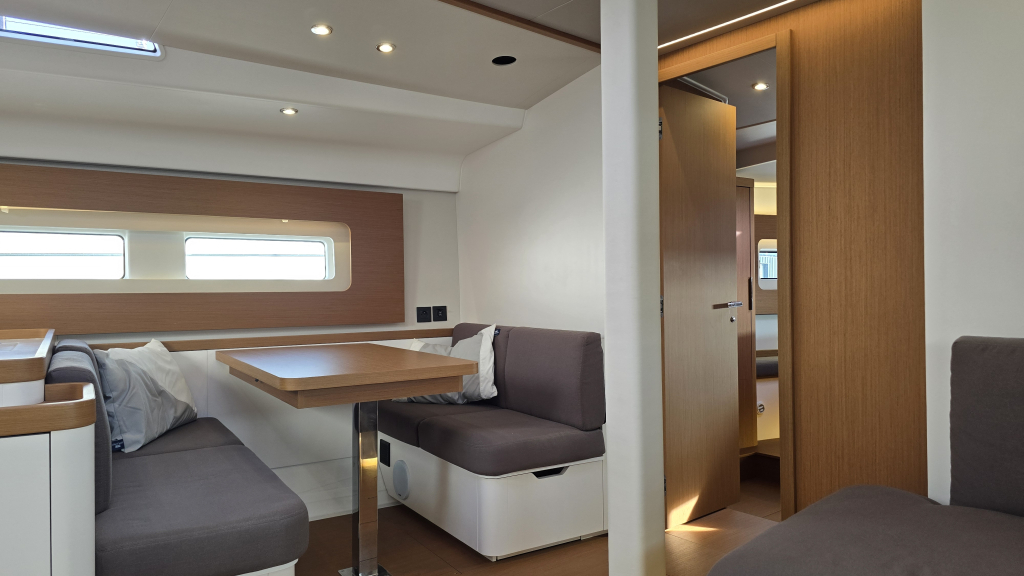 On starboard we have the "lounge" sofa with side table and on Port the U-shaped sofa and saloon table.