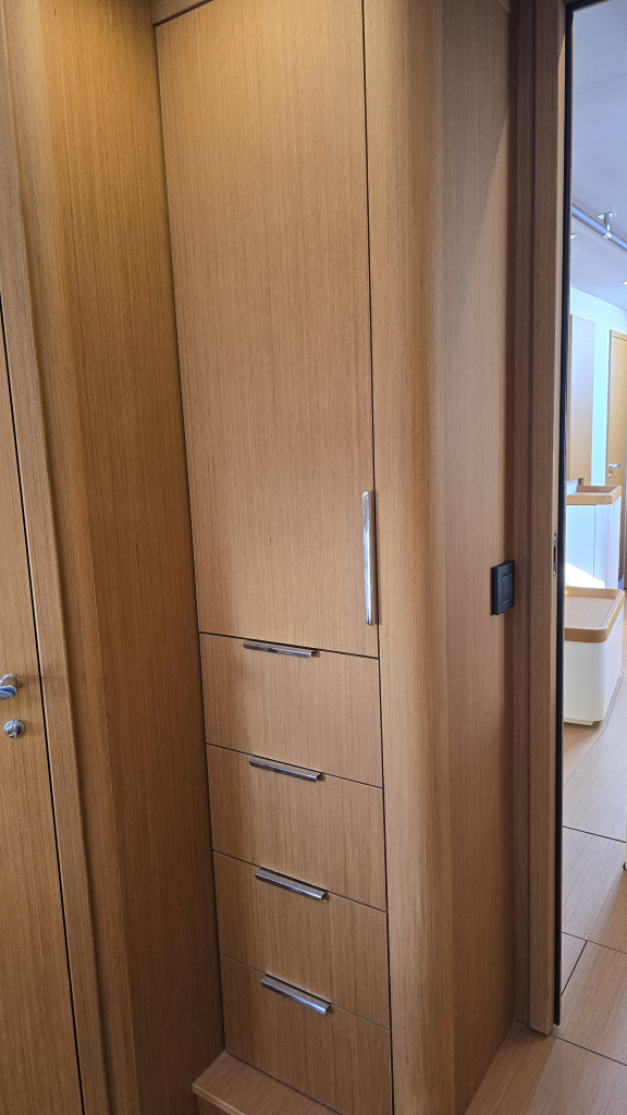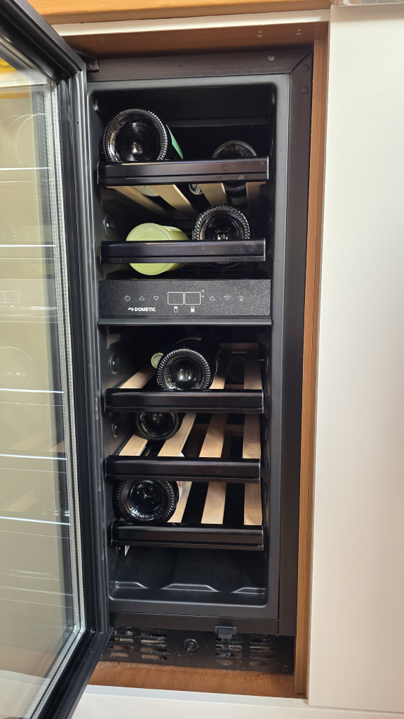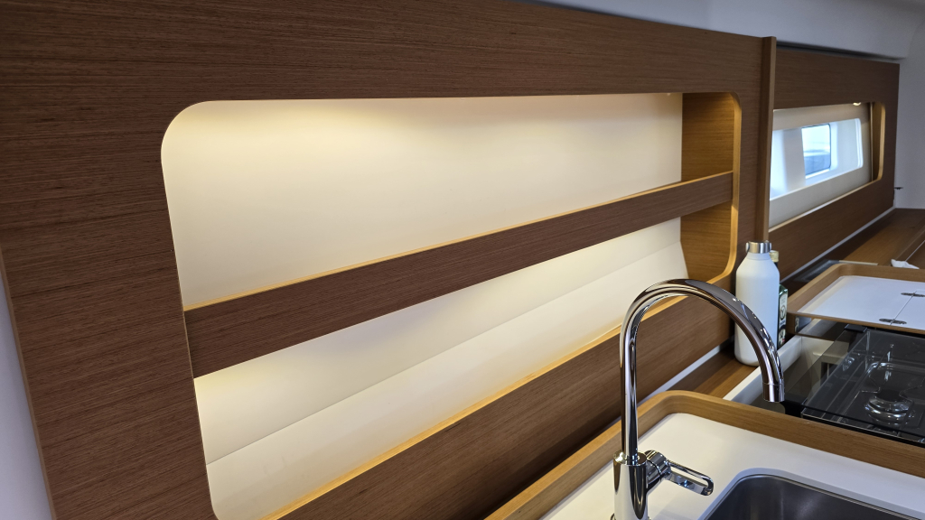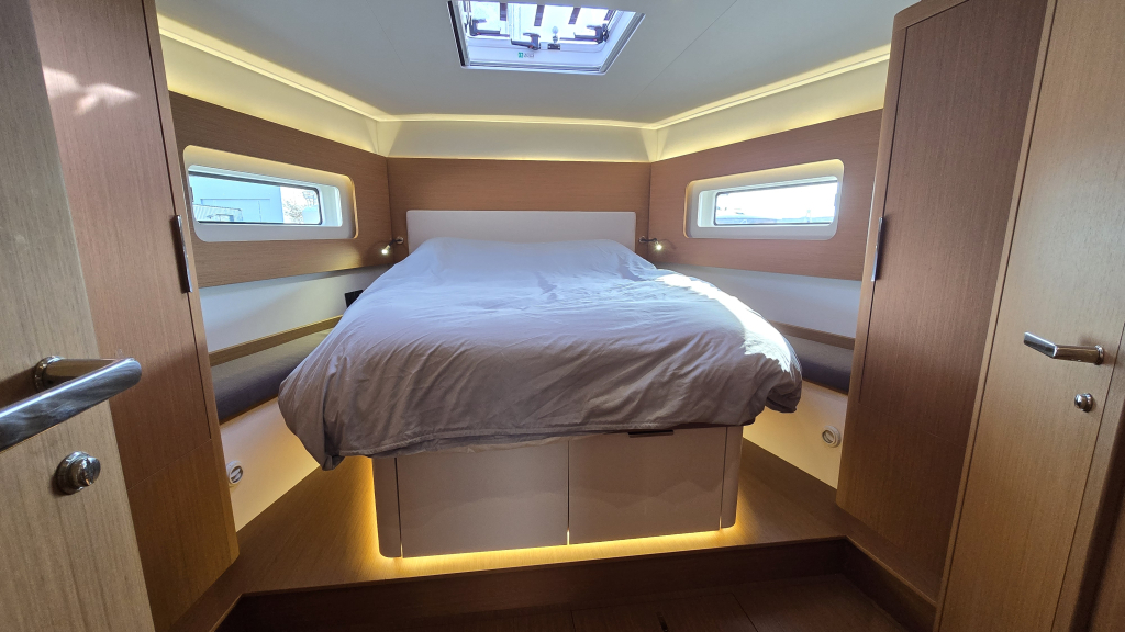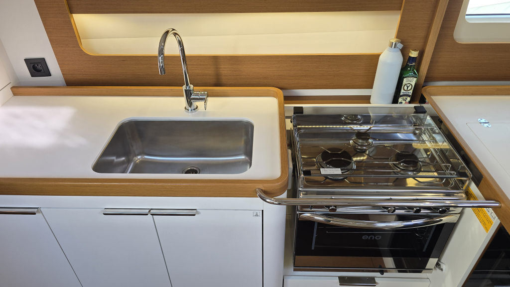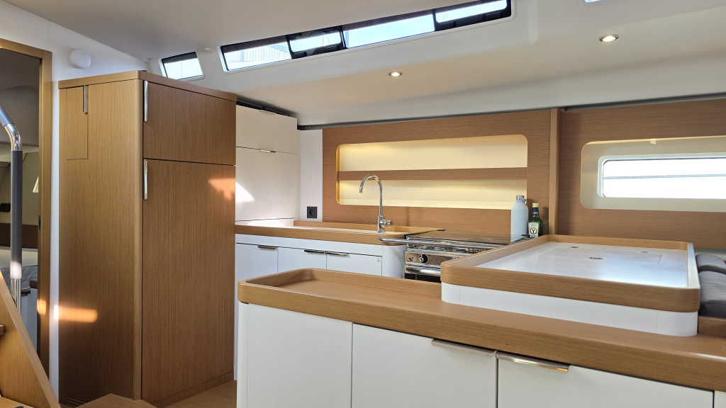 The interior is bright and airy (headroom 1.98m) with a great lay-out, the L-shaped galley (headroom 1.99m) on Port with lots of storage space and luxury from home such as a electric stove&grill, various fridges and even a wine fridge.