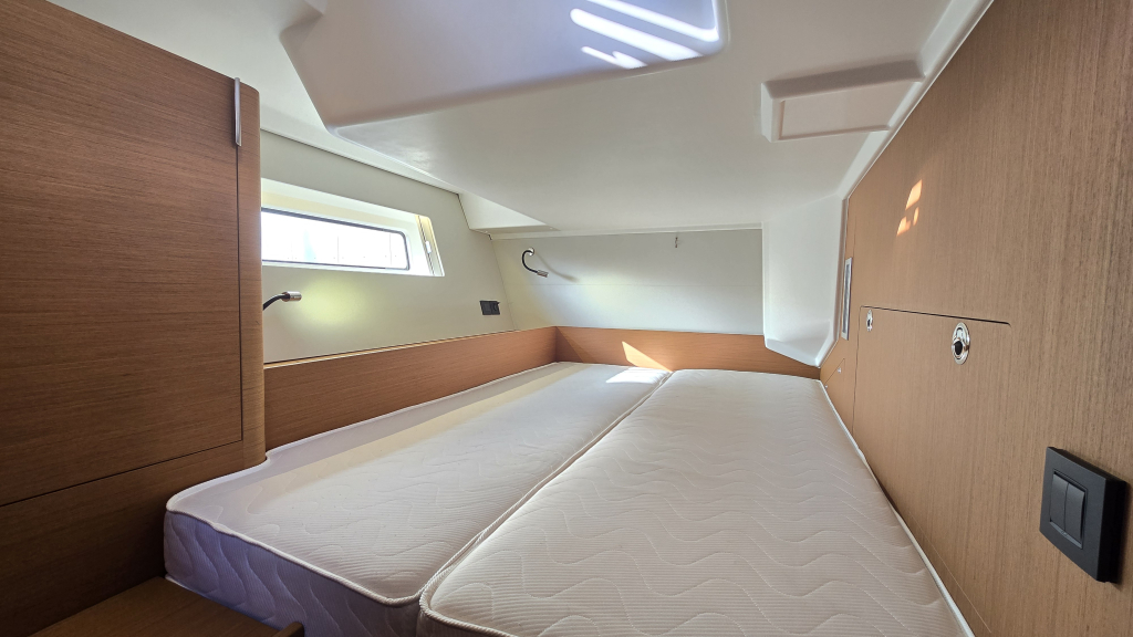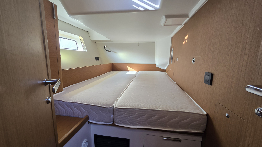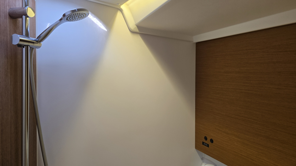 In the Aft of the ship are 2 double beds (1.40x2.05m) and a generous sized heads with shower (headroom 1.96m)