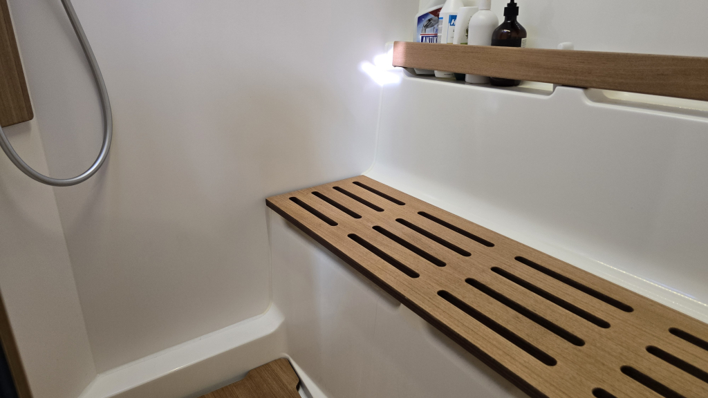 In the bow is the "owners-cabin"with a 1.60x2.05m wide double Island bed, plenty of storage and a private heads (headroom 1.91m) and seperate shower (headroom 1.95m)