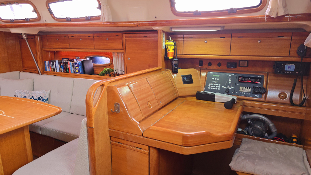 Het interieur is ruim van opzet met aan stuurboord de navigatiehoek met Simarine digitale display voor de tankmeters, accu meters en verbruik. Ook zit hier de bediening voor de Planar 4Kw dieselkachel met diverse uitgangen. De langkeuken is ruim met een forse bovenlader koelkast, 2-pits fornuis met oven en dubbele spoelbak, onder de korte bank is bergruimte voor bijvoorbeeld potten en pannen. Ook bevind zich hier de aparte toiletruimte en ruimte douche-mogelijkheid.