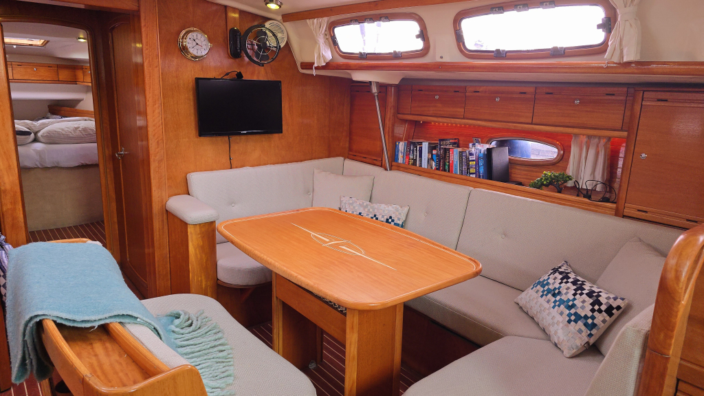 De U-vormige rondzit heeft een fijne zit dankzij de vernieuwde (2023) zitkussens en het fijne aan de Bavaria Cruiser zijn de vele kasten rondom het schip. Onder de banken is tevens bergruimte.