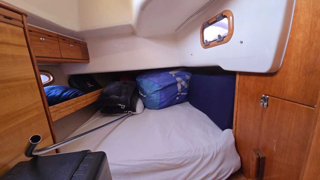 In de boeg is aan Bakboordzijde een stapelbed annex bergruimte, wat ook voor kleinere gezinnen erg prettig is voor bijvoorbeeld tassen, kuipkussens of de complete kuiptent op de bergen. Aan de andere zijde is de toiletruimte met douche. In de boeg is een dubbel V-bed met praktische kastruimte en (zeer veel) bergruimte onder het bed.