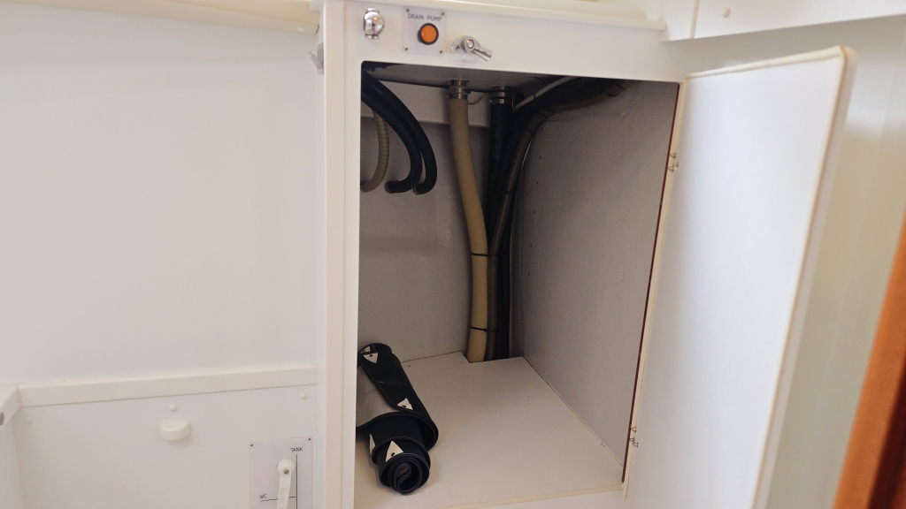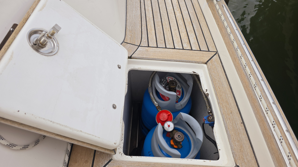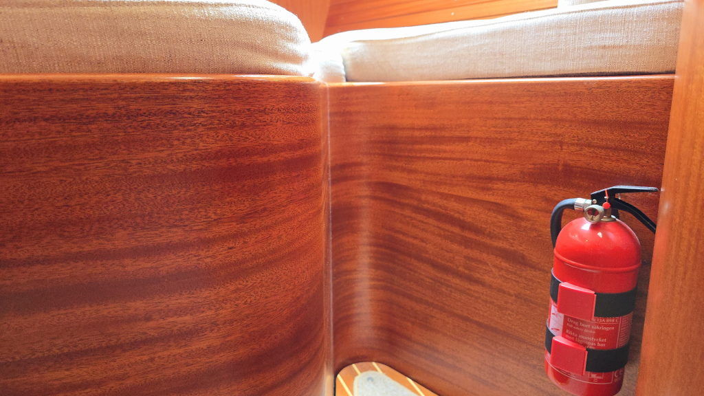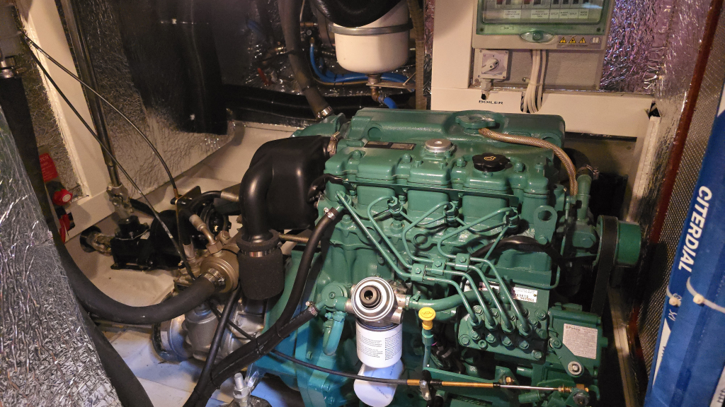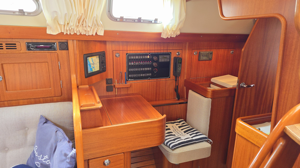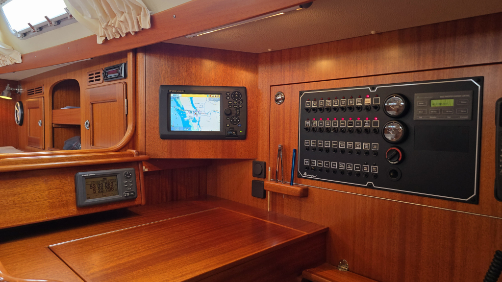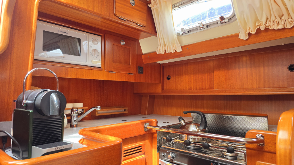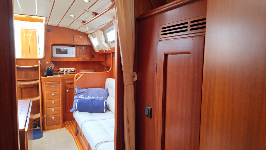 Het interieur is erg aangenaam met aan stuurboordzijde direct het U-vormige kombuis voorzien van bovenlader koelbox, 2-pits fornuis met oven en magnetron. Ook onder helling kunt u zich hier goed stevig staan. Aan stuurboordzijde is de navigatiehoek met diverse inbouw apparatuur zoals kaartplotter, GPS en achter het zitje een diepvriesbox. Dankzij de Hallberg-Rassy tapijten is de vloer warm en zeer netjes en word het interieur direct ook lichter. De 2 salonbanken dienen tevens als loodskooien met de rugleuning omhoog geklapt is dat een prima slaapplaats voor meerdaagse overtochten. In de boeg is tegenover de forse hang/legkast de natte cel, voorzien van douche, toilet en forse bergruimte welke optioneel is bedoelt voor een wasmachine.