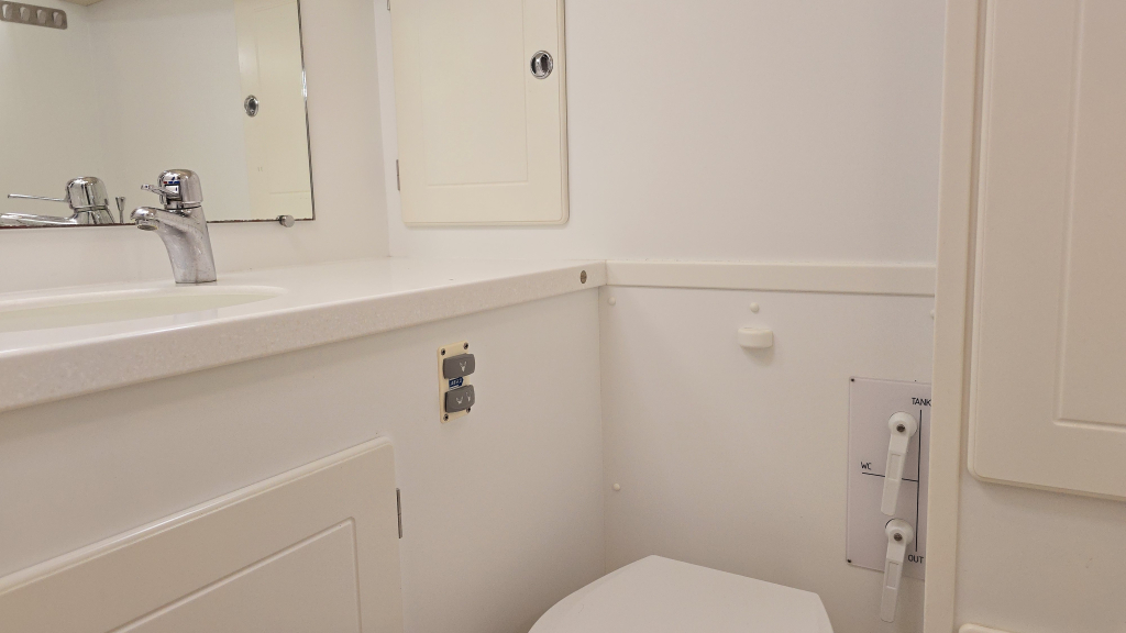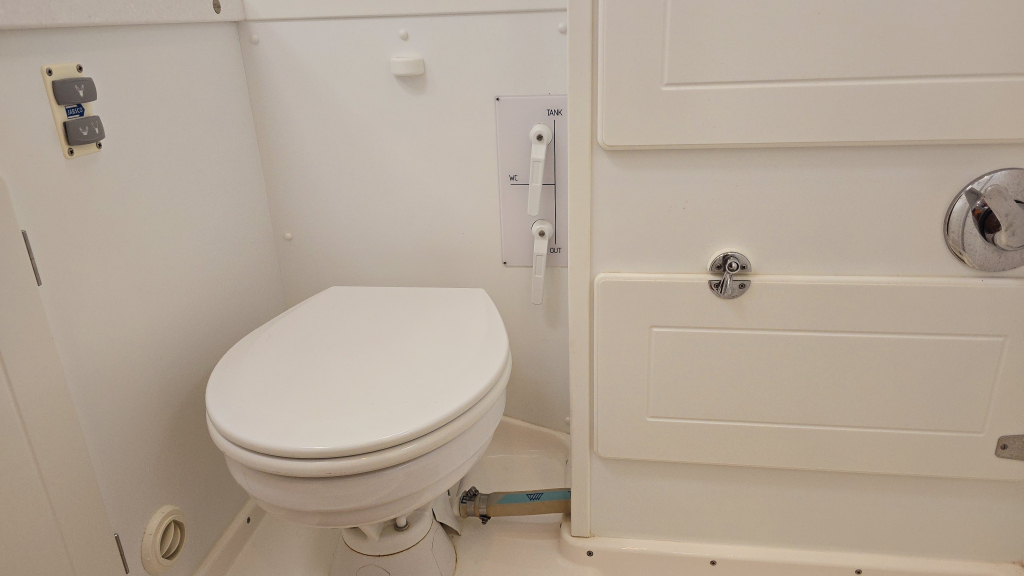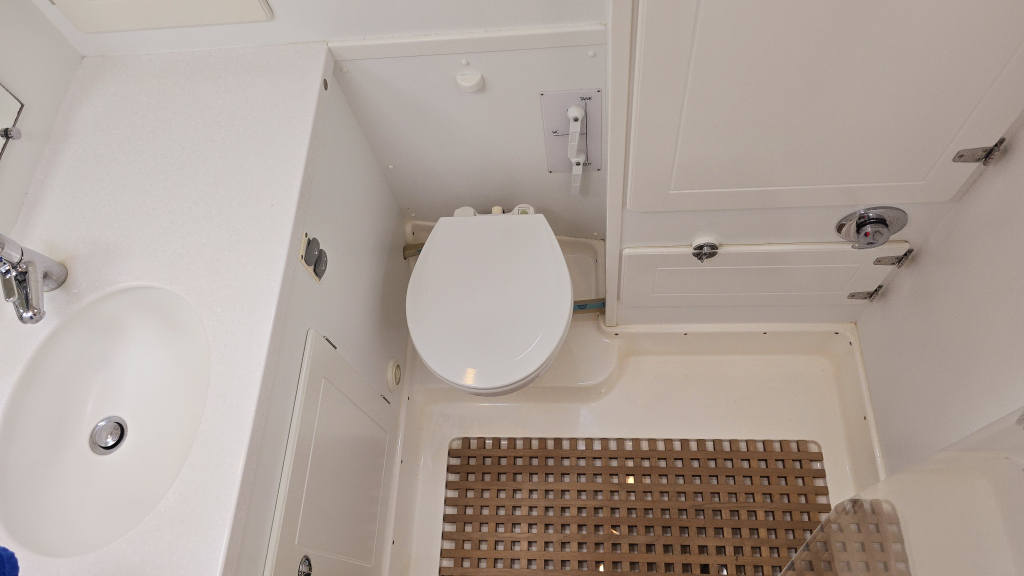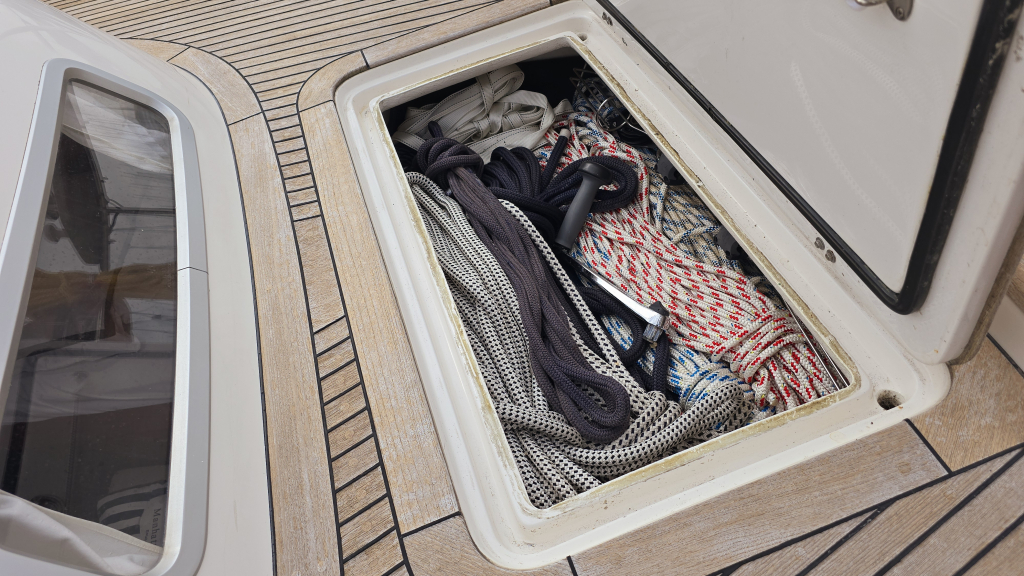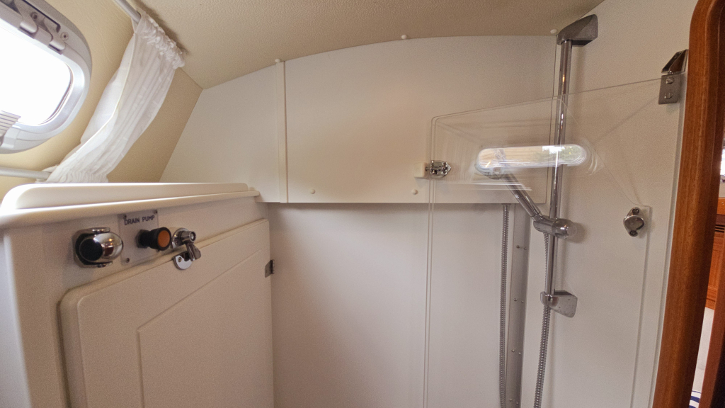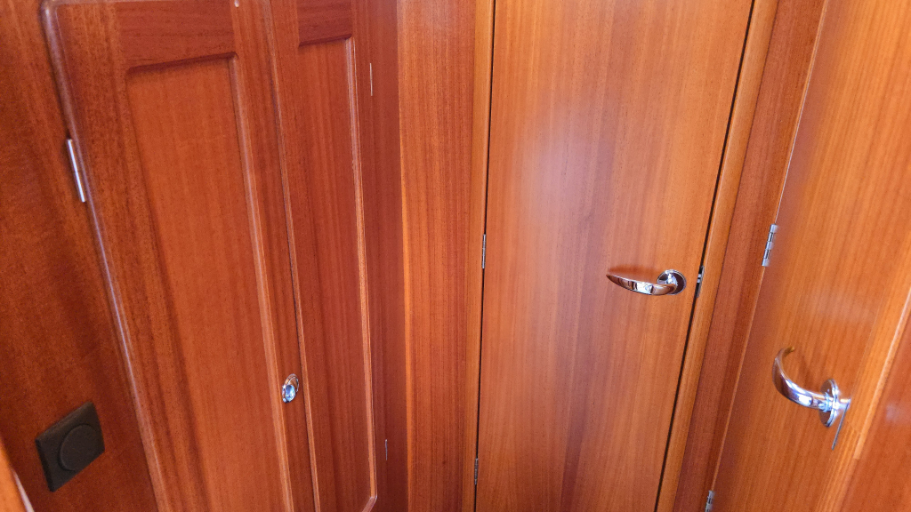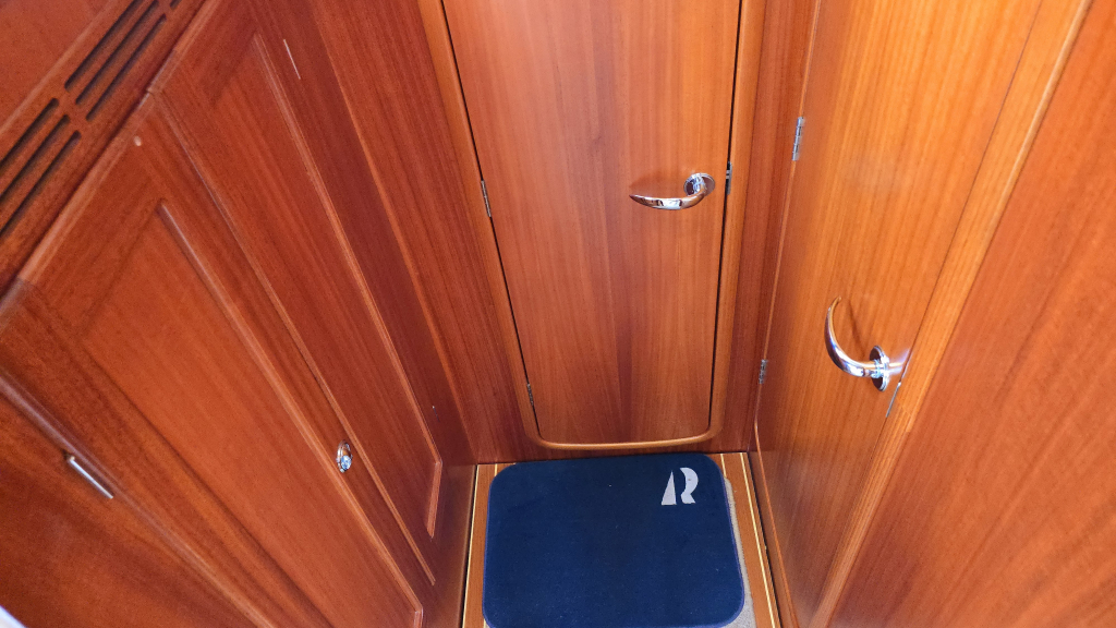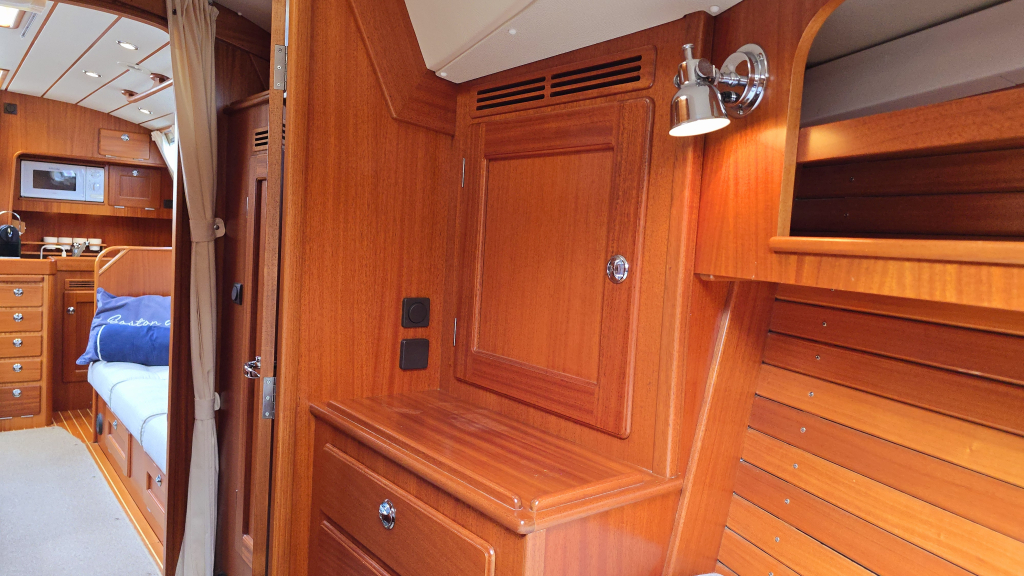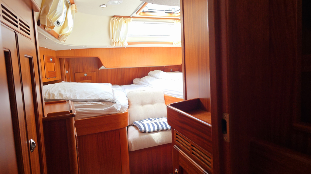 Helemaal in de boeg is een dubbel V-bed, waar het vakmanschap van Hallberg-Rassy tot uiting is gekomen middels prachtige gewelfde houtvorm en diverse kastruimte.