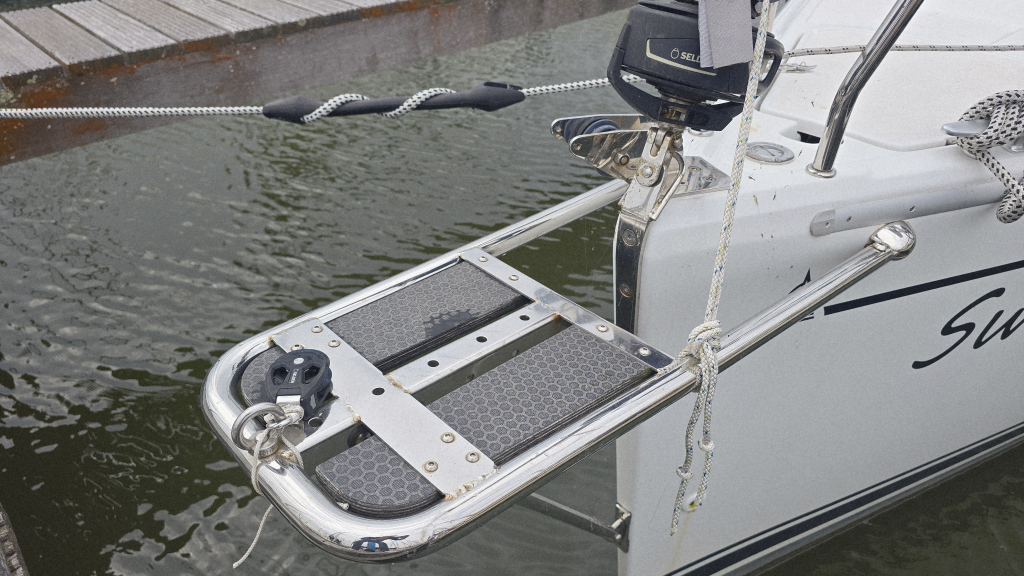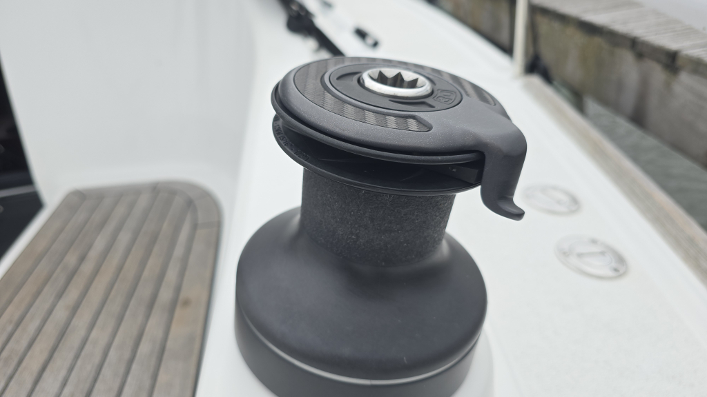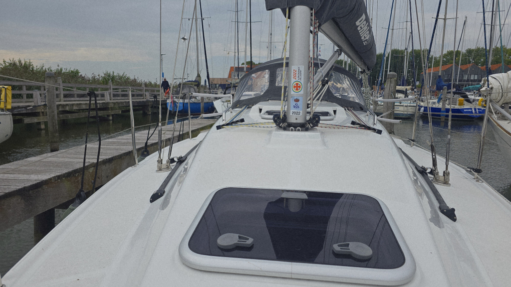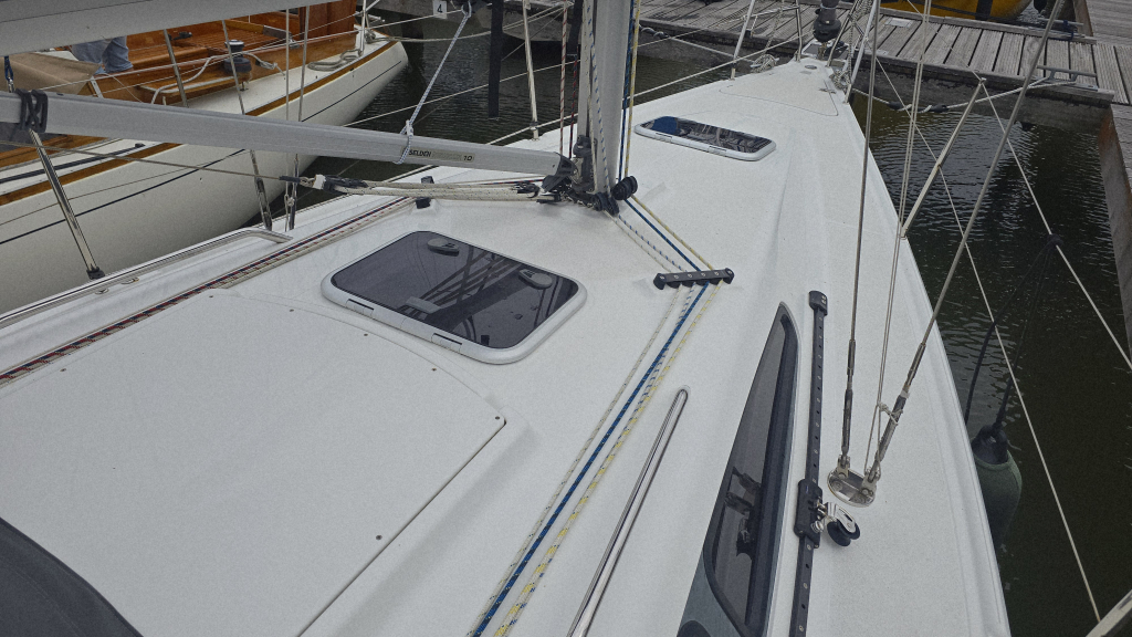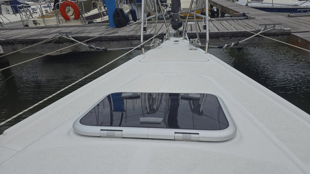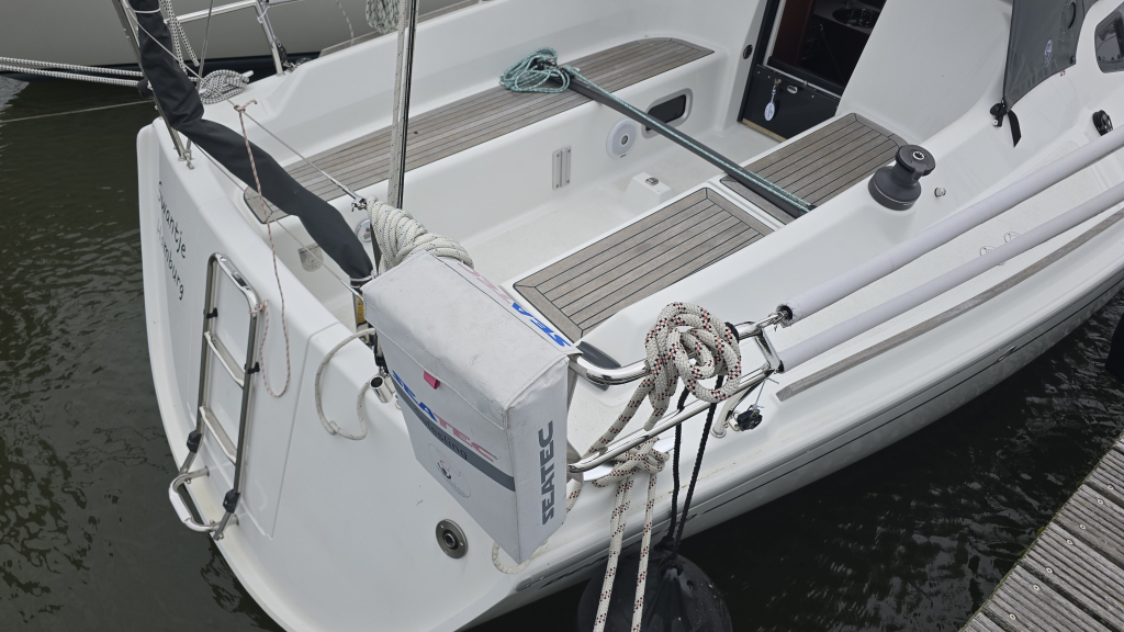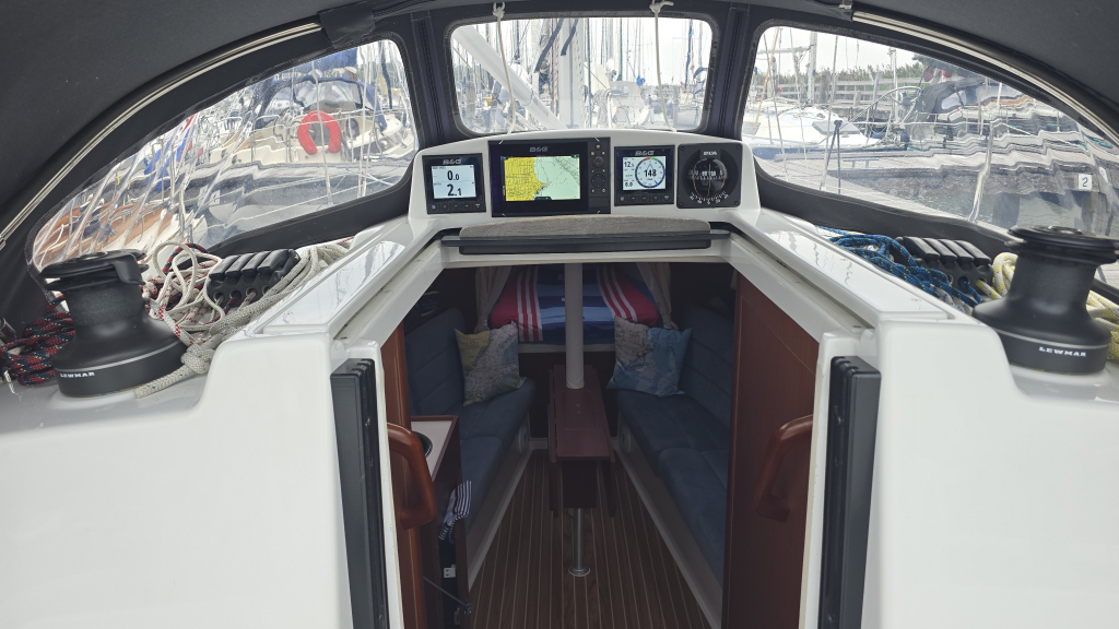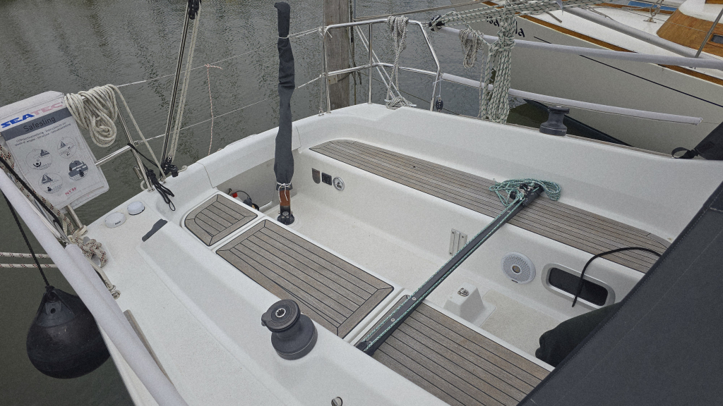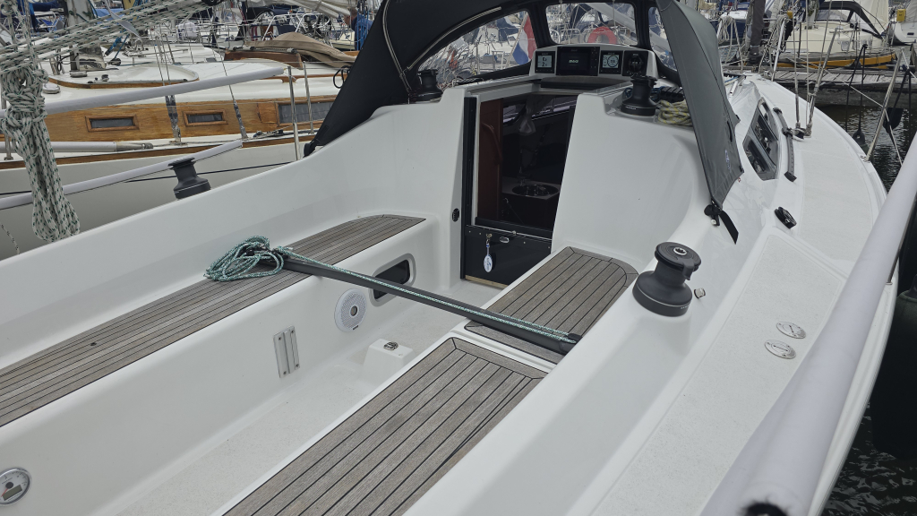 Er staat een mooi grijs laminaat setje zeilen op en de moderne B&G apparatuur zijn goed leesbaar in de kuip. Op de boeg is een vaste boegspriet gemonteerd wat tevens handig is als opstap bij het voorruit afmeren in een box.