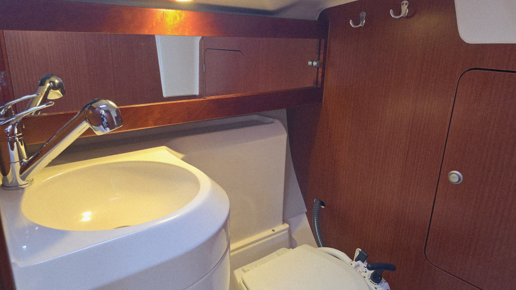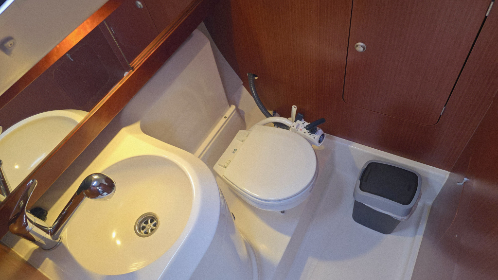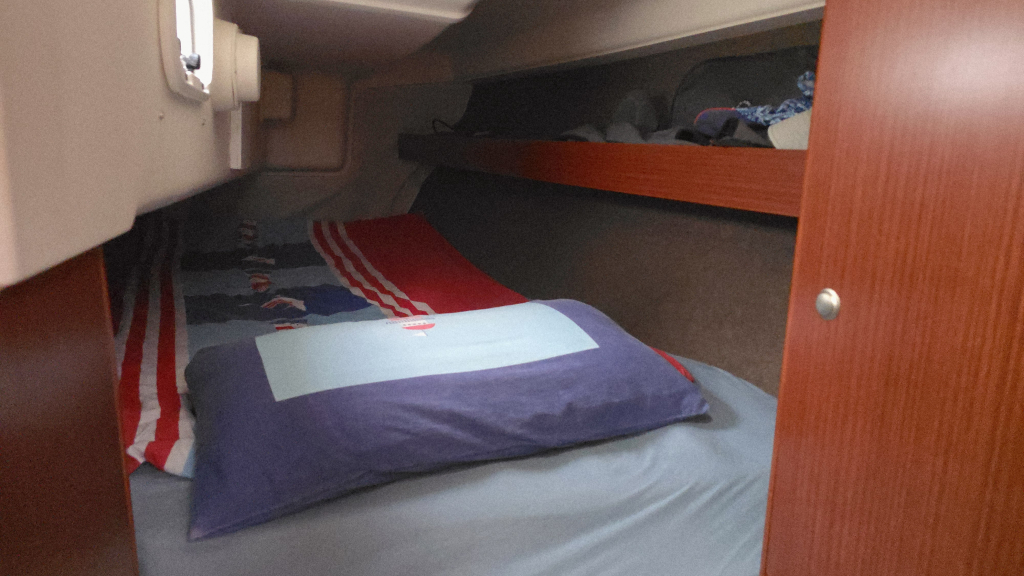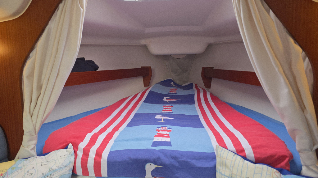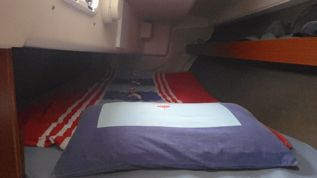 In het achterschip is een dubbel bed met kastruimte en boekenplank. Aan de ander zijde de toiletruimte met ingebouwde kastruimte voor de zeilkleding.