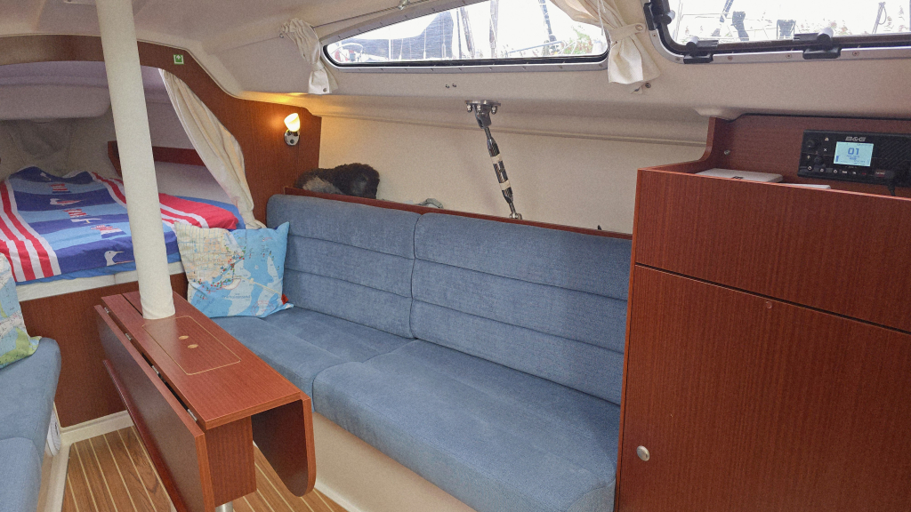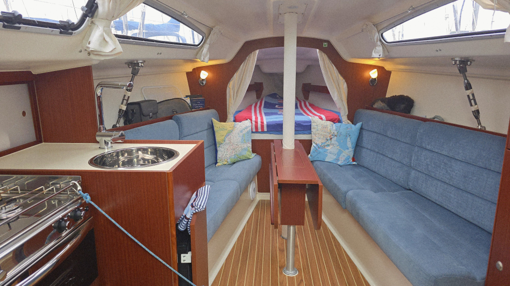 Het interieur geniet de standaard indeling met het U-vormige kombuis aan bakboord met zij-lader koelbox, 2-pits fornuis en enkele wasbak. Aan de andere zijde is een ruime hangkast met het schakelbord ingebouwd. De saloon heeft 2 langsbanken welke ook als loodskooi kunnen fungeren en een door gordijnen afsluitbare voorpunt met dubbel V-bed.