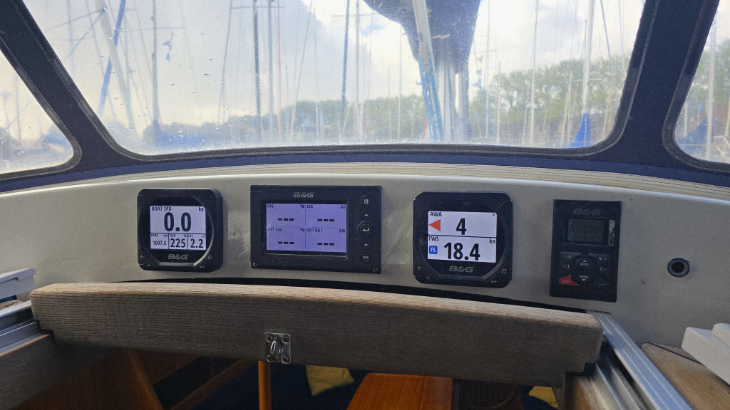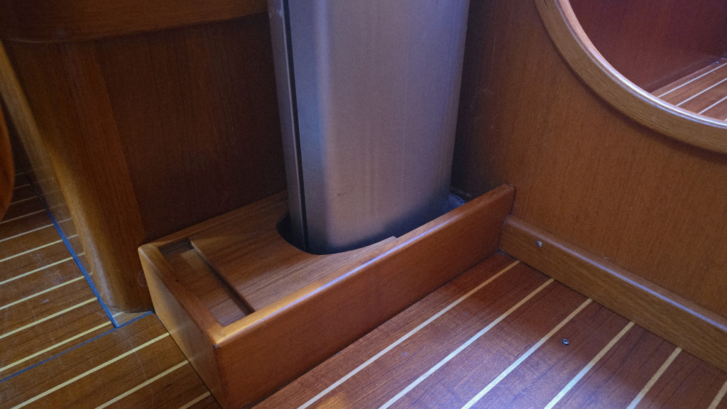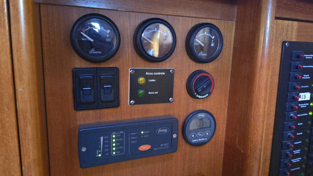 Aan stuurboord is de navigatiehoek voorzien van diverse inbouwapparatuur en lades. Hier past nog een goede 1800 kaartserie op!