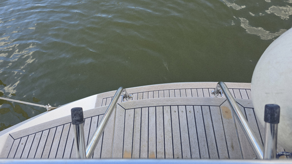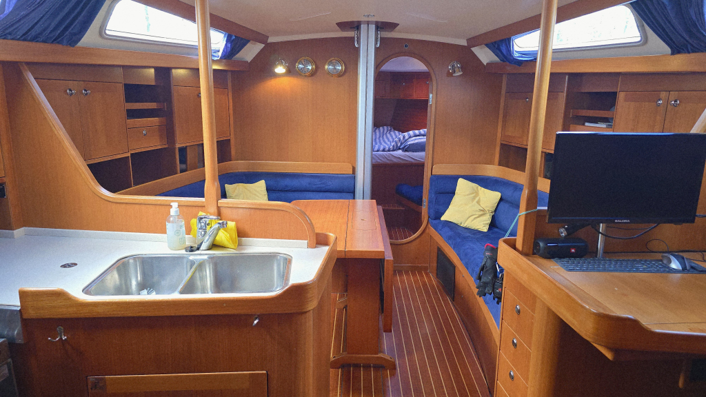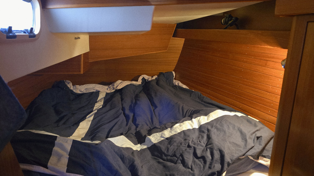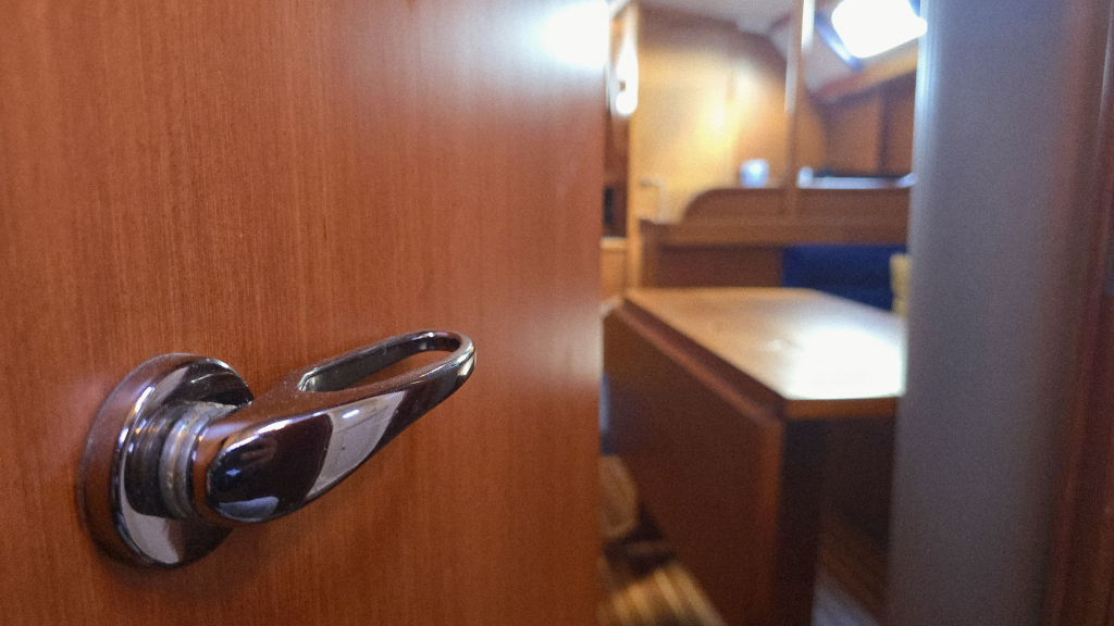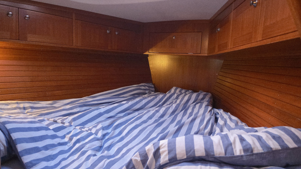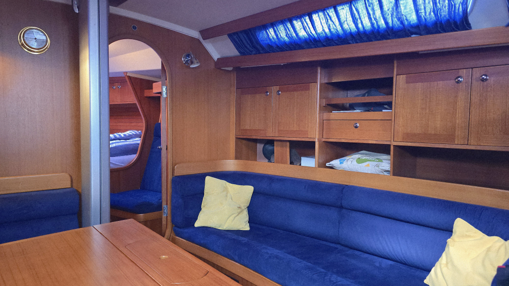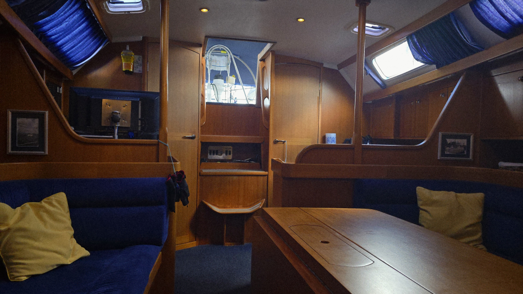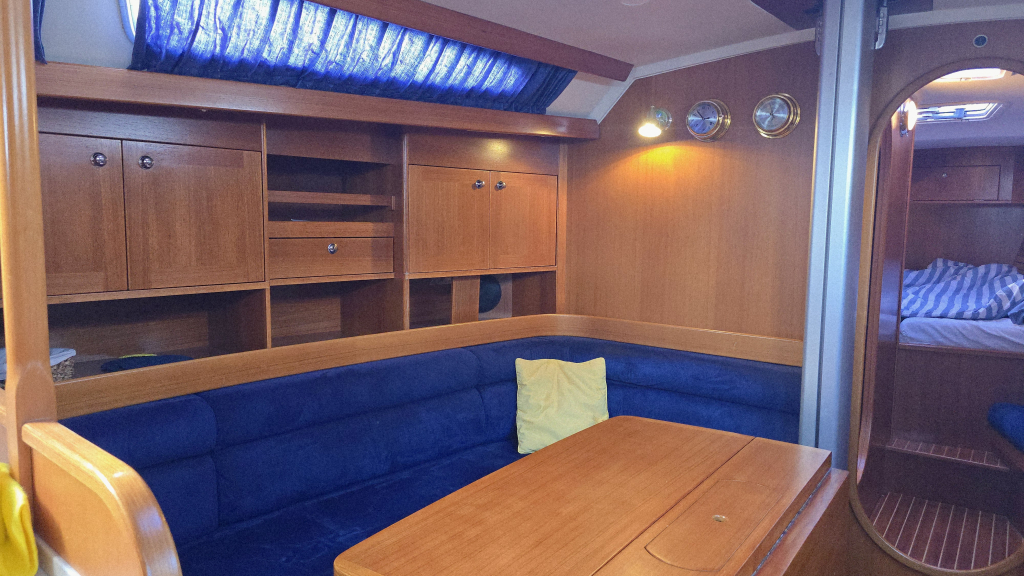 De gangboorden zijn breed en goed toegankelijk naar de boeg met een solide teakhouten handgreep op de kajuitopbouw. Het interieur is licht en hier zie je de Zweedse kwaliteit naar boven komen, mooie rondingen en hoogwaardige afwerking. Aan bakboord treffen we het L-vormige kombuis met bovenlader koelbox, dubbele wasbak en cardanisch fornuis en veel kastruimte. Ook is hier de toegang tot de acherhut voorzien van ruime kastruimte en ruim 2-persoons bed.