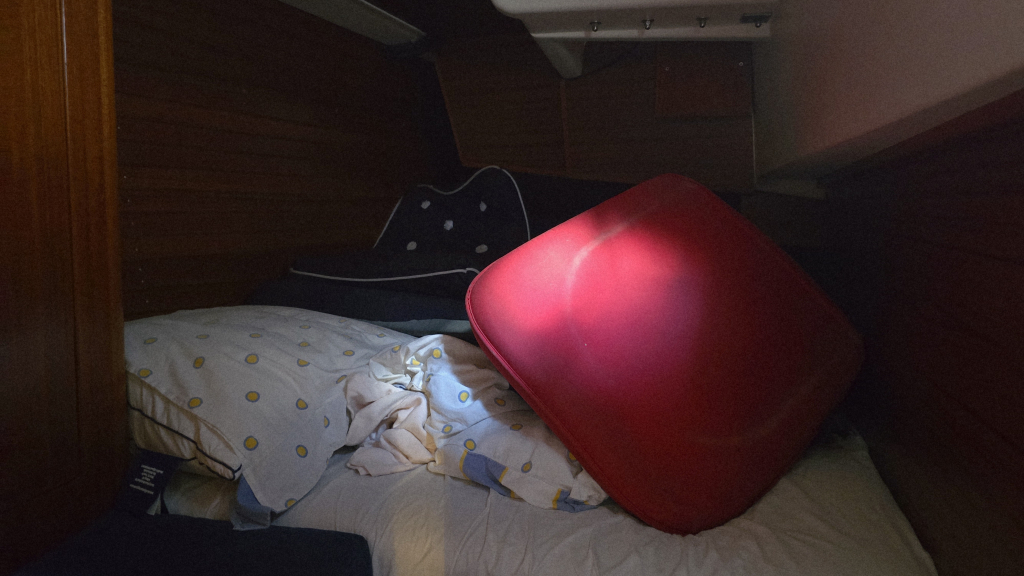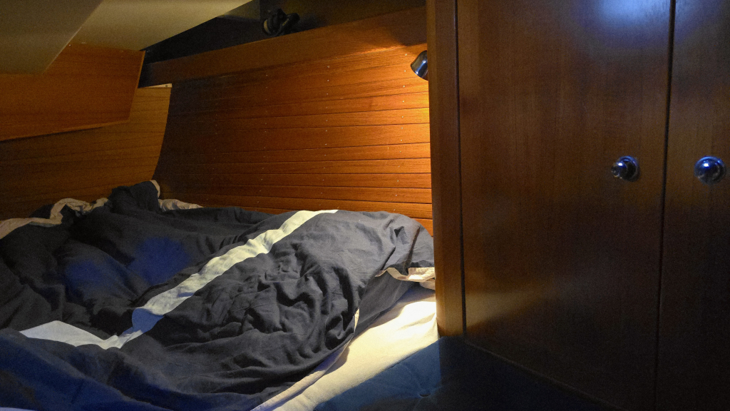 De saloon heeft een gezellige rondzit en voelt ligt aan door de lange raampartijen. In de boeg de 2e natte cel met V-bed voorzien van veel kastruimte en kleine sofa met rondom het V-bed ook veel opbergmogelijkheden.