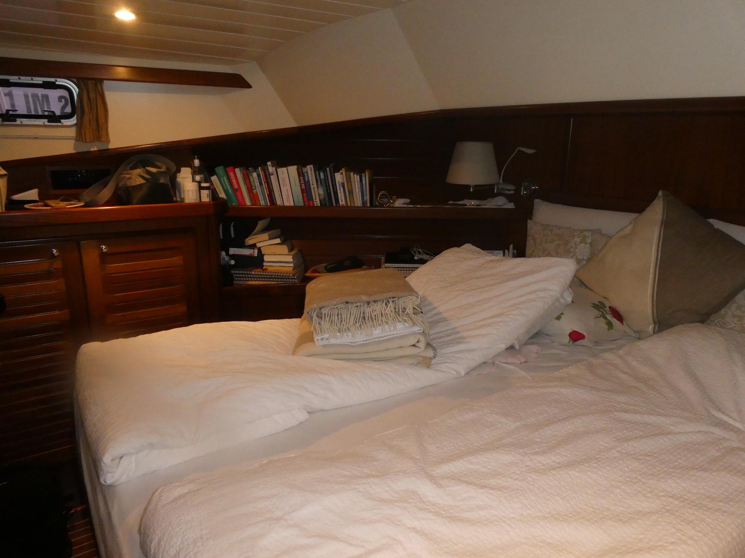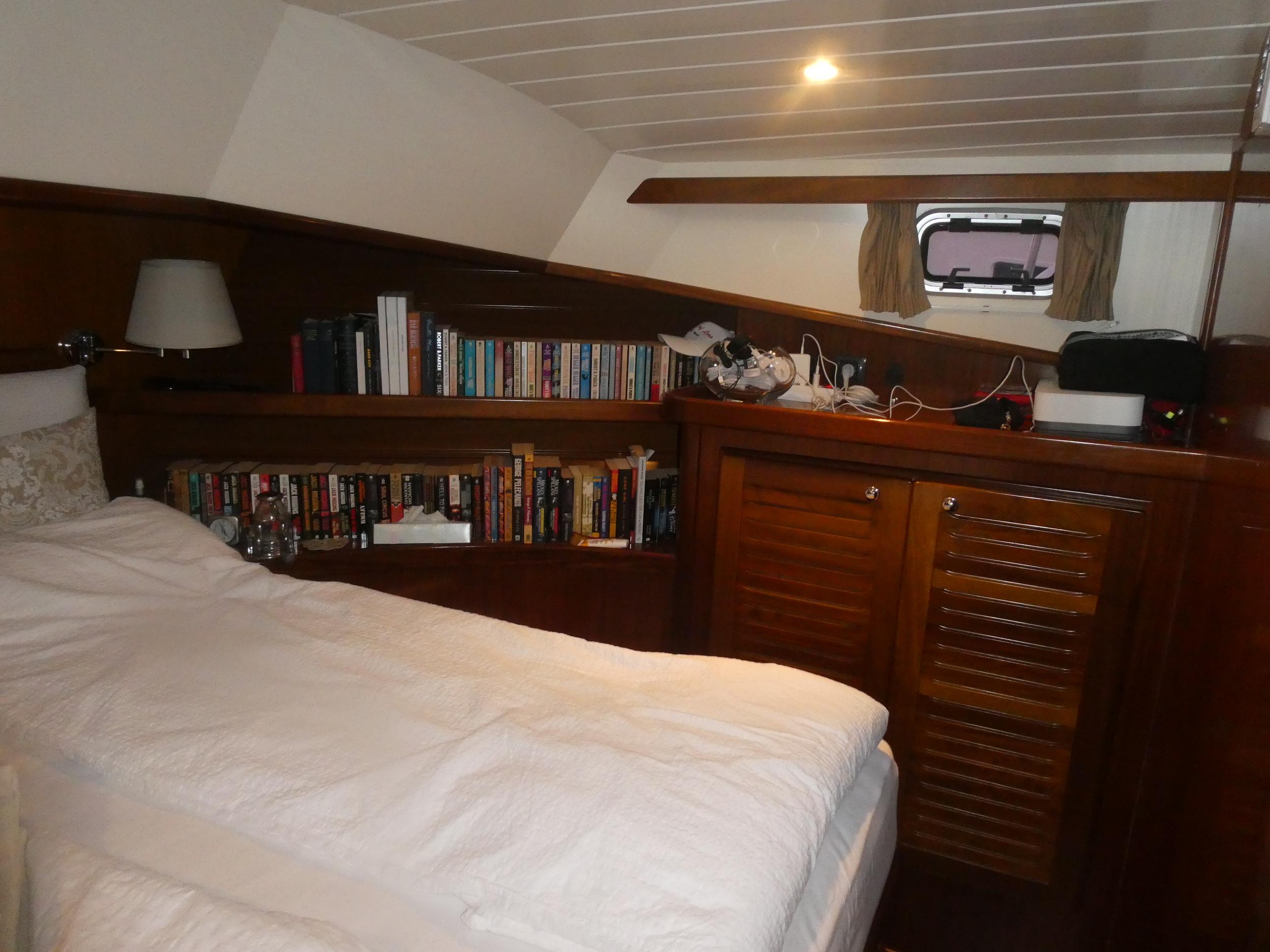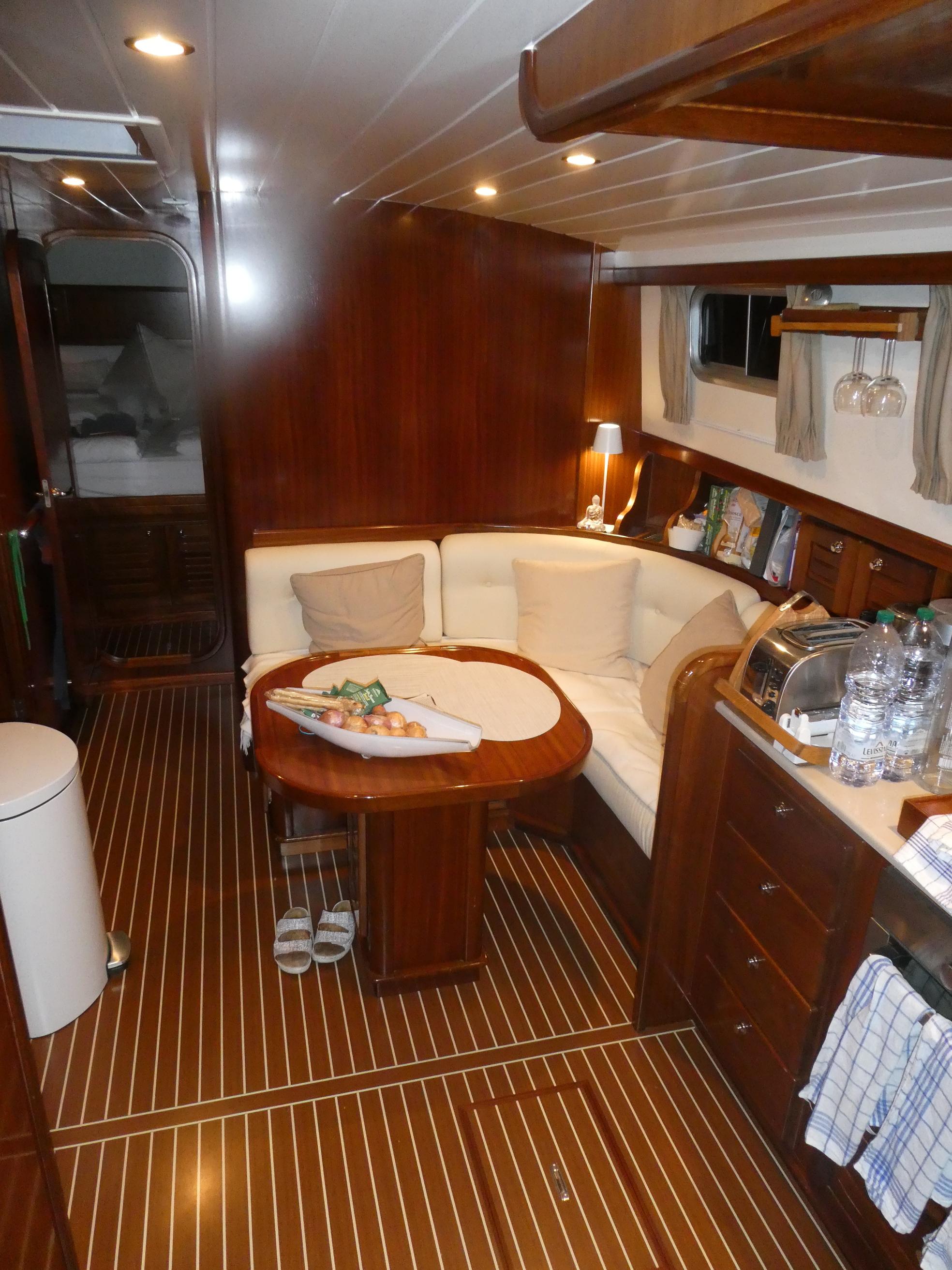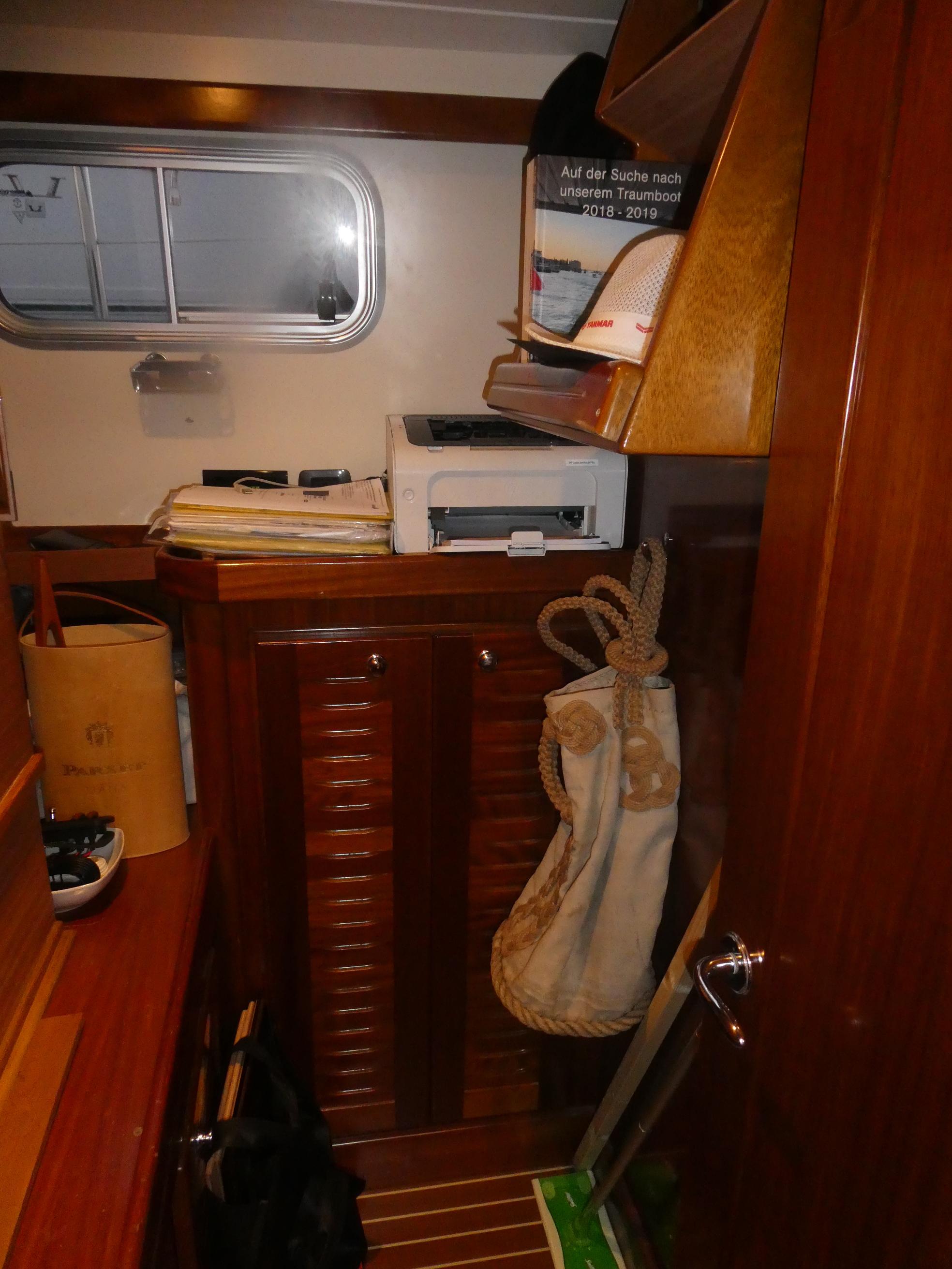 The superstructe is comfortable with big windows and seating area, the helmsman has all within sight and that surely helps when docking shorthanded. Down below we find the easting area and wide galley, provide with all you need such as storage, stove, fridge and freezer. In the Aft is the converted onboard office and in the bow is the seperate shower, heads and 2 sleeping cabins.