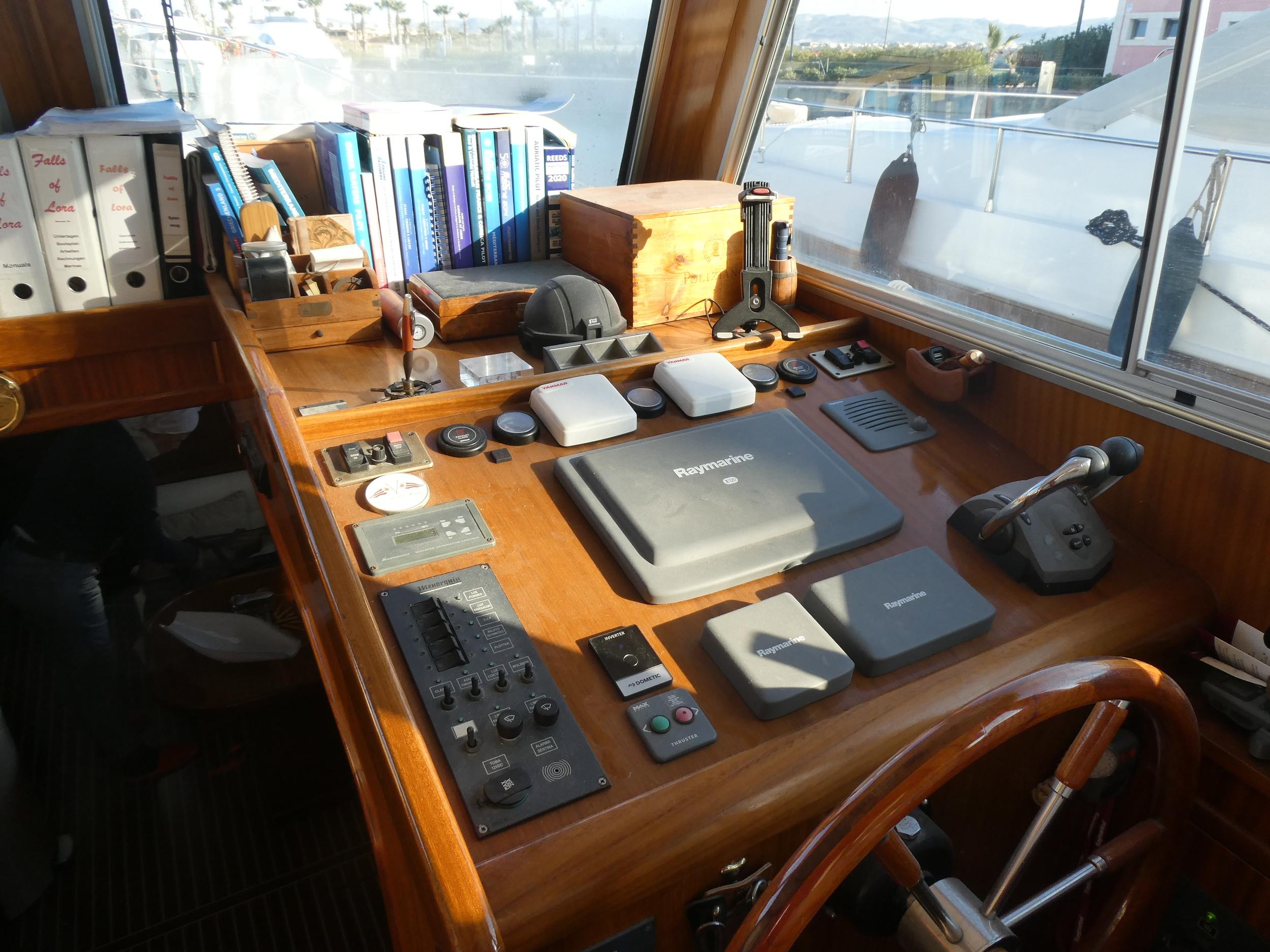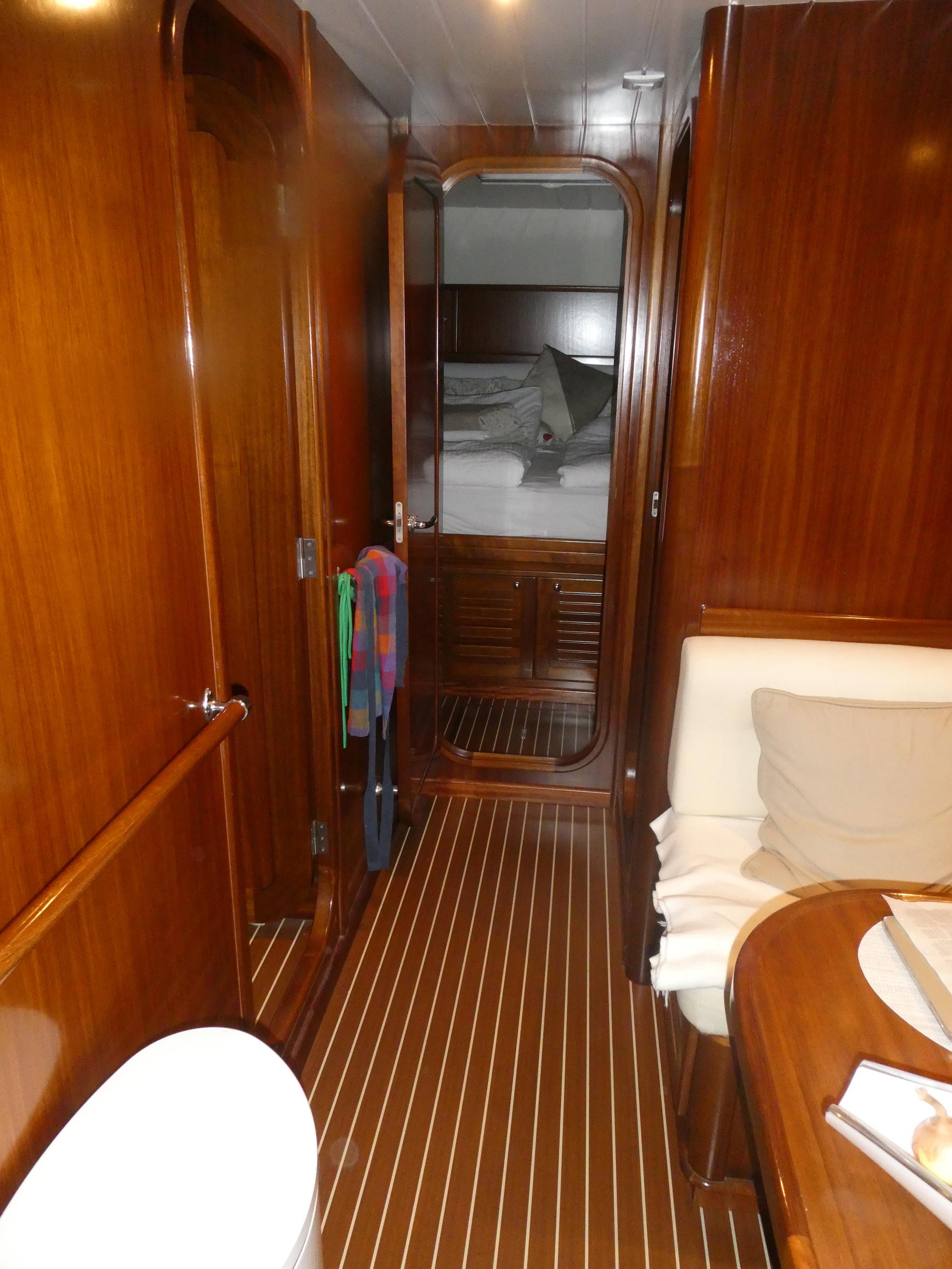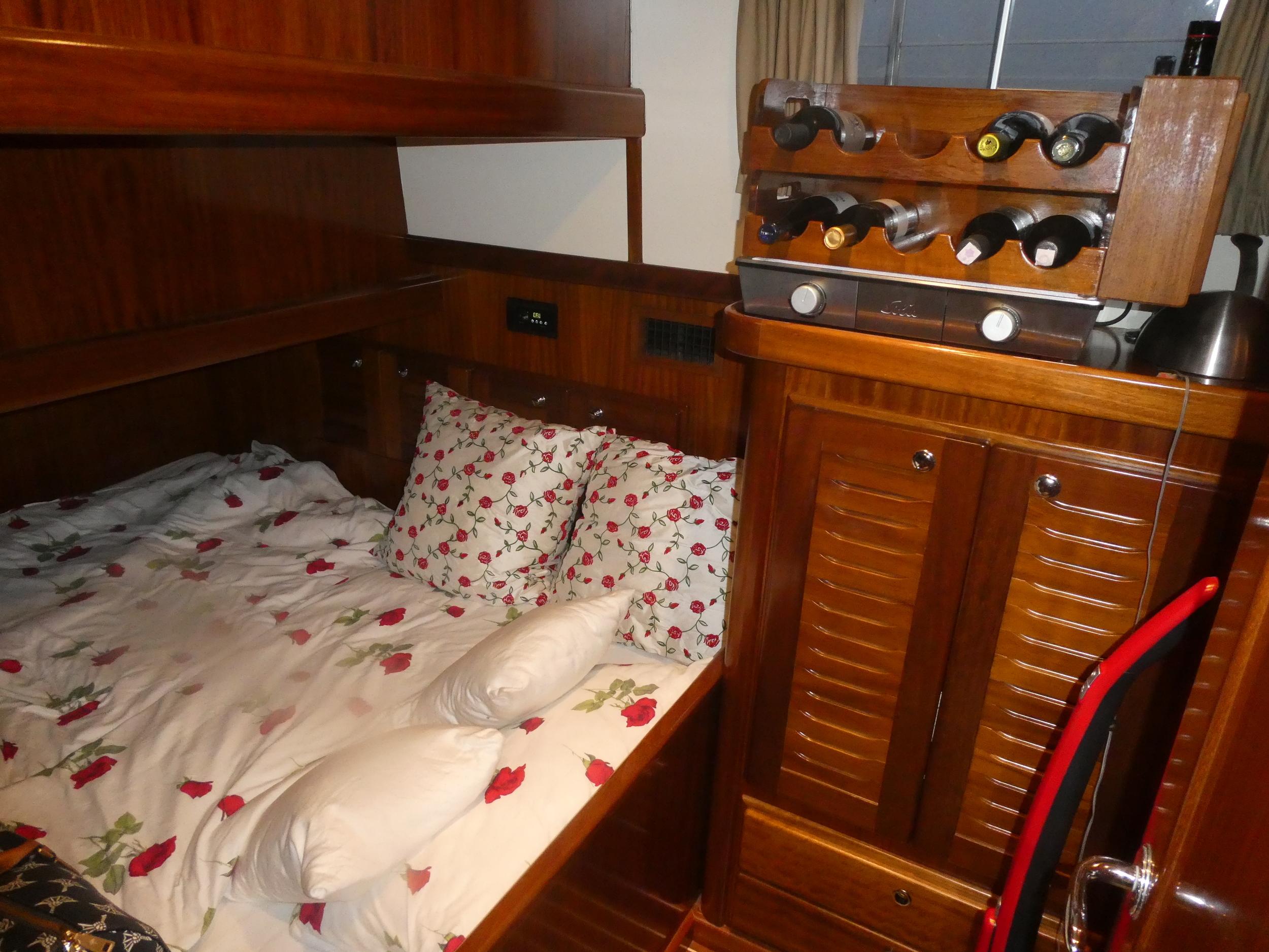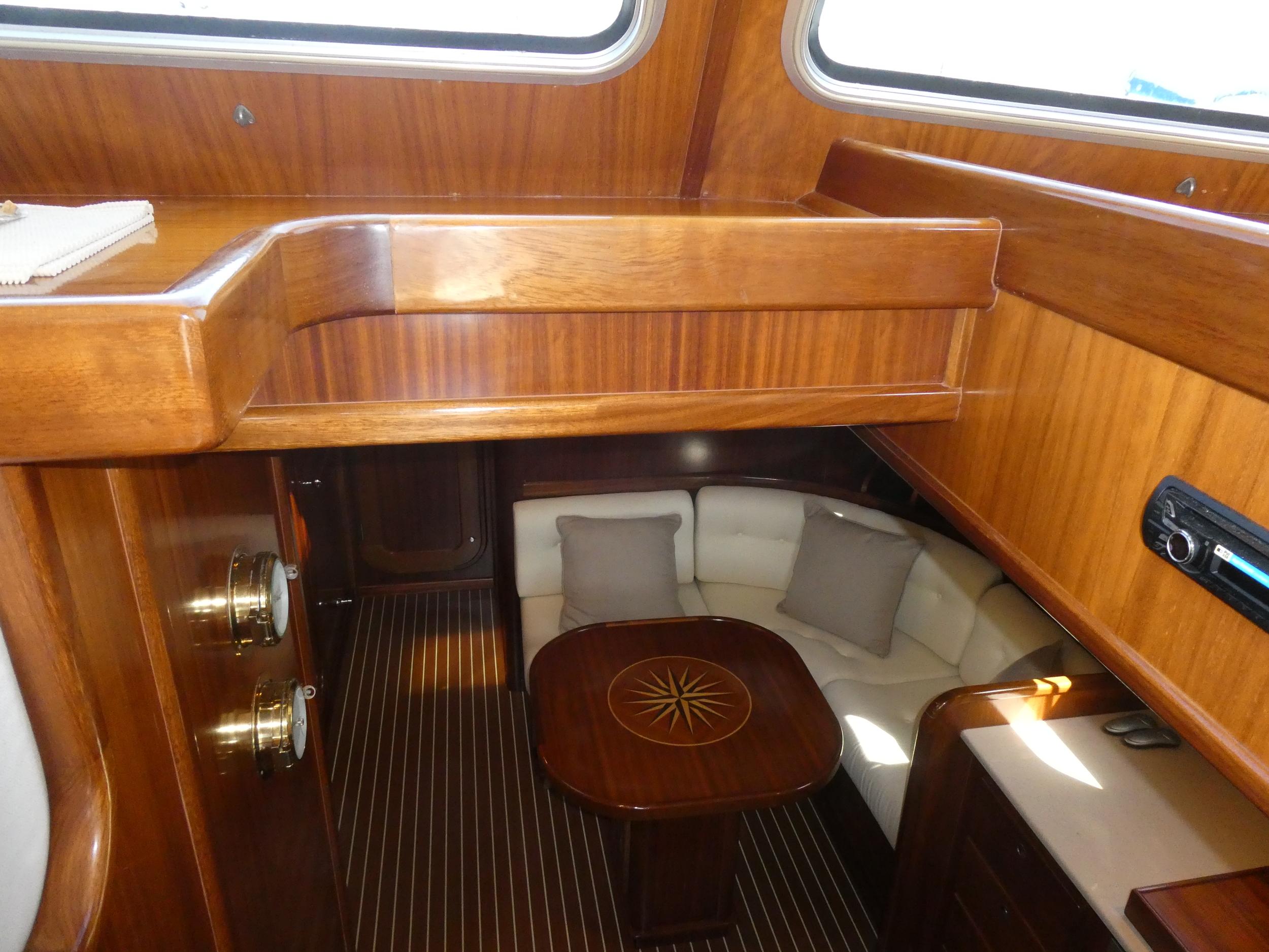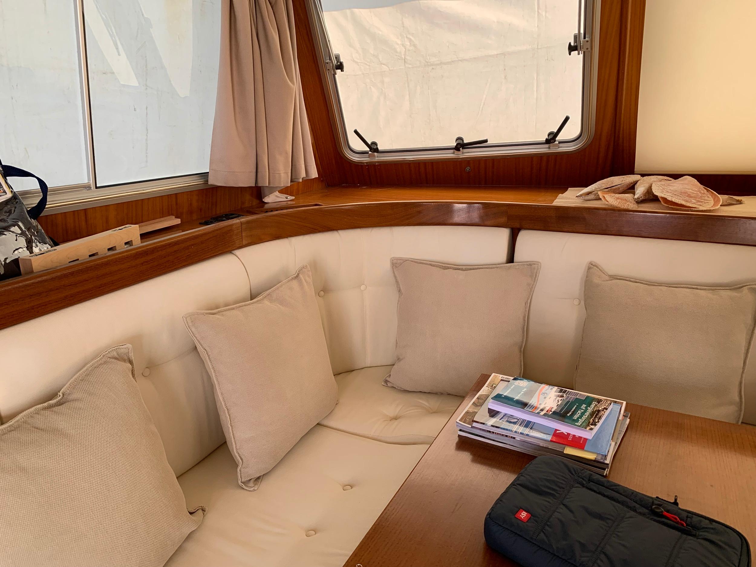 The superstructe is comfortable with big windows and seating area, the helmsman has all within sight and that surely helps when docking shorthanded. Down below we find the easting area and wide galley, provide with all you need such as storage, stove, fridge and freezer. In the Aft is the converted onboard office and in the bow is the seperate shower, heads and 2 sleeping cabins.