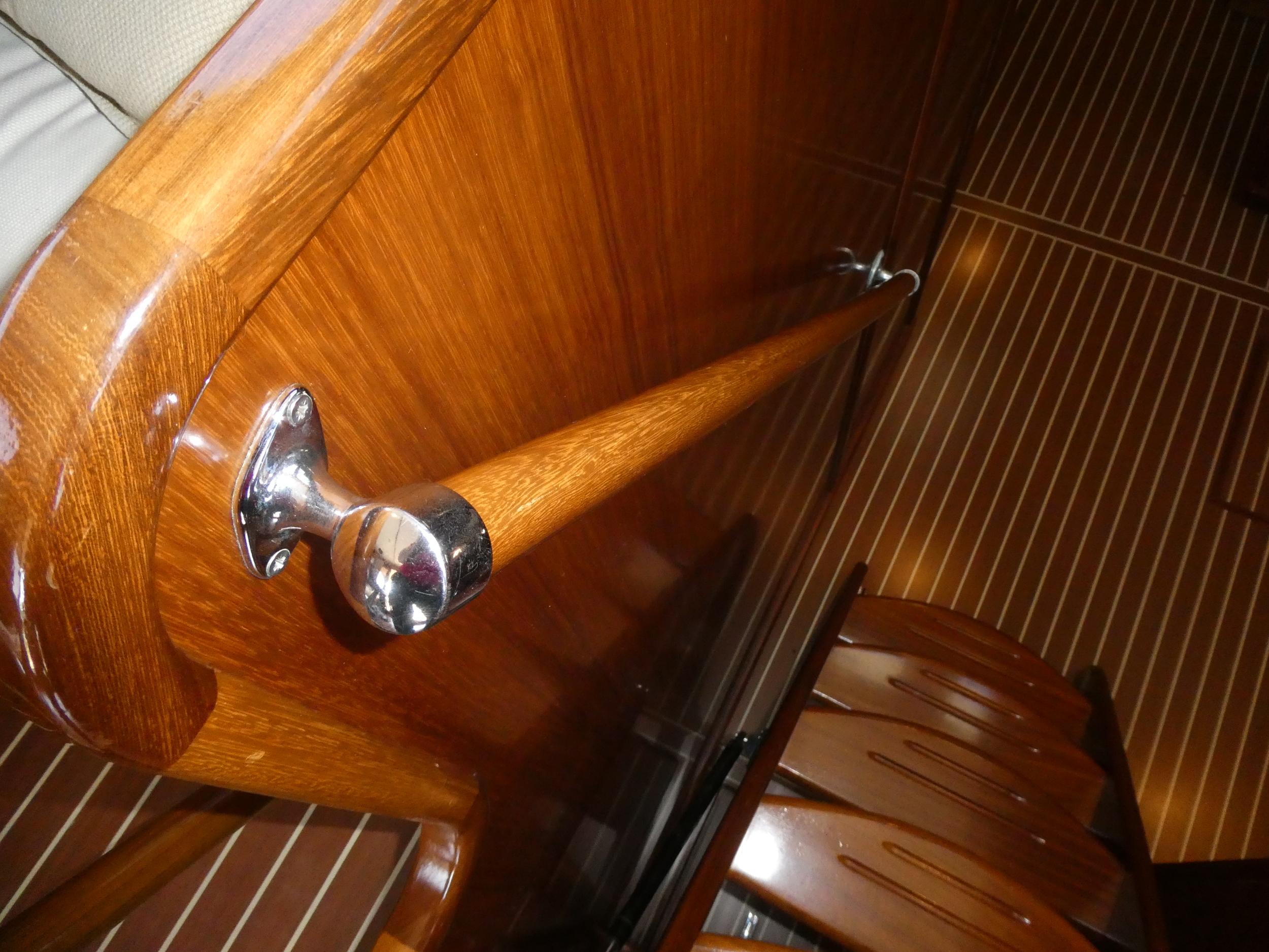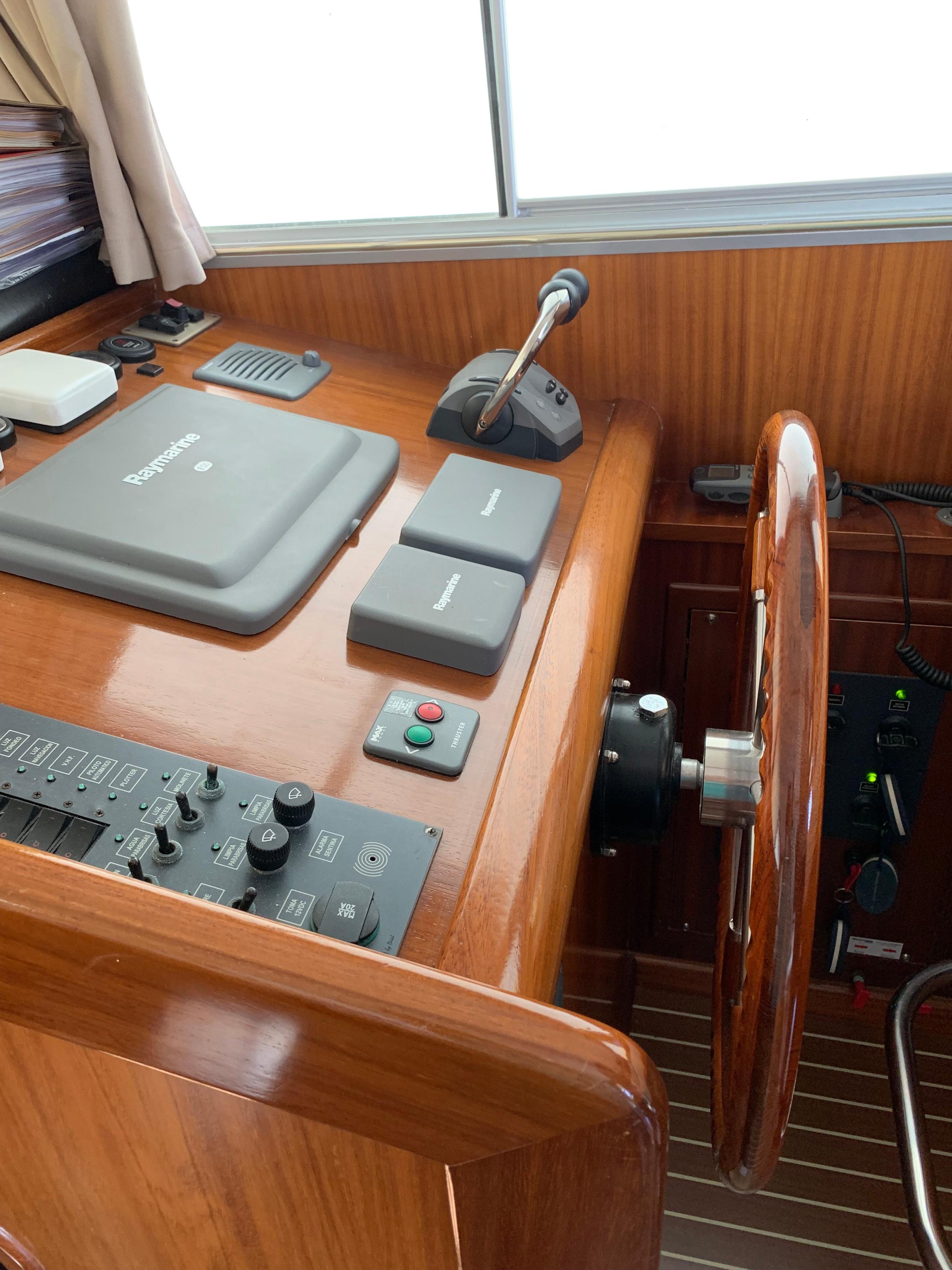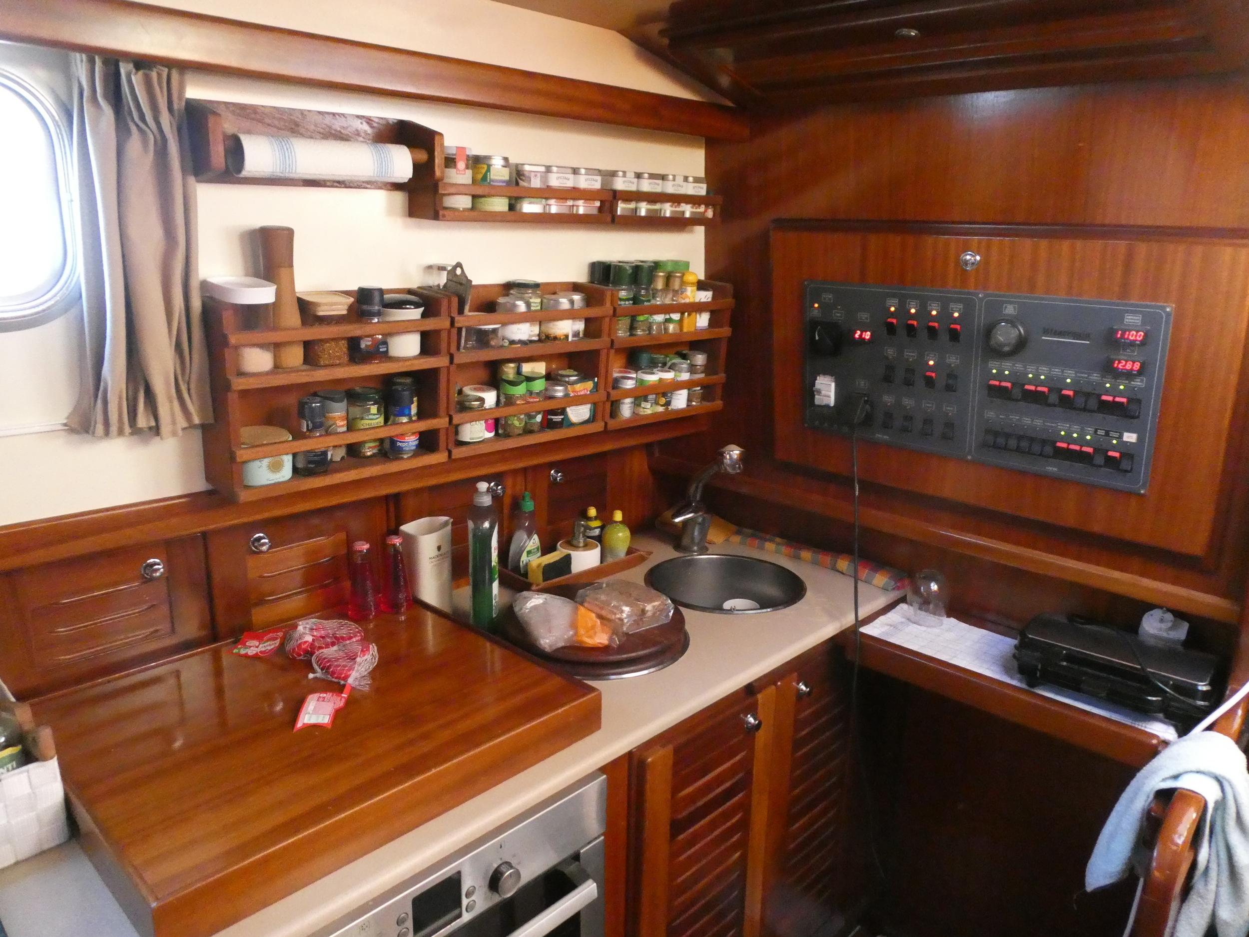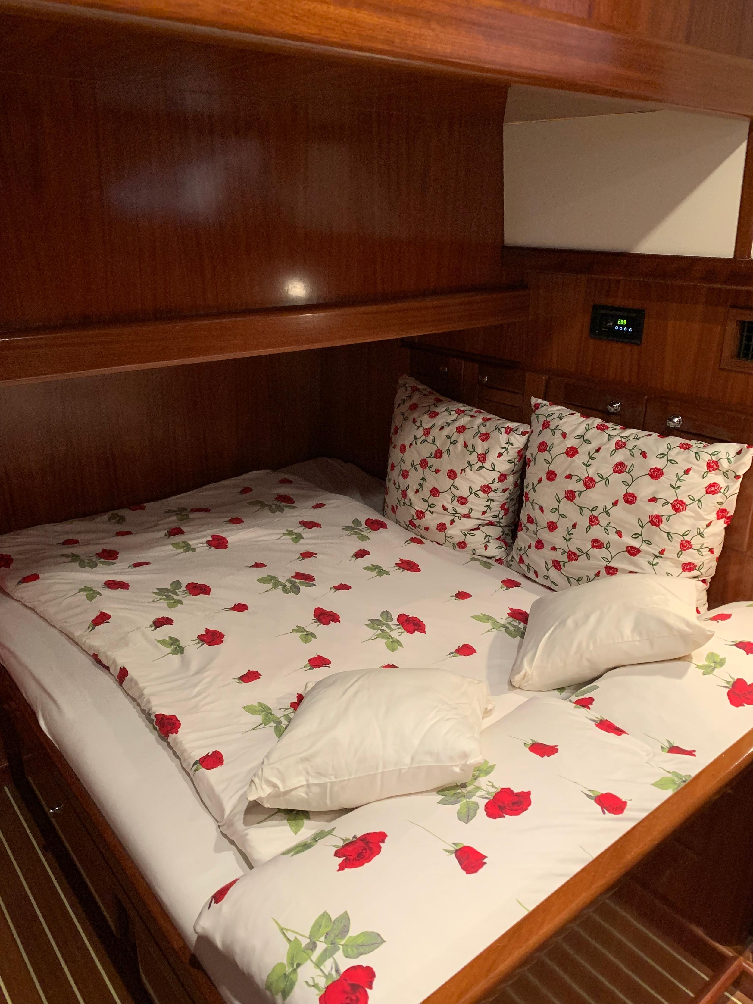 The superstructe is comfortable with big windows and seating area, the helmsman has all within sight and that surely helps when docking shorthanded. Down below we find the easting area and wide galley, provide with all you need such as storage, stove, fridge and freezer. In the Aft is the converted onboard office and in the bow is the seperate shower, heads and 2 sleeping cabins.