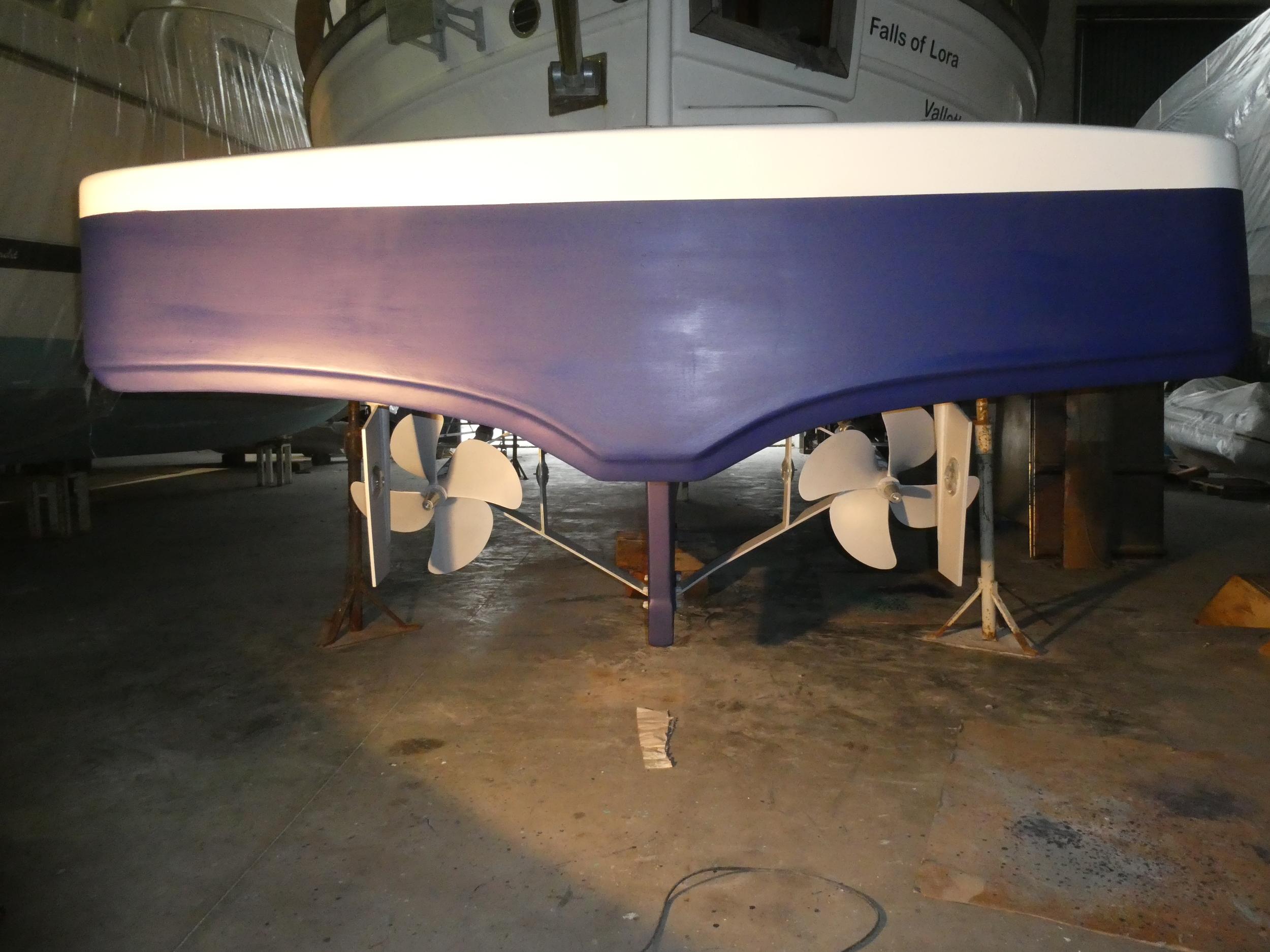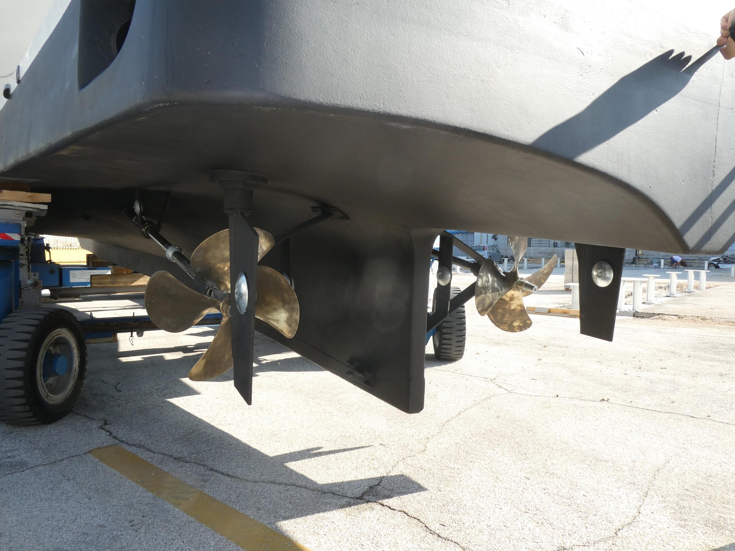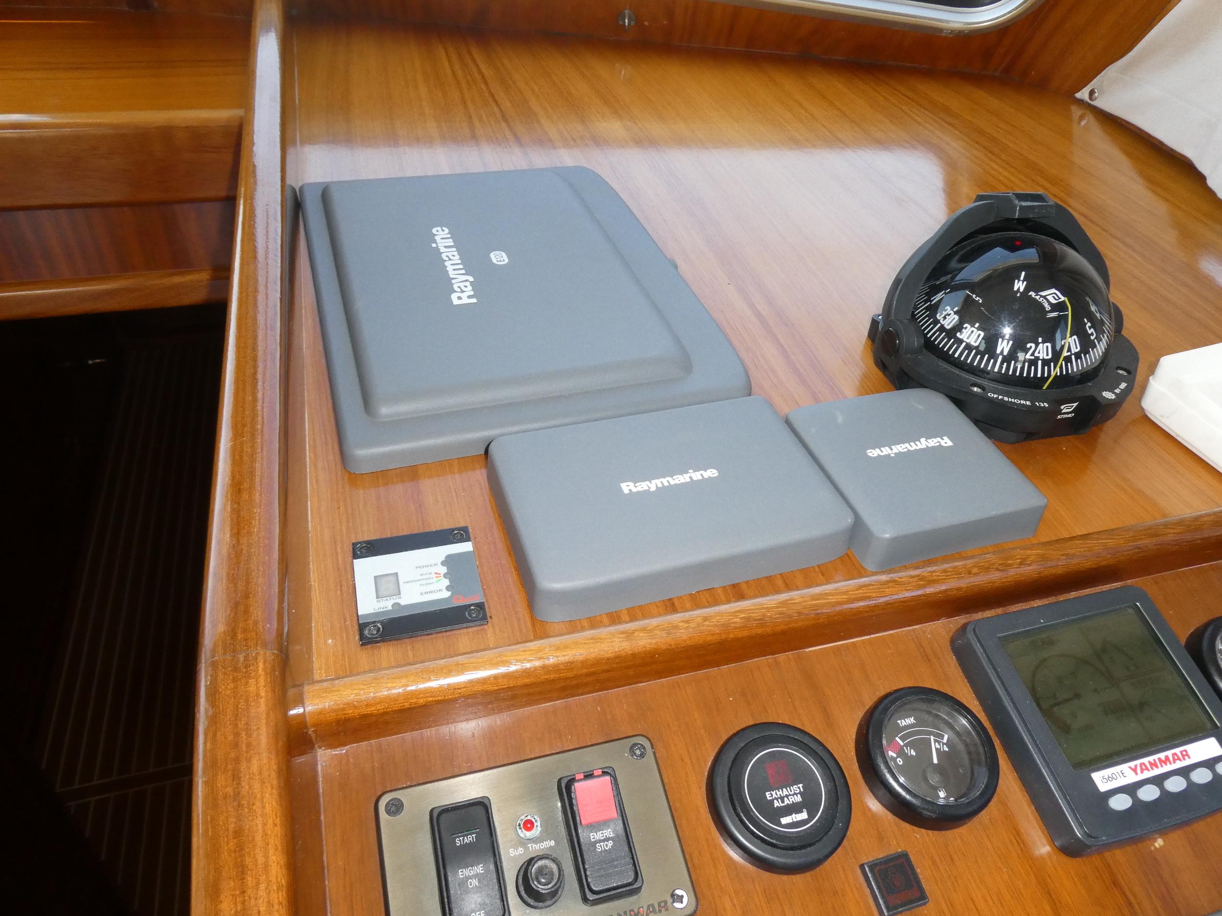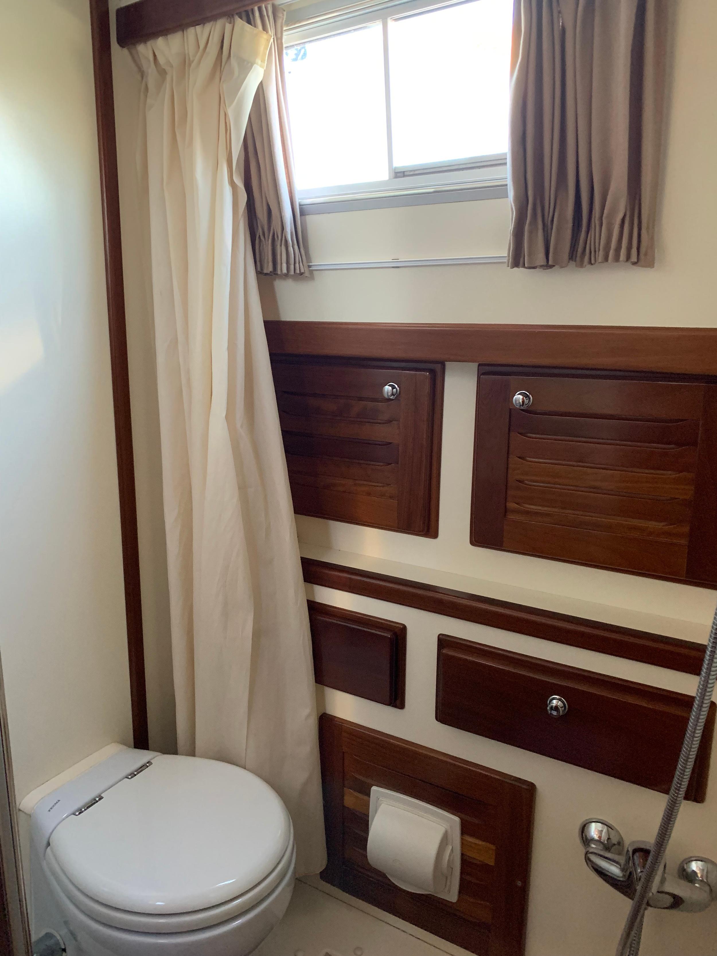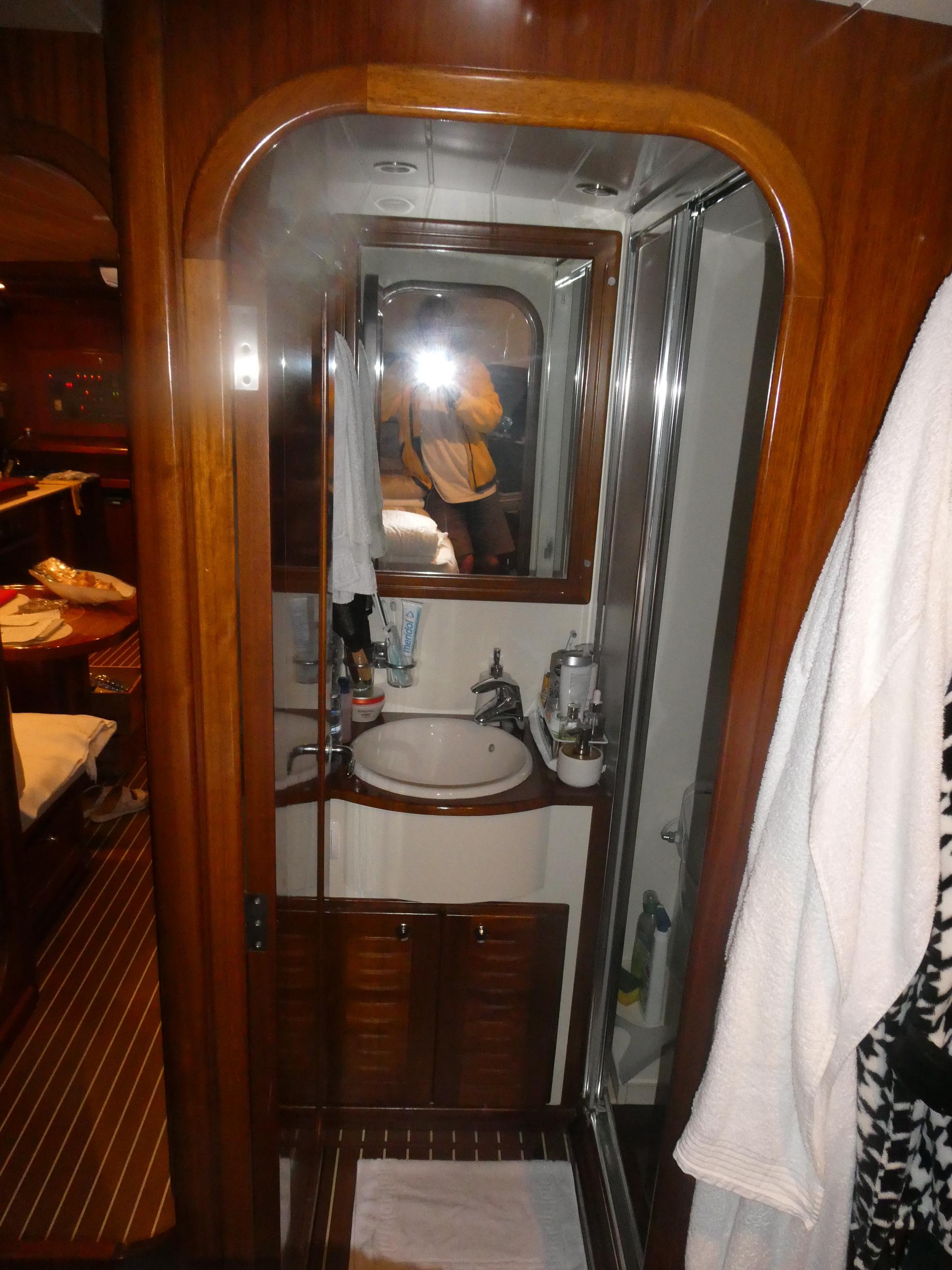 The superstructe is comfortable with big windows and seating area, the helmsman has all within sight and that surely helps when docking shorthanded. Down below we find the easting area and wide galley, provide with all you need such as storage, stove, fridge and freezer. In the Aft is the converted onboard office and in the bow is the seperate shower, heads and 2 sleeping cabins.