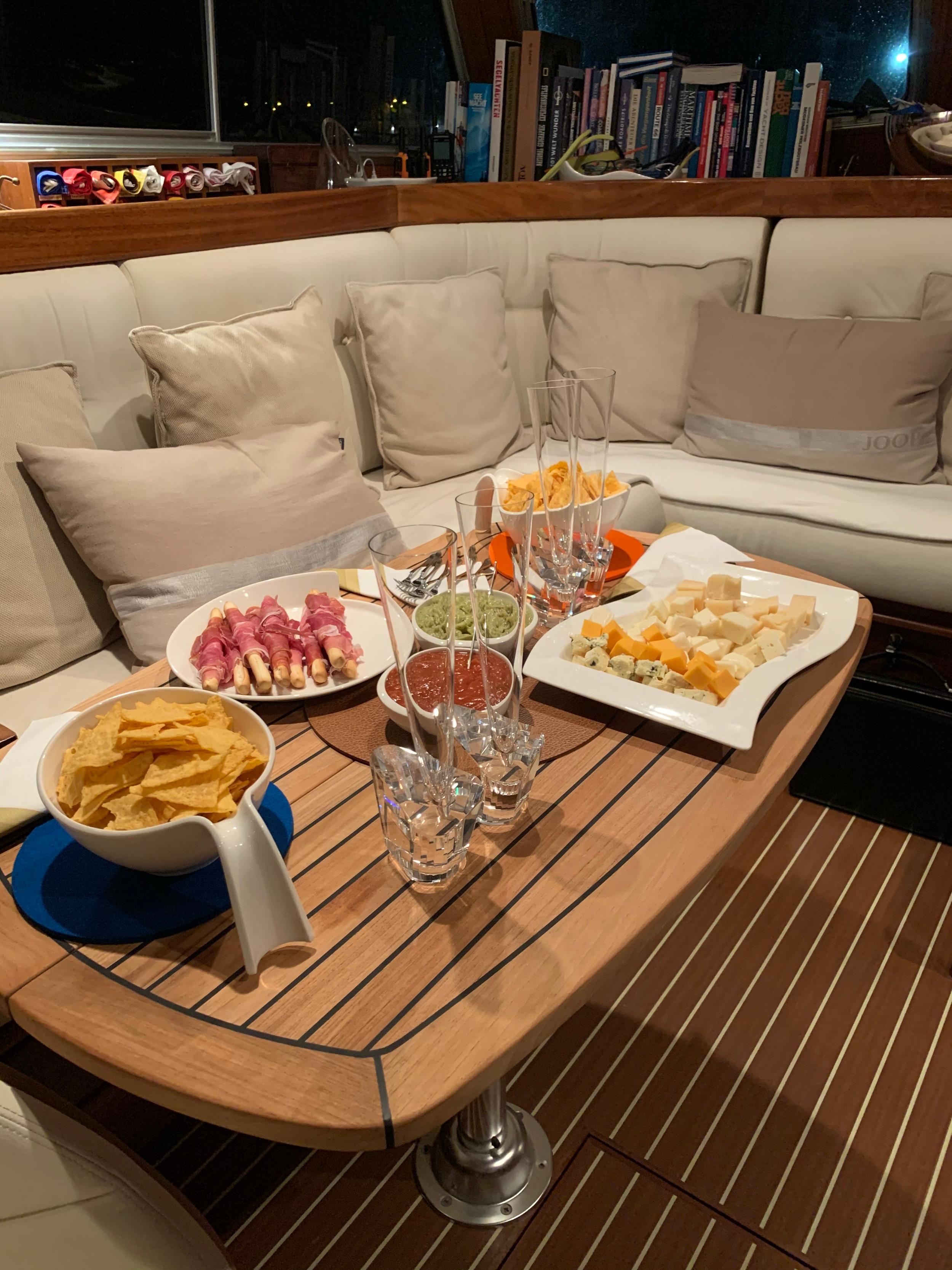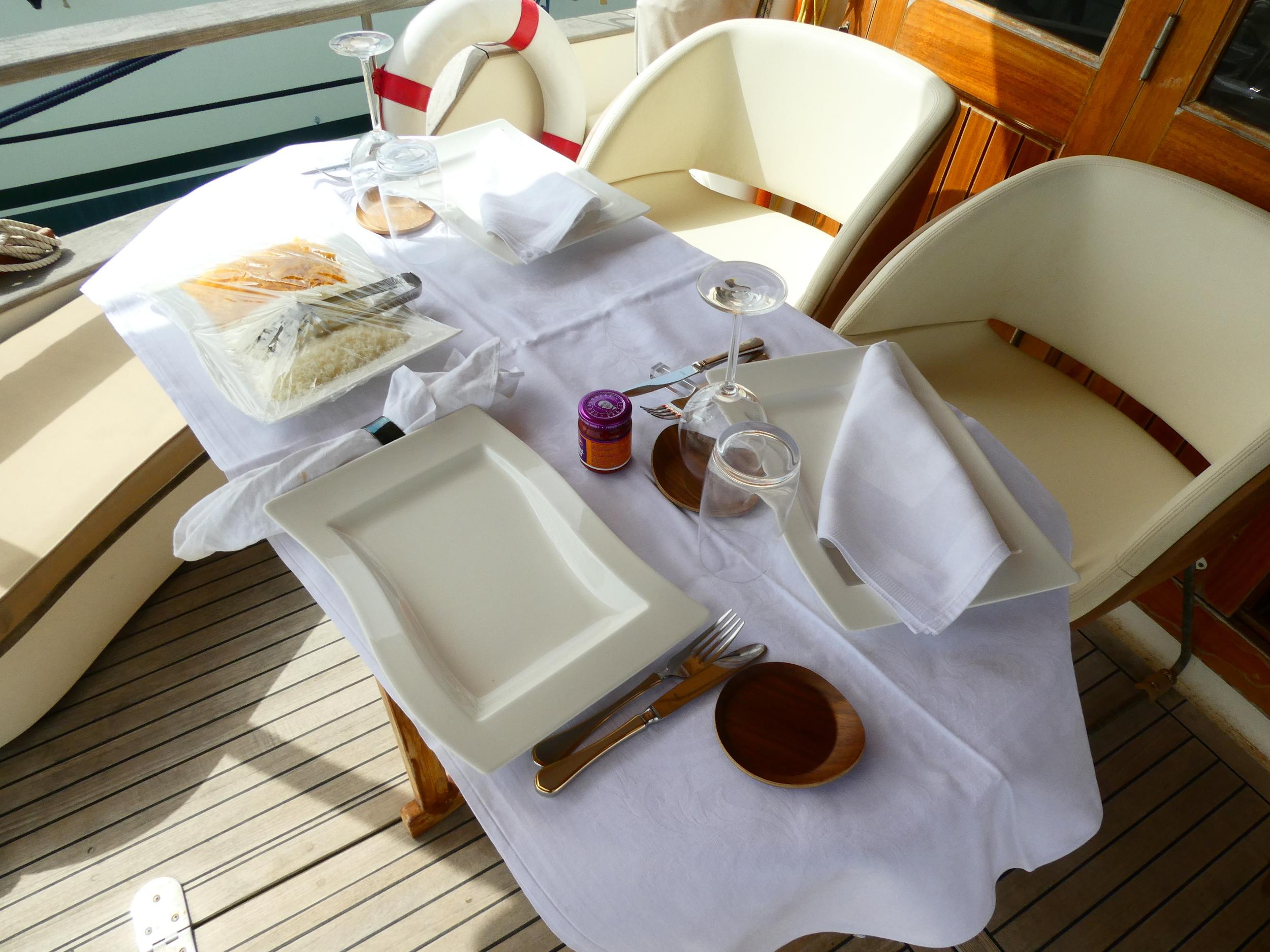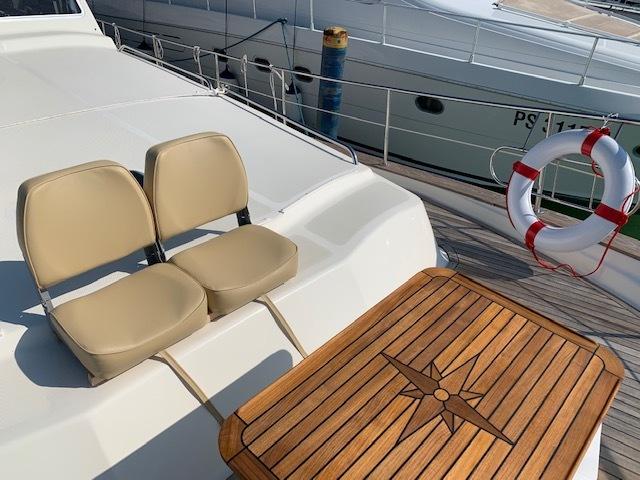 The cockpit is well layed out with a covered seating area which protect you from sun or rain, the gangways are wide and provide great safety when going to the bow. Also here is a great place to watch the sunset or while sailing the Medditerranean.
