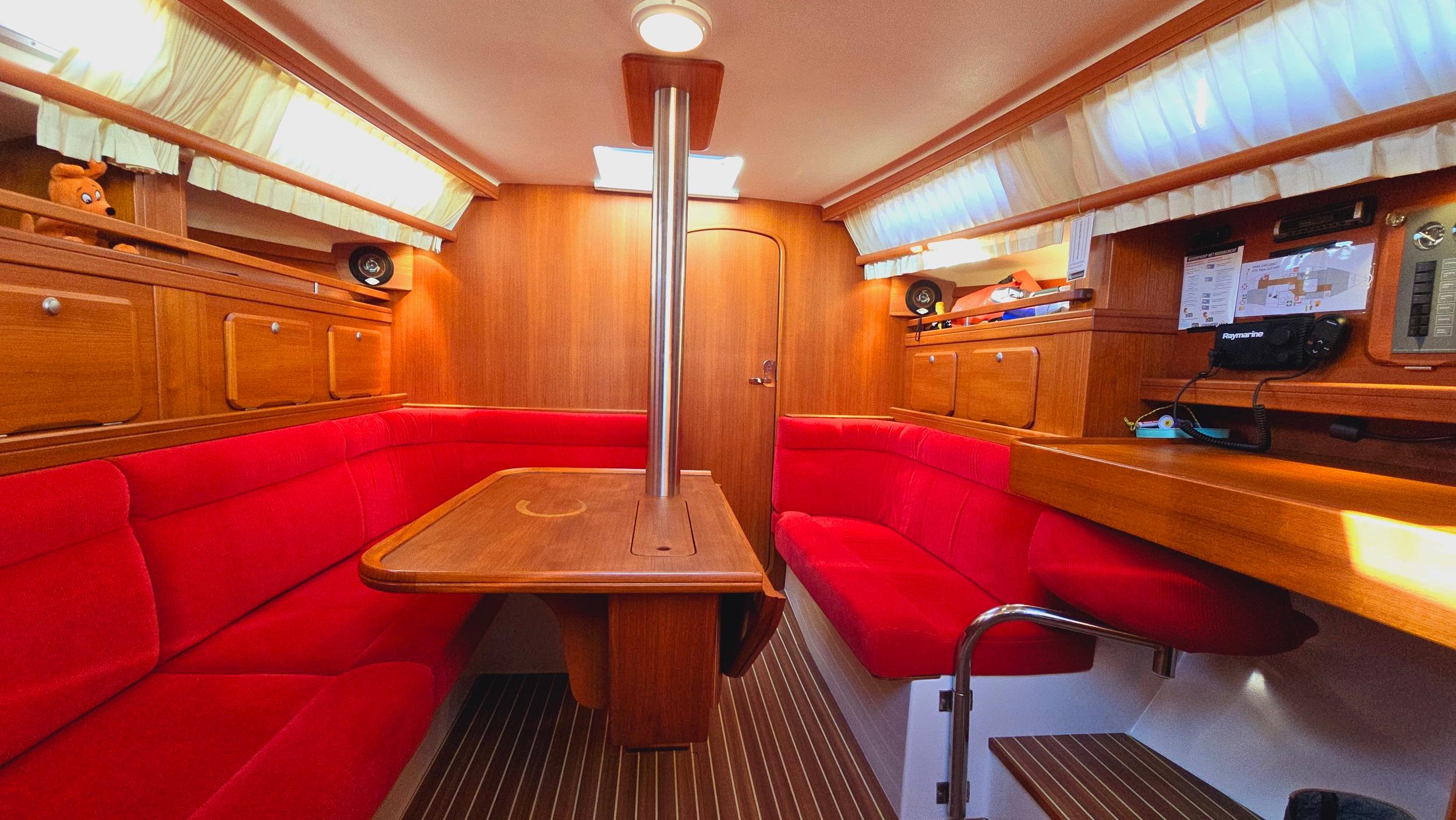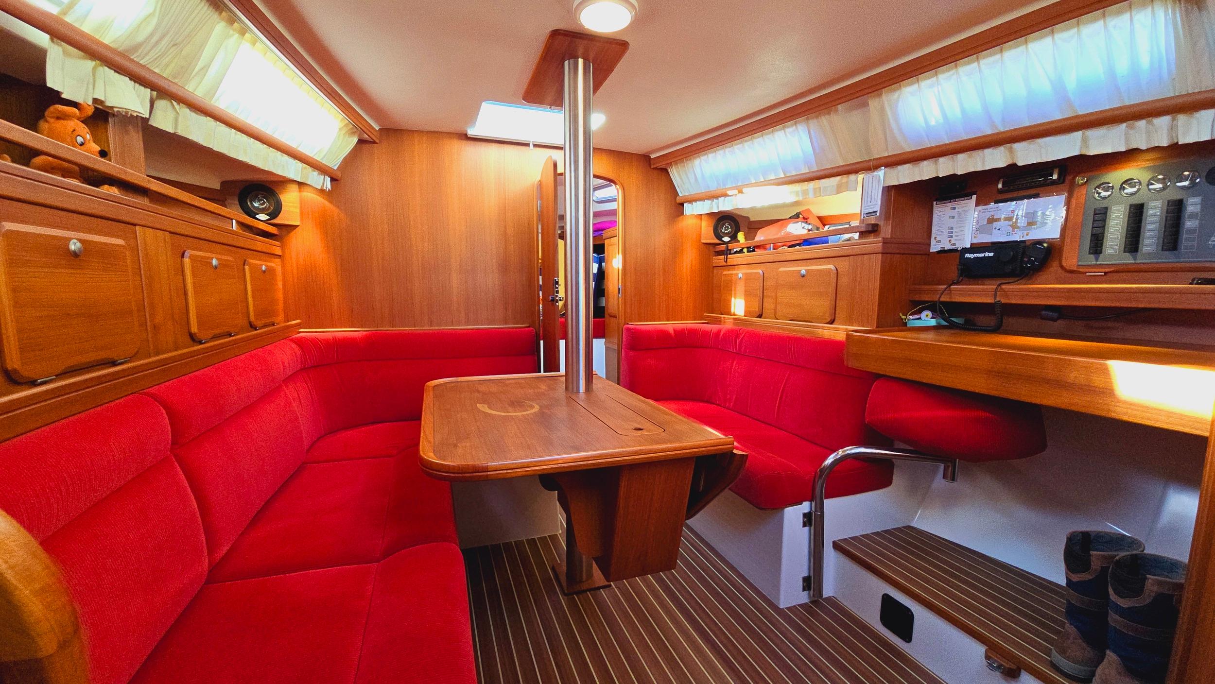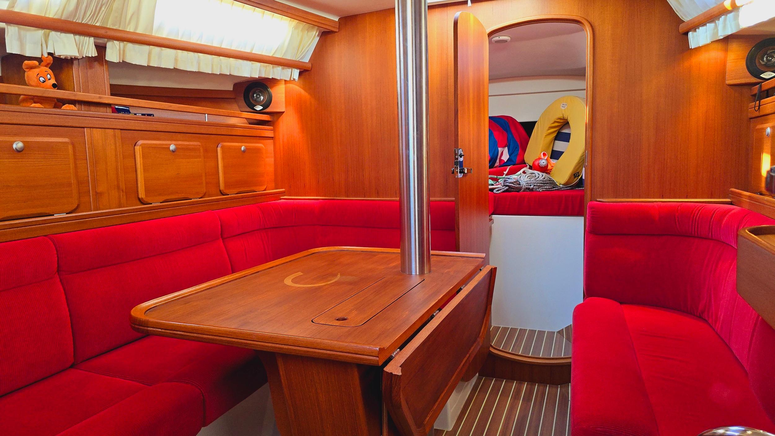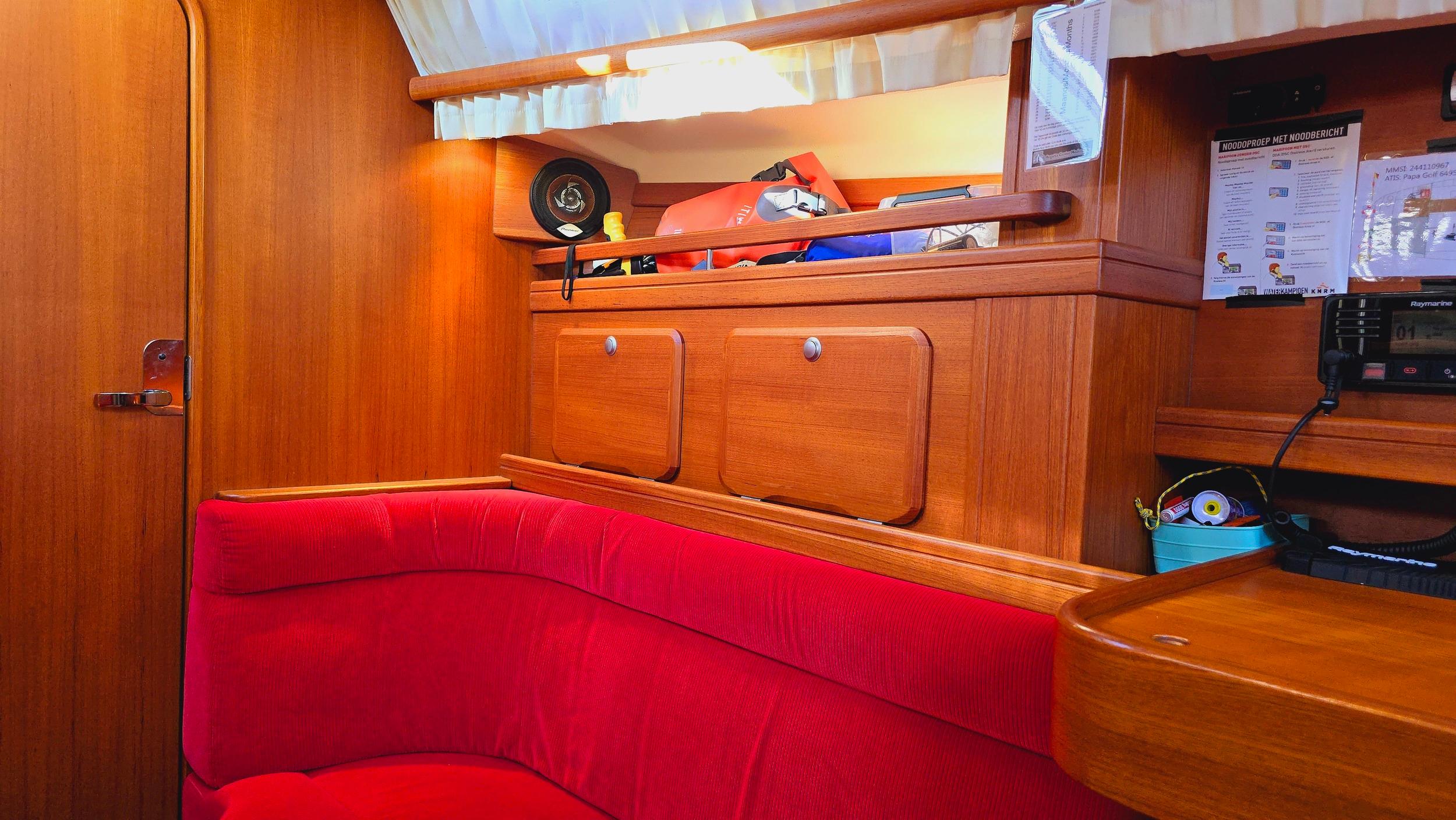 De saloon is ruim in opzet met aan stuurboord de navigatiehoek met zwenk-zit en diverse inbouw apparatuur en de gezellige rondzit om de wegklapbare tafel, achter de rugleuning zijn diverse kastruimtes, aan opbergmogelijkheden is aan boord de C-1040 geen gebrek!