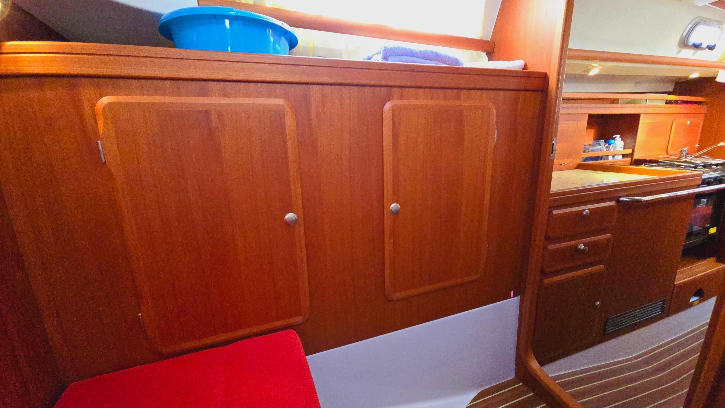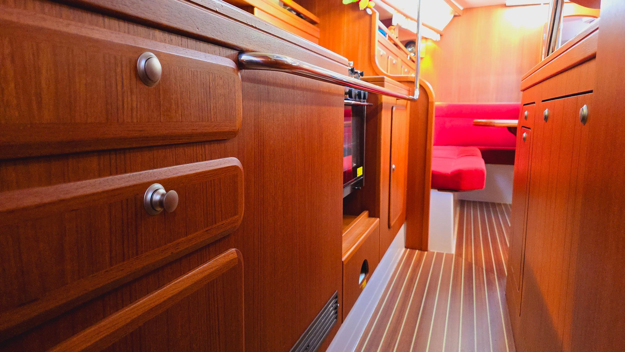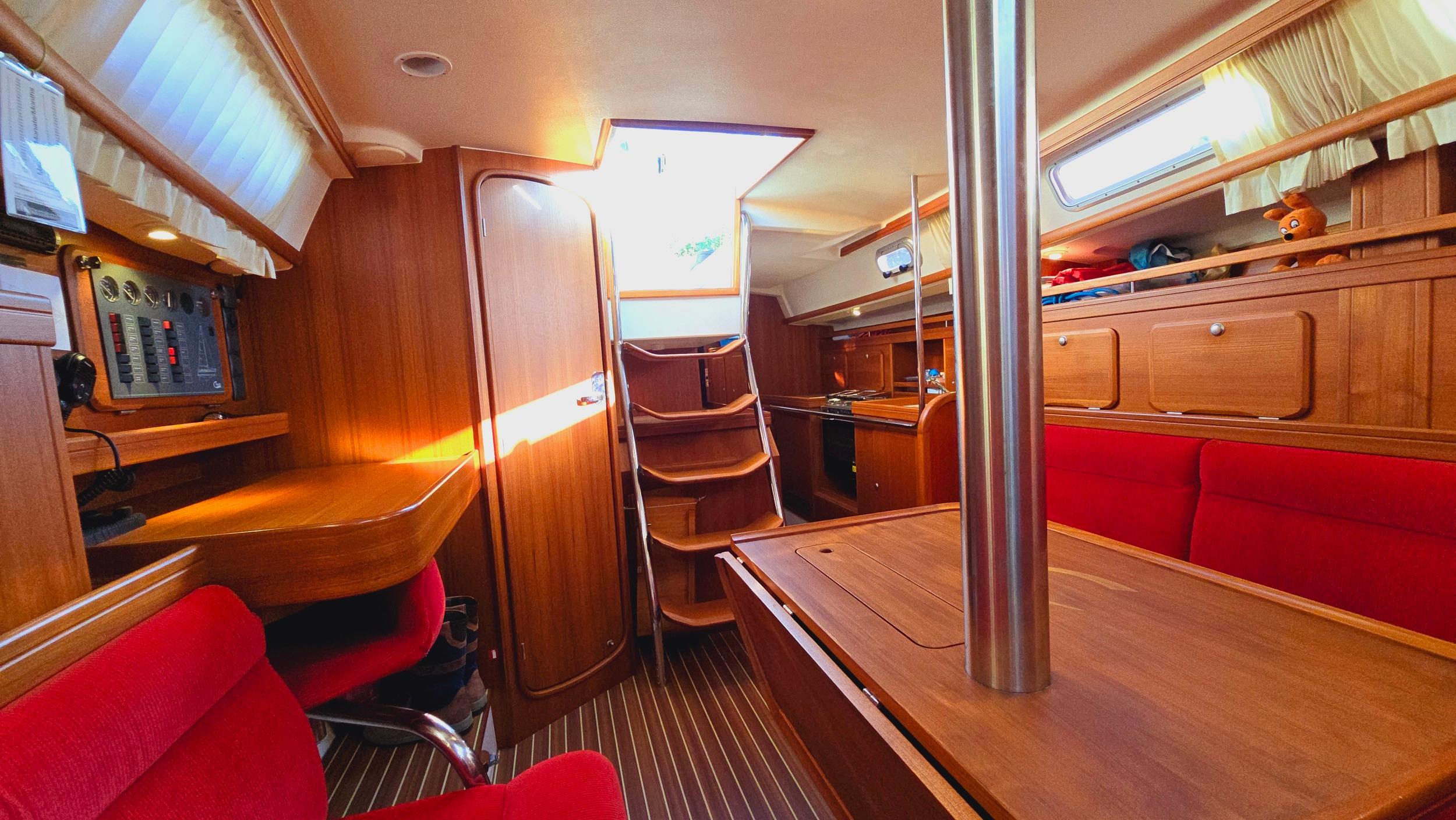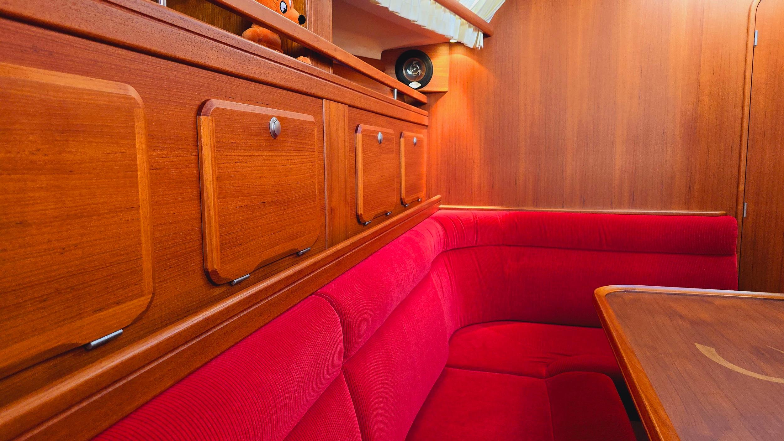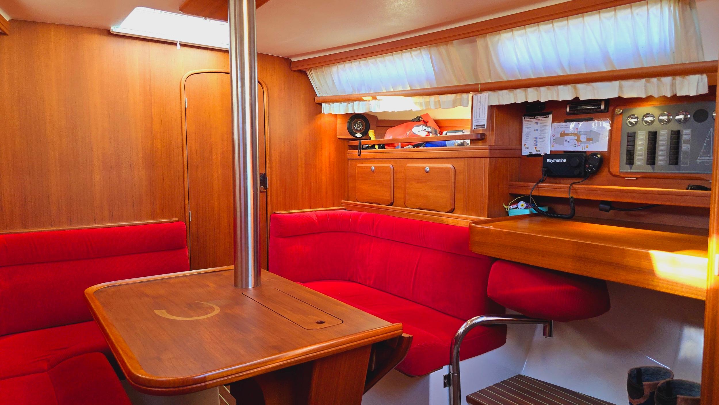 De saloon is ruim in opzet met aan stuurboord de navigatiehoek met zwenk-zit en diverse inbouw apparatuur en de gezellige rondzit om de wegklapbare tafel, achter de rugleuning zijn diverse kastruimtes, aan opbergmogelijkheden is aan boord de C-1040 geen gebrek!