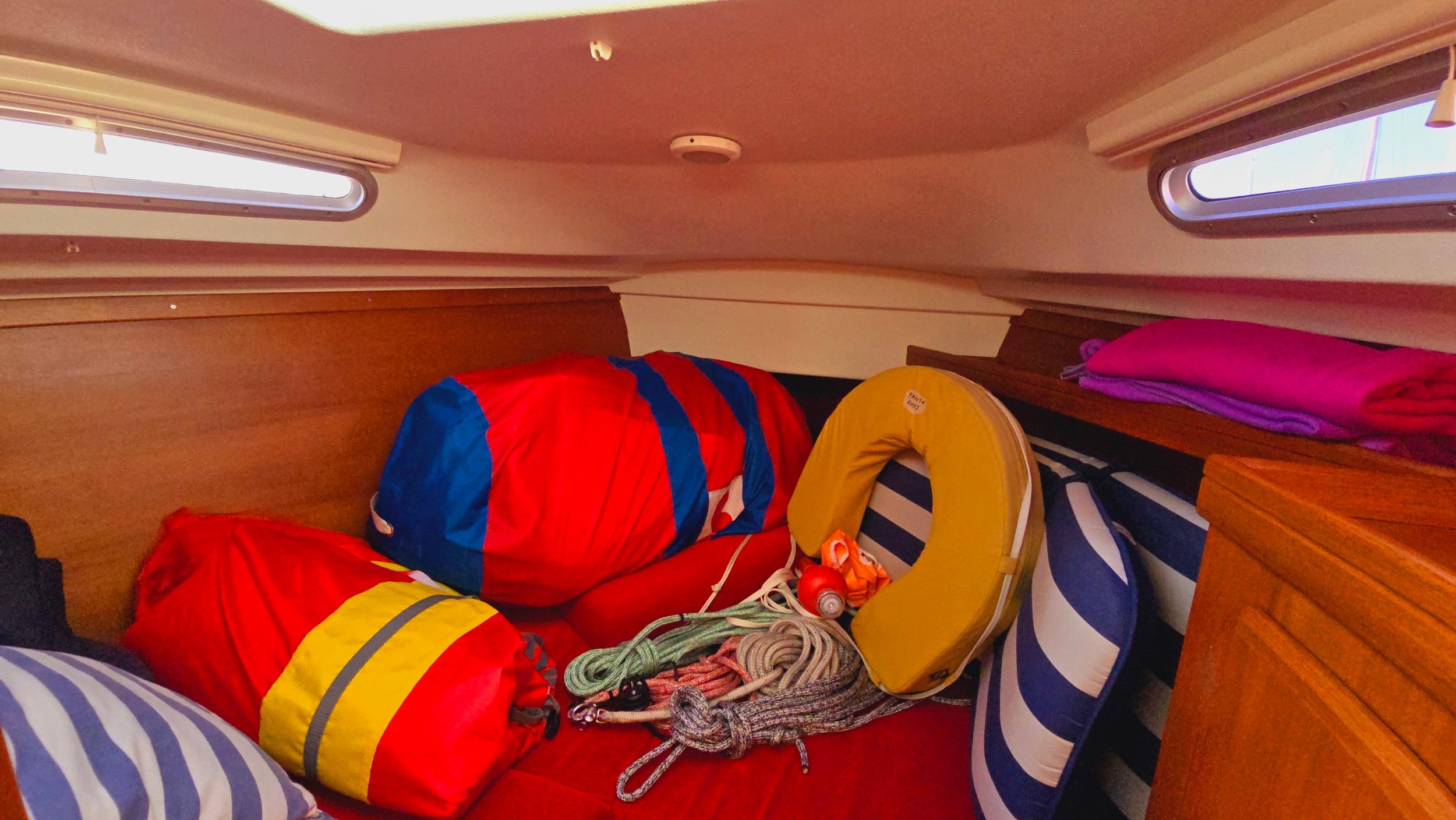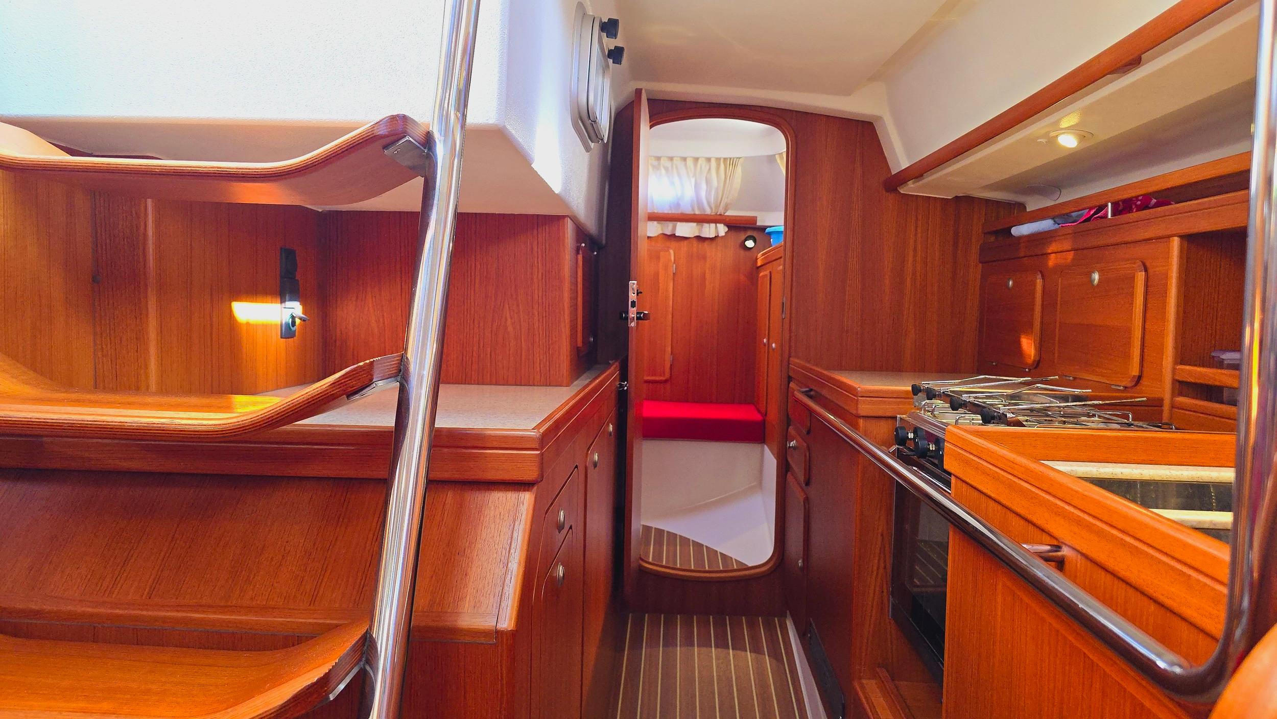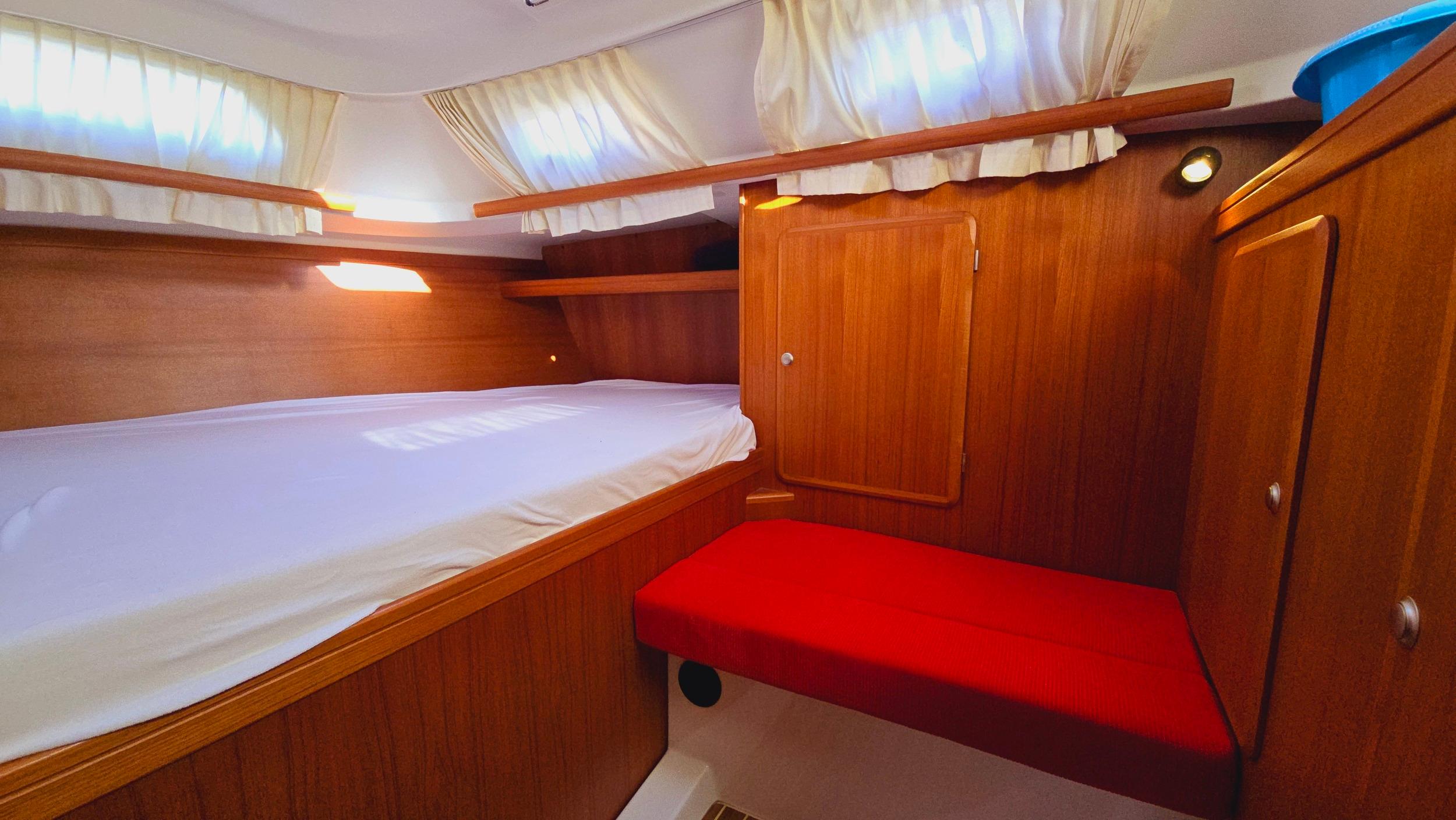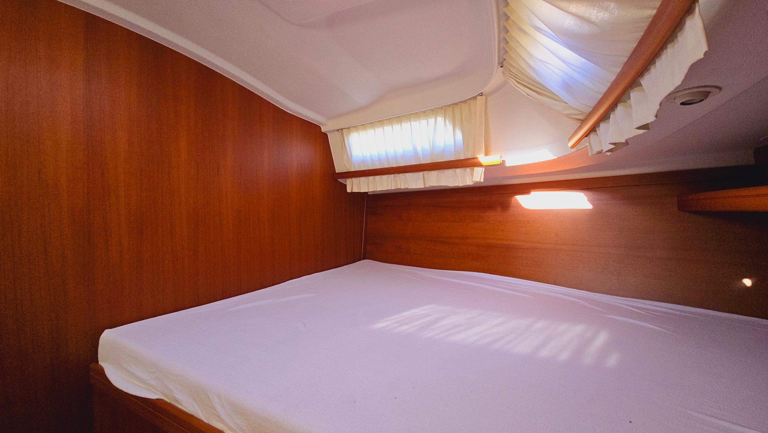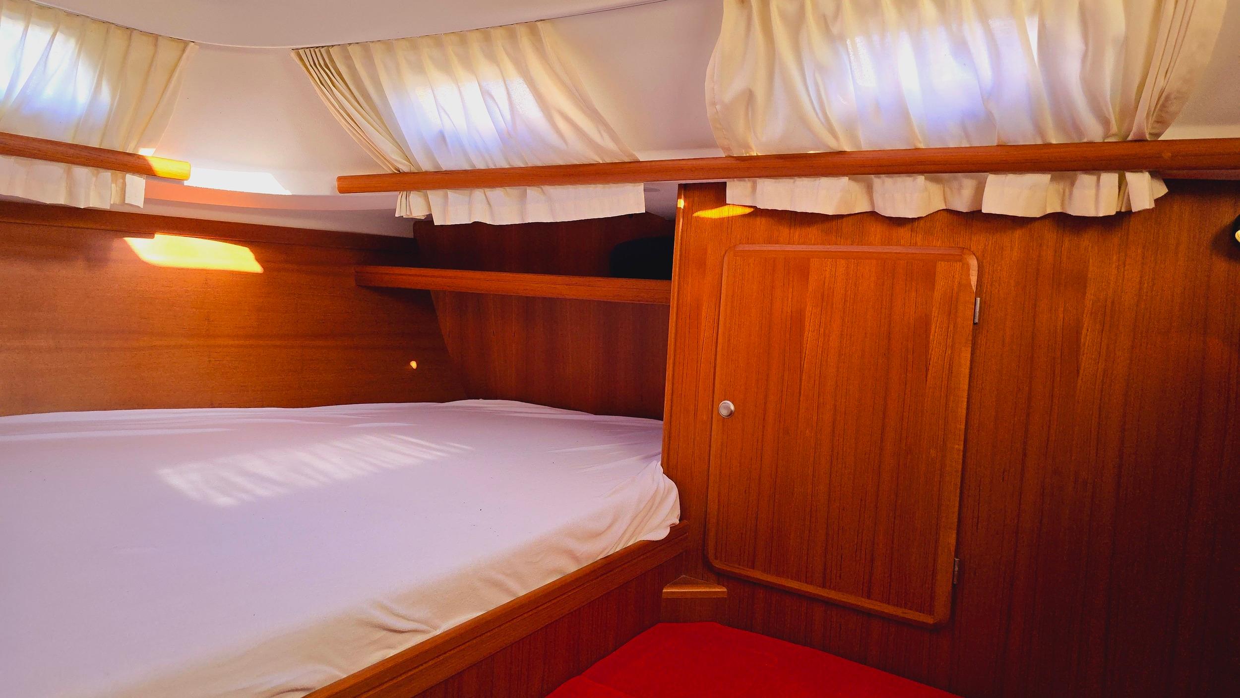 In de boeg een 2-pers V-bed met aan weerszijden kastruimten. In het achterschip aan stuurboord treffen we de natte cel aan van royaal formaat, tevens is hier een doorgang naar de diepe (forse) bakskist, dit maakt het erg prettig wanneer er spullen onderop liggen eenvoudig te bereiken. Aan bakboordzijde het langs-geplaatste kombuis met aan weerszijden kastruimte en cardanische 3-pits fornuis met oven. Middels het kombuis komen we in de eigenaars hut. Dit is een royale ruimte met een zit, diverse kastruimtes en dubbel persoons bed in de dwarsrichting.
