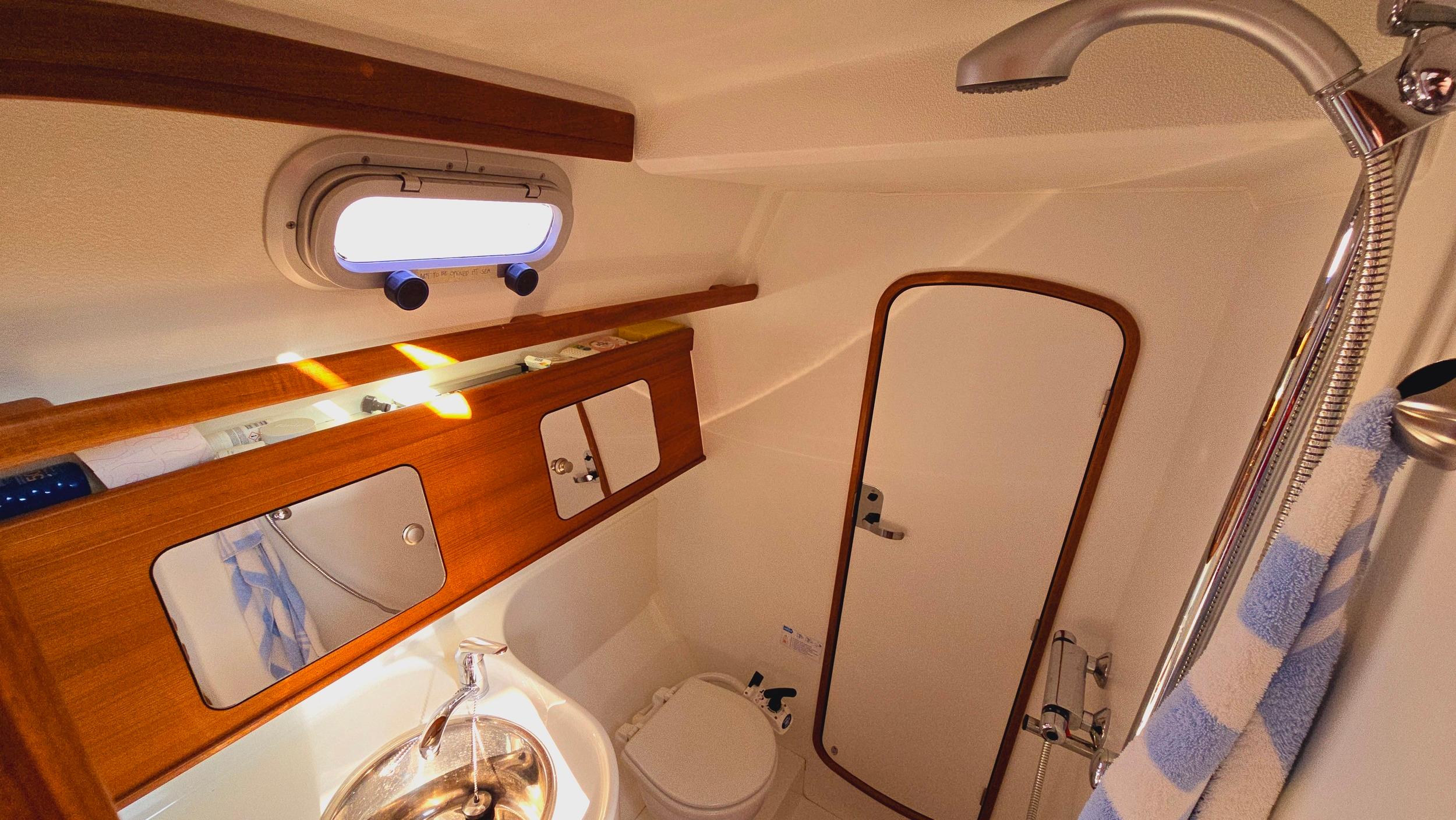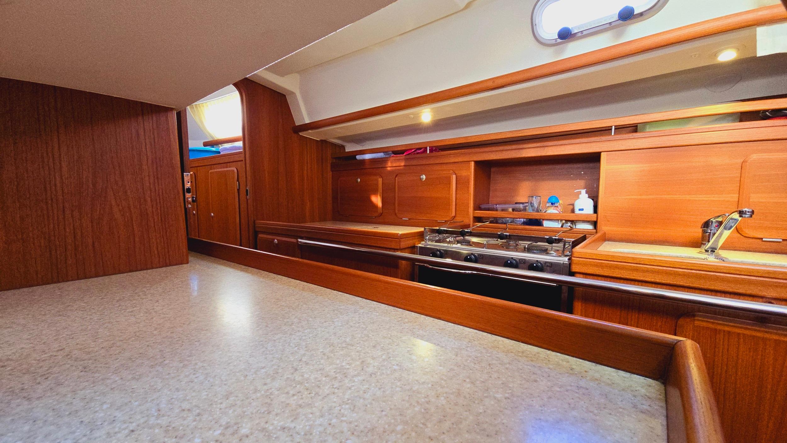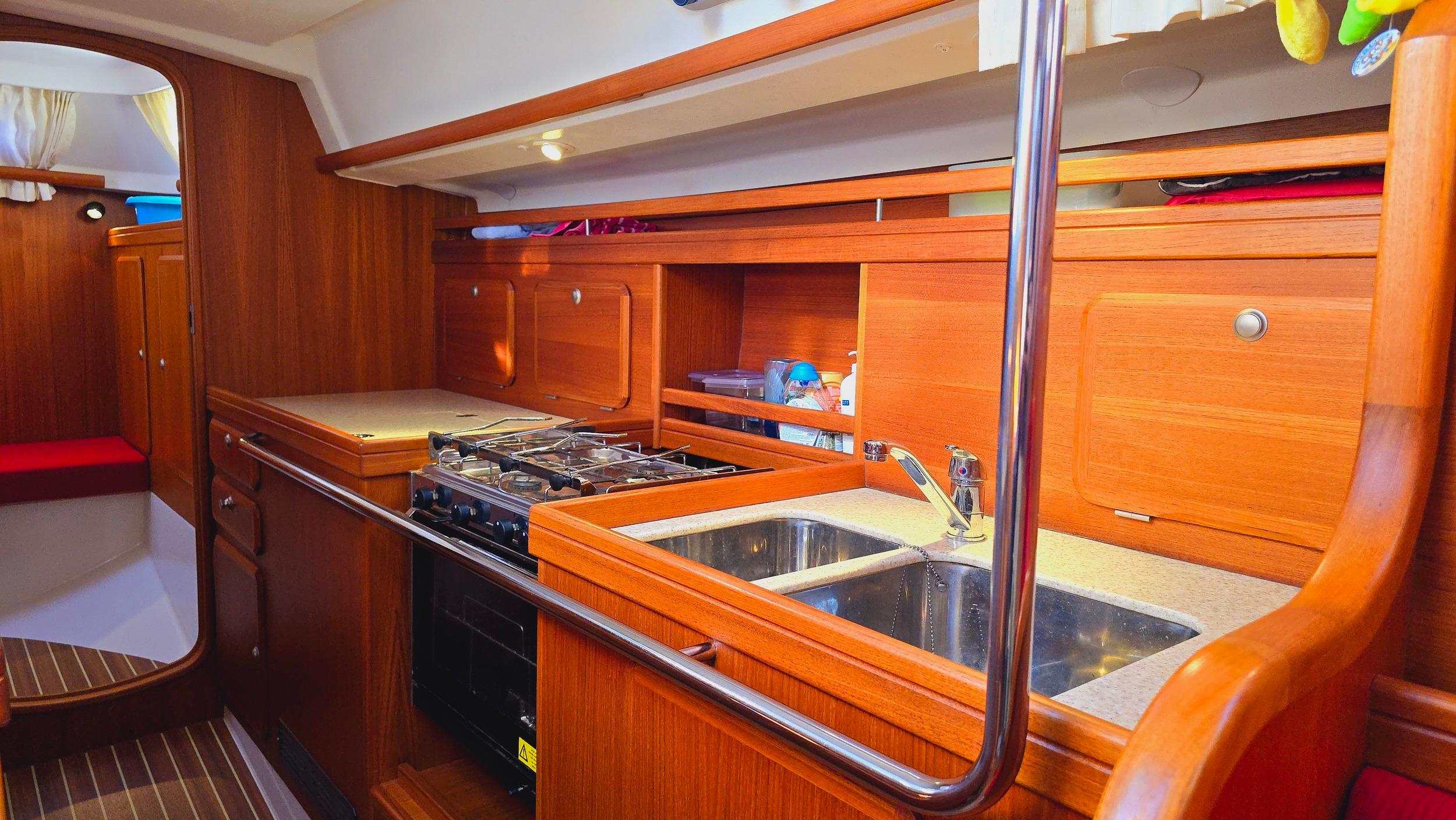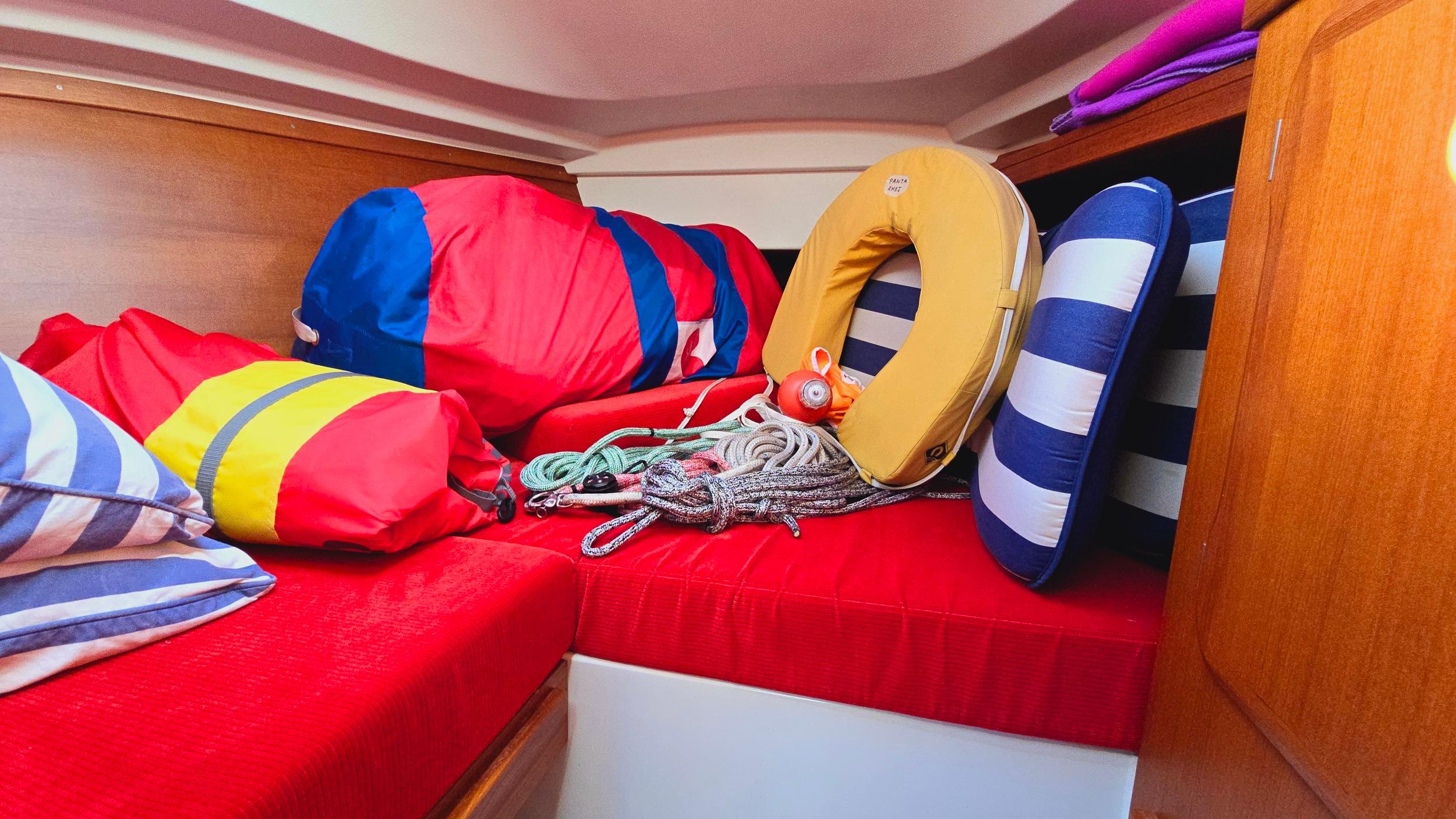 In de boeg een 2-pers V-bed met aan weerszijden kastruimten. In het achterschip aan stuurboord treffen we de natte cel aan van royaal formaat, tevens is hier een doorgang naar de diepe (forse) bakskist, dit maakt het erg prettig wanneer er spullen onderop liggen eenvoudig te bereiken. Aan bakboordzijde het langs-geplaatste kombuis met aan weerszijden kastruimte en cardanische 3-pits fornuis met oven. Middels het kombuis komen we in de eigenaars hut. Dit is een royale ruimte met een zit, diverse kastruimtes en dubbel persoons bed in de dwarsrichting.