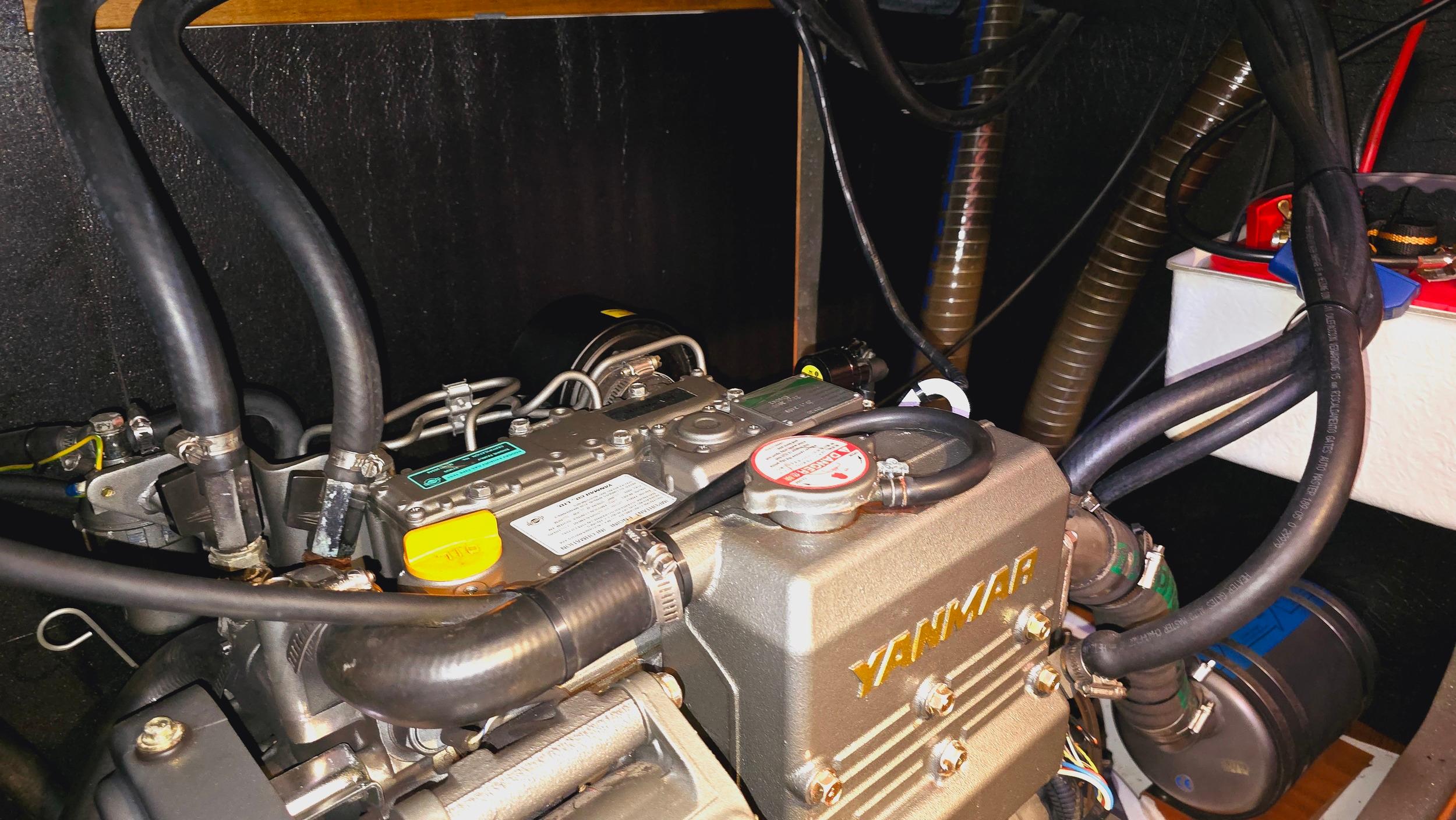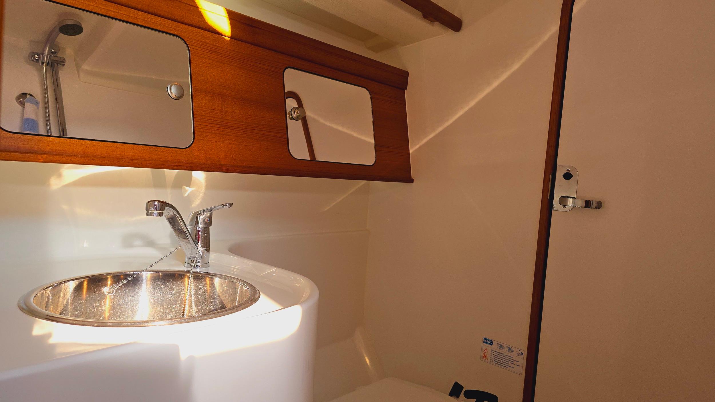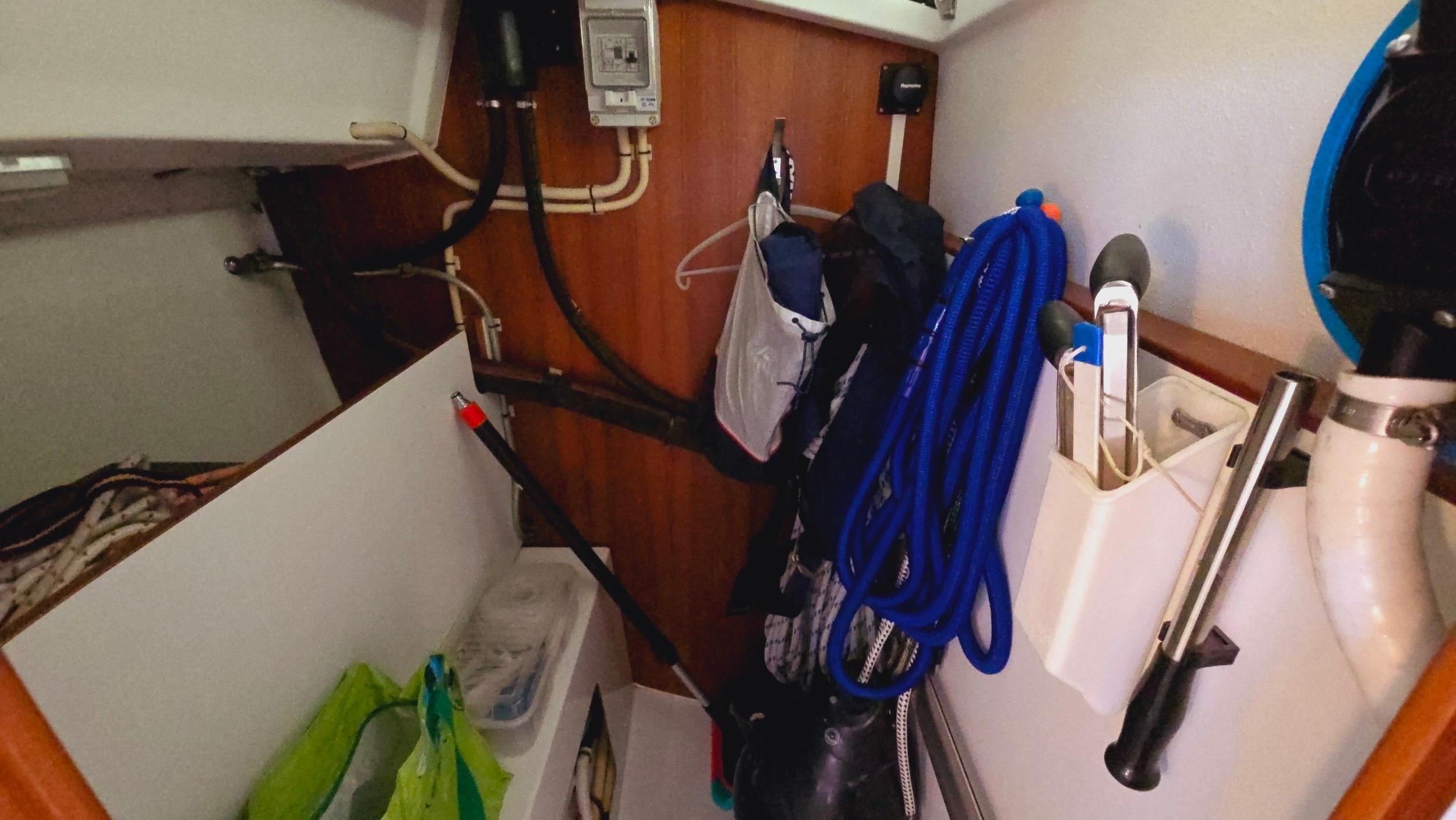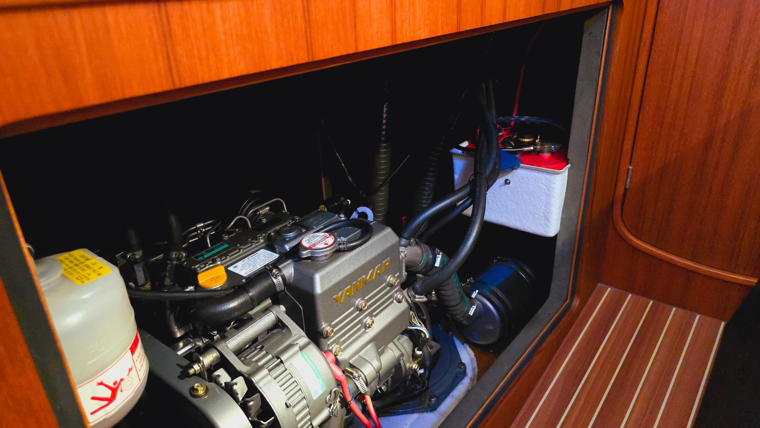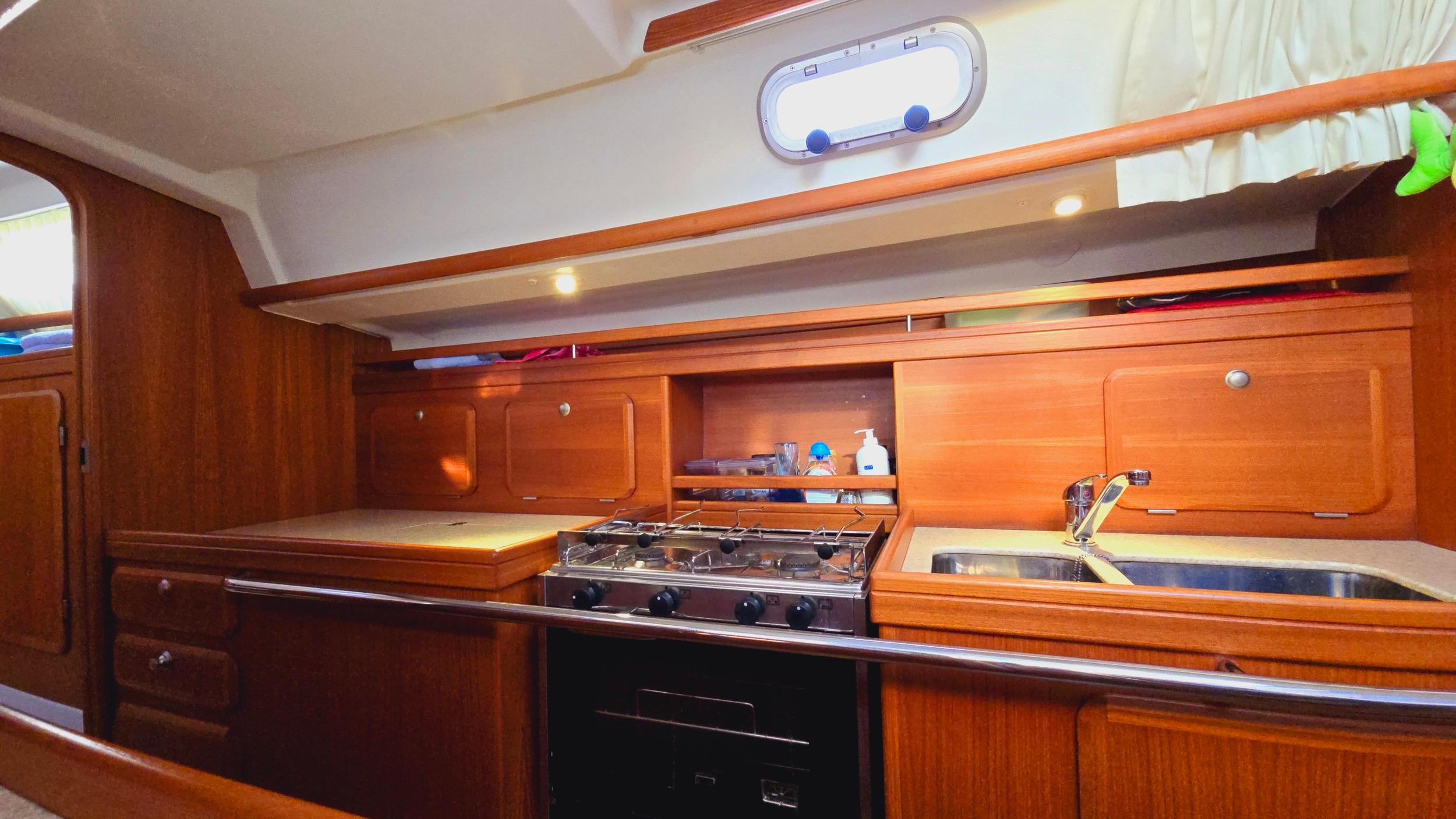 In de boeg een 2-pers V-bed met aan weerszijden kastruimten. In het achterschip aan stuurboord treffen we de natte cel aan van royaal formaat, tevens is hier een doorgang naar de diepe (forse) bakskist, dit maakt het erg prettig wanneer er spullen onderop liggen eenvoudig te bereiken. Aan bakboordzijde het langs-geplaatste kombuis met aan weerszijden kastruimte en cardanische 3-pits fornuis met oven. Middels het kombuis komen we in de eigenaars hut. Dit is een royale ruimte met een zit, diverse kastruimtes en dubbel persoons bed in de dwarsrichting.